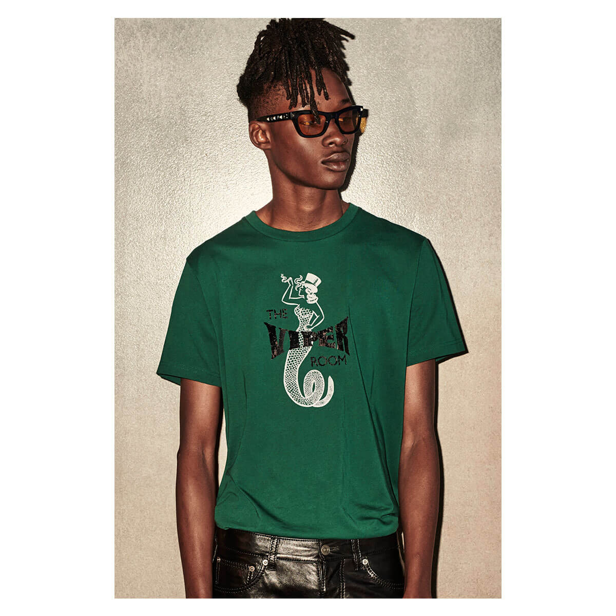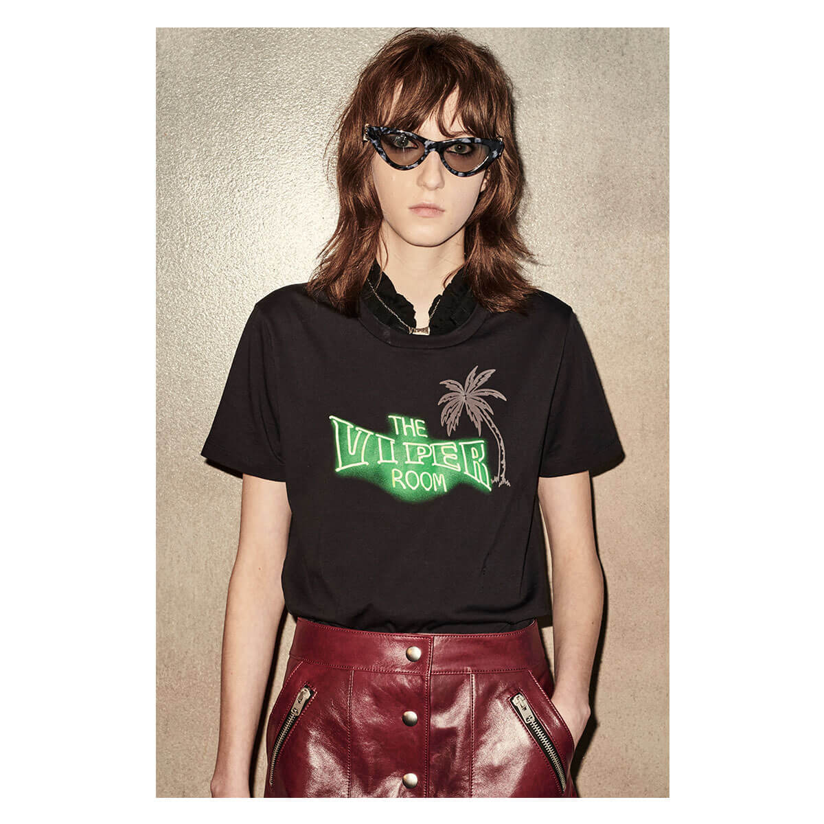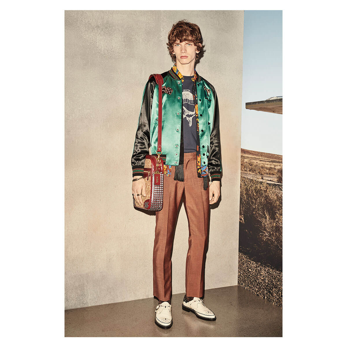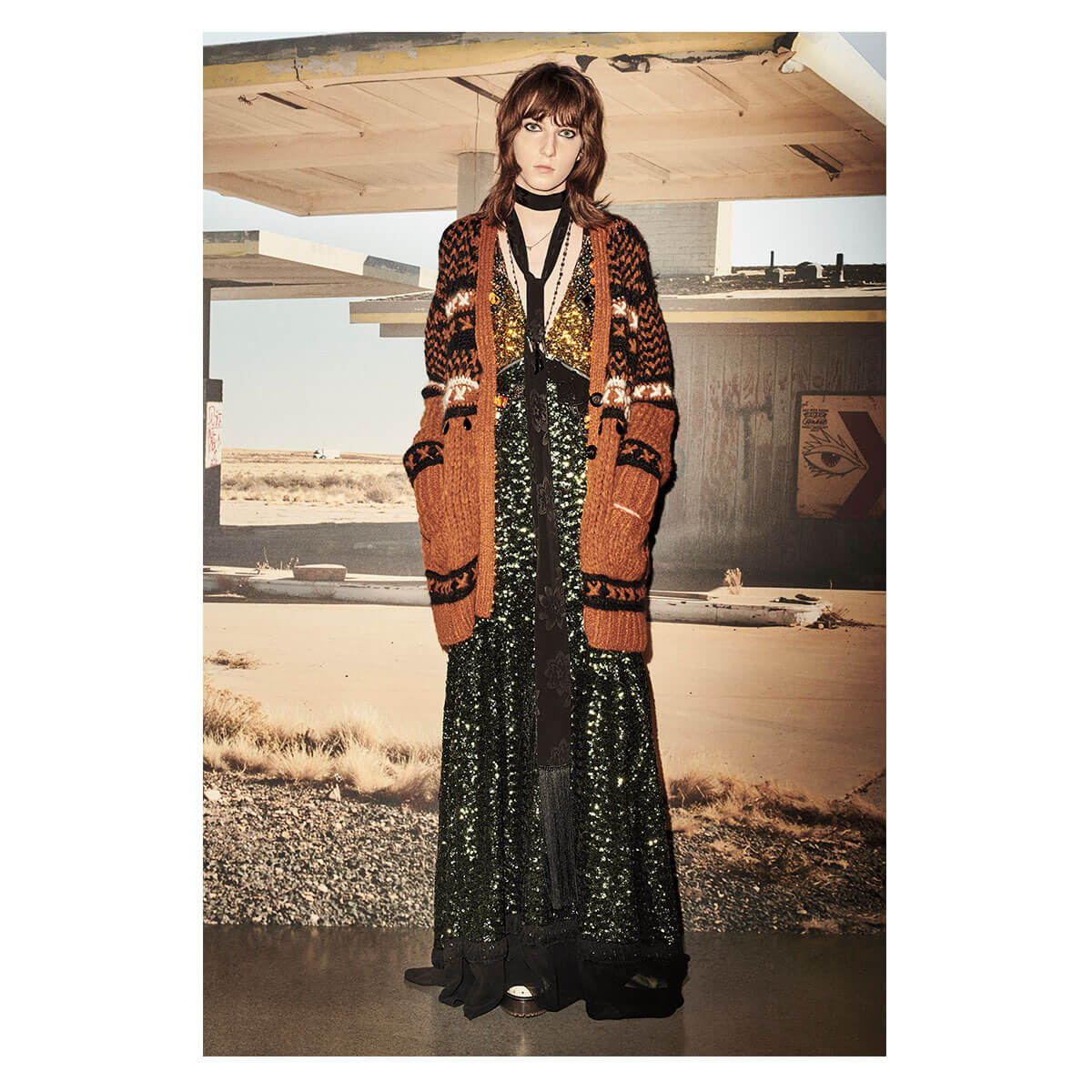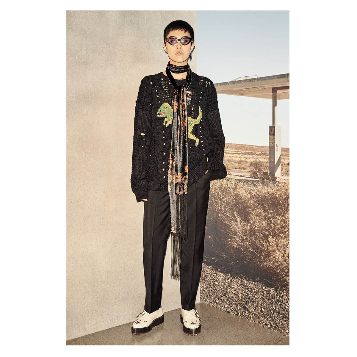Stuart Vevers’ Coach kids are in the mood for good music and good company, just like Johnny Depp was when he opened The Viper Room on the Sunset Strip in 1993. “I was looking for escape,” Depp said in 2000. Escape he did, the Viper Room became notorious after River Phoenix’s death there and was a place for illicit activity, strippers and great bands. Coach Pre-Spring 2019 is not of the stripping kind (although by all means, take it all of if you want to) but it is feeling all those ‘90s Viper Room vibes, the chosen place of inspiration for Vevers. The collection is layered in all that brown leather Vevers loves, Los Angeles palm trees knitted onto cardigans and patchwork shearling. These are the kind of clothes we would wear to the more PG rated Viper Room. It’s a collection for rockstars, shiny red leather fringing, layered florals under palm tree pyramid studded denim jackets and smart shouldered jackets paired with an ever so slightly flared jean. Long fringed scarves trail down the body amongst loose suiting and Viper Room logo’d t-shirts. Modern merch. For the East Coast-ers going West. The sounds Stuart is envisioning are those of Nick Cave and Marilyn Manson. Goth goes rock god. Turn it all the way up. It’s all happening on the West Coast.