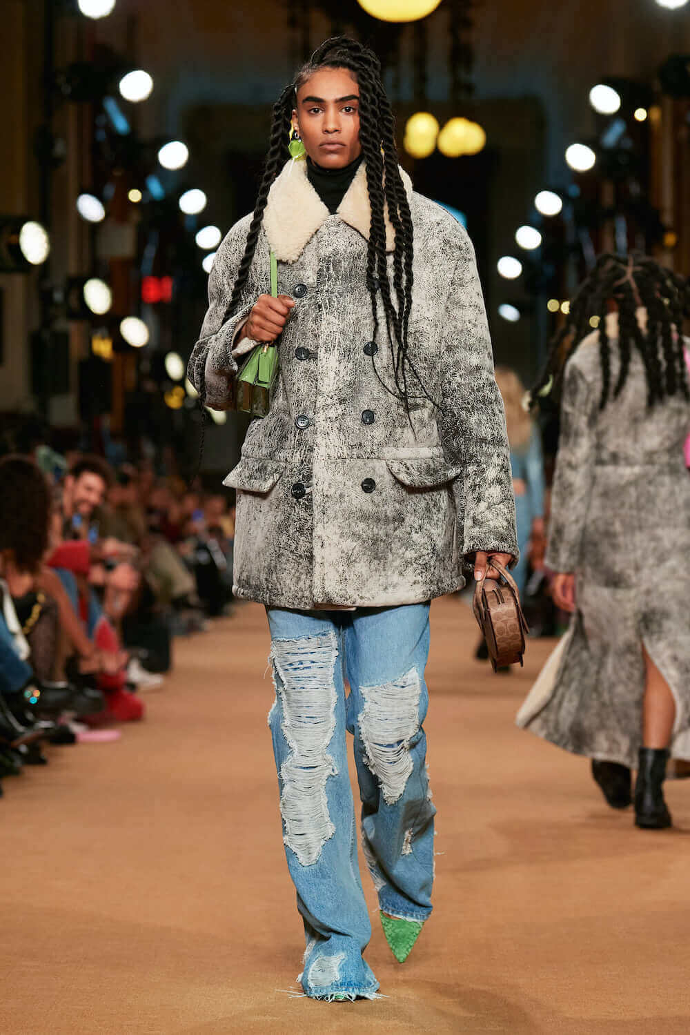 Elsewhere, shearling standouts included fluffy collard pea-coats fashioned from cracked leather and teddy coats frosted with crystals. There were also knitted roll neck dresses which came stamped with dinosaurs, Mickey Mouse and an apple etched with New York’s initials – all made using recycled wool. Slightly dishevelled in their appearance, they looked weathered from years of wear. Such pieces will undoubtedly be well-loved by Coach customers globally.