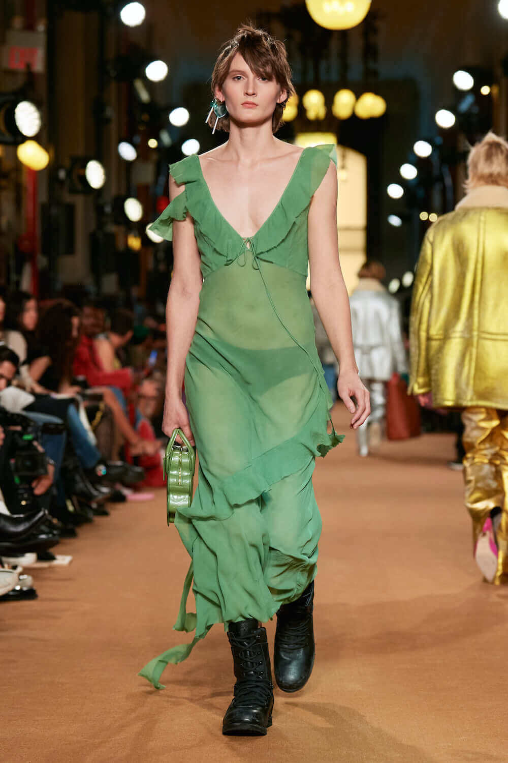 Take the excellent leather pieces, including lean trench coats and low-slung pencil skirts paired with stomper boots, which were made using discarded scraps. Or a procession of wispy, frilled silk slip dresses, particularly terrific in mint green and lavender, which came part of Coach’s (Re)Loved program, which reimagines the end-of-life for pre-loved Coach pieces.