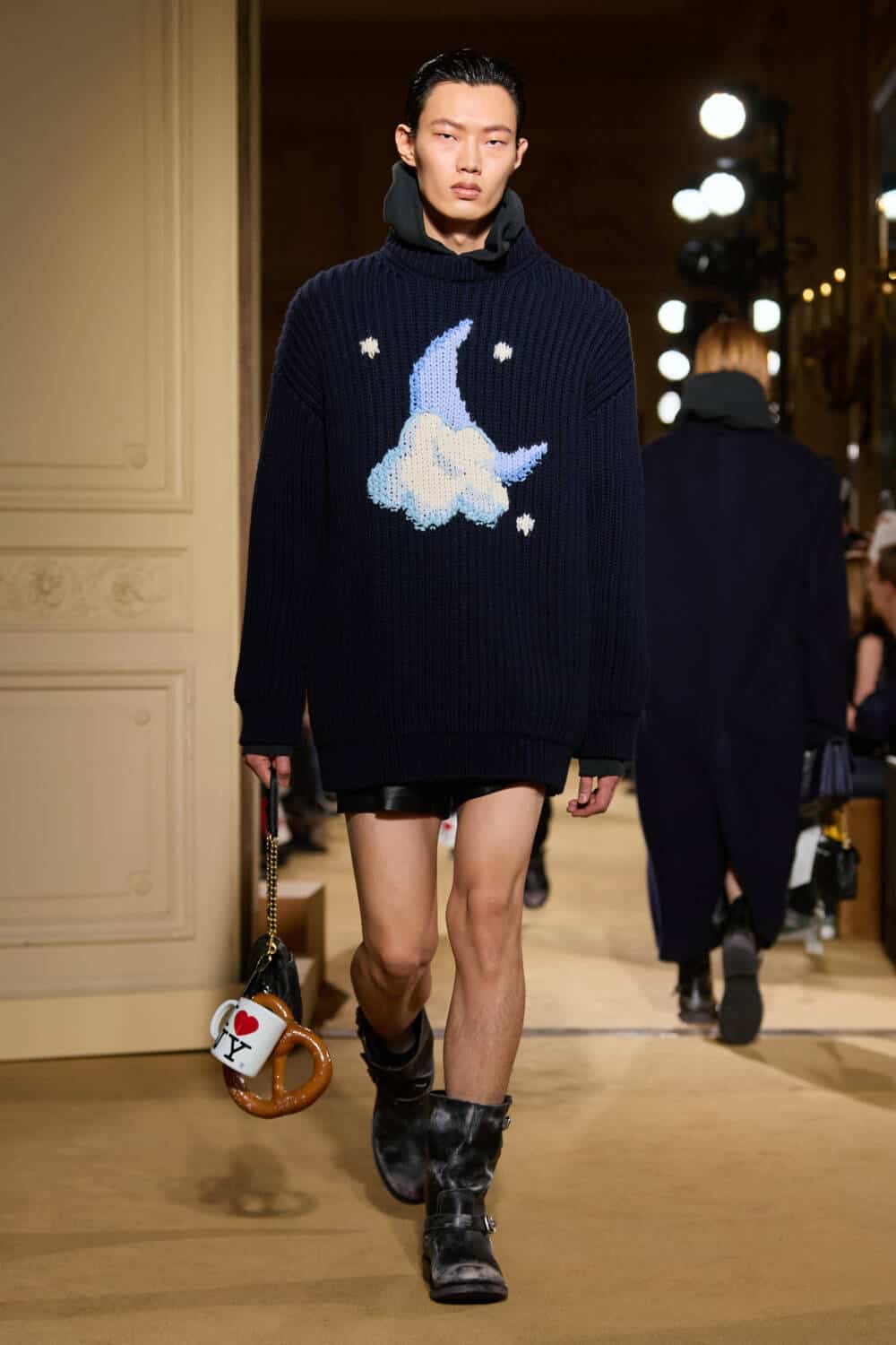 How that translated was in the form of formal garments like tuxedo jackets and taffeta ball gowns getting a second (cooler) life. Worn denim and lived-in leather also made an appearance as well in the form of relaxed jeans and oversized trenches. There was plenty of whimsy, with a series of oversized bows adorning camisoles and skirts as well as giant plastic bow barrettes clipped into slicked back hair. Cheeky knits, including a sweater adorned with a rubber ducky added to the sense that Vevers definitely isn’t taking any of this too seriously and neither should we. But the real winner? The little tchotchkes that were clipped onto every bag whether it was a giant red apple, pretzel, Yankee cap, Statue of Liberty, or an ‘I Heart New York’ mug, reminding us that no matter how jaded New Yorkers may appear, we still love our city more than ever.