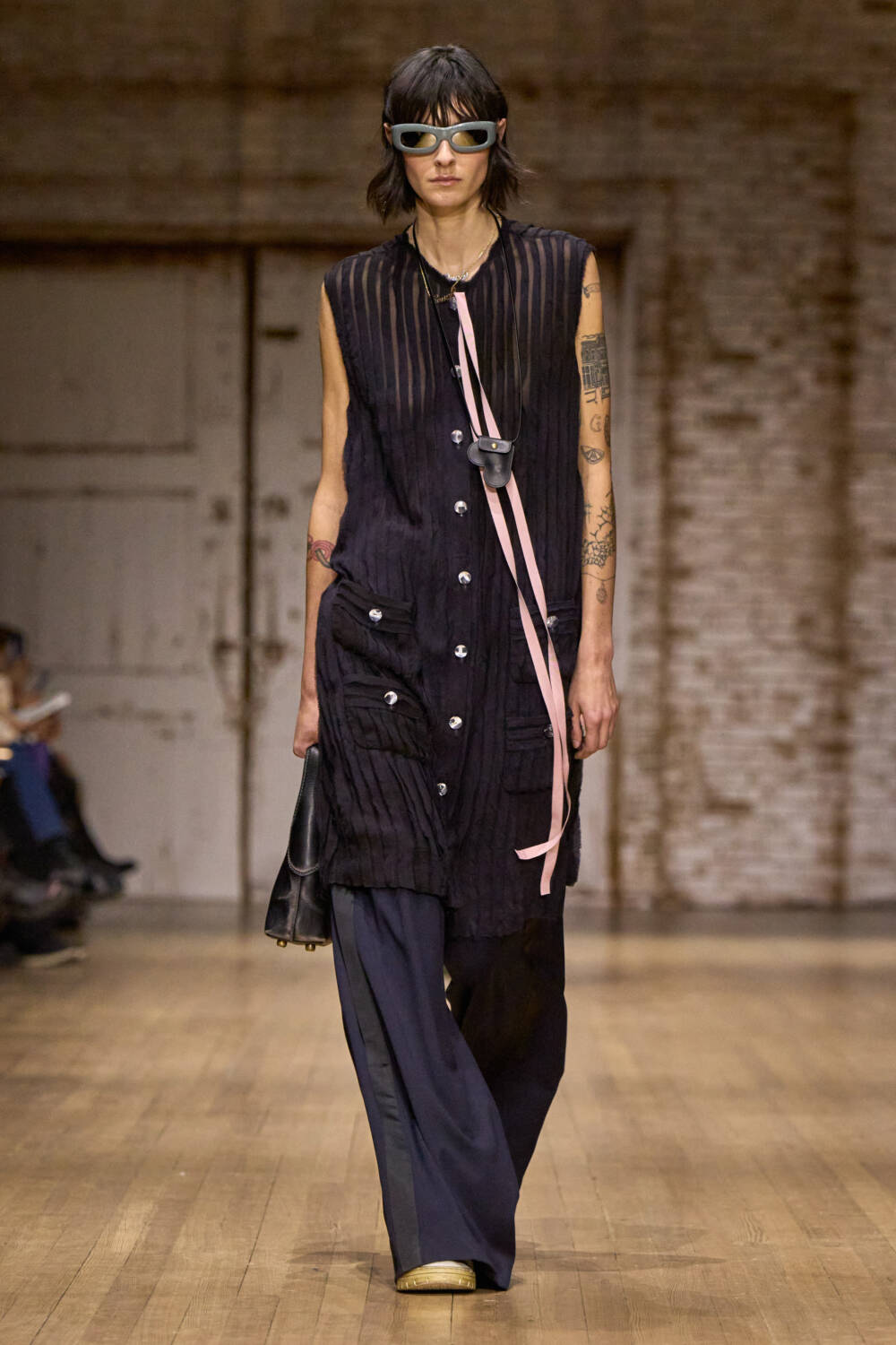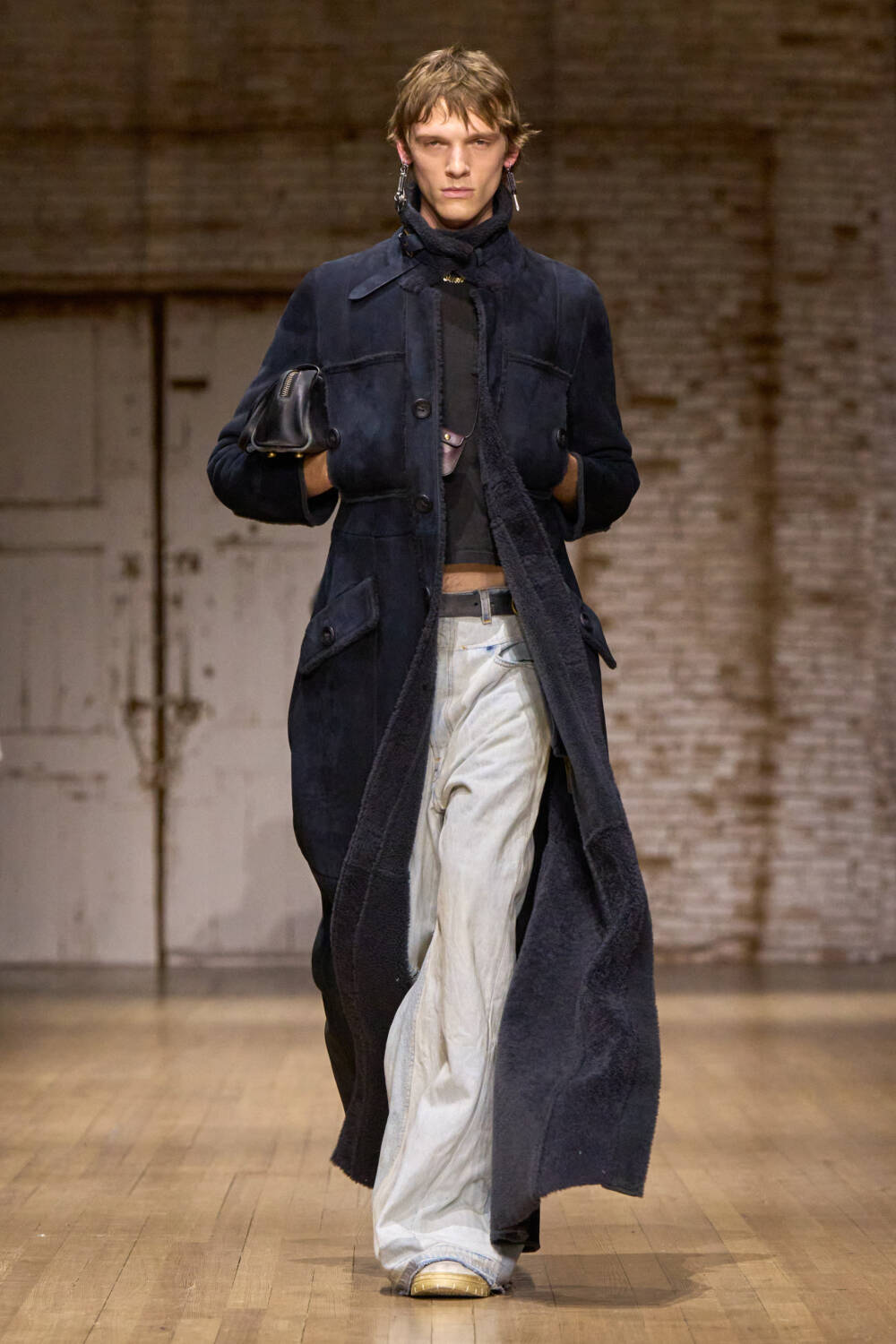 If you grew up during the ’90s and early Aughts in New York City, a few things are certain: you thrifted at the likes of Antique Boutique or Canal Jean Company and you spent time checking out the skateboarders at Brooklyn Banks. And while Coach’s Stuart Vevers may not have done either, it certainly felt like that moment was brought back to life at the brand’s fall 2025 show. Set at the Park Armory, the expansive hall was sectioned off via printed fabric to create an intimate setting. The show notes say the intention was to create an industrial space but it also brought to mind Brooklyn Bridge’s signature arches and bricks. Coach is always classic New York, even when it’s not overtly so. Even the music was true to the city, with Brooklyn-based indie band Nation of Language serving as the live soundtrack for the show.