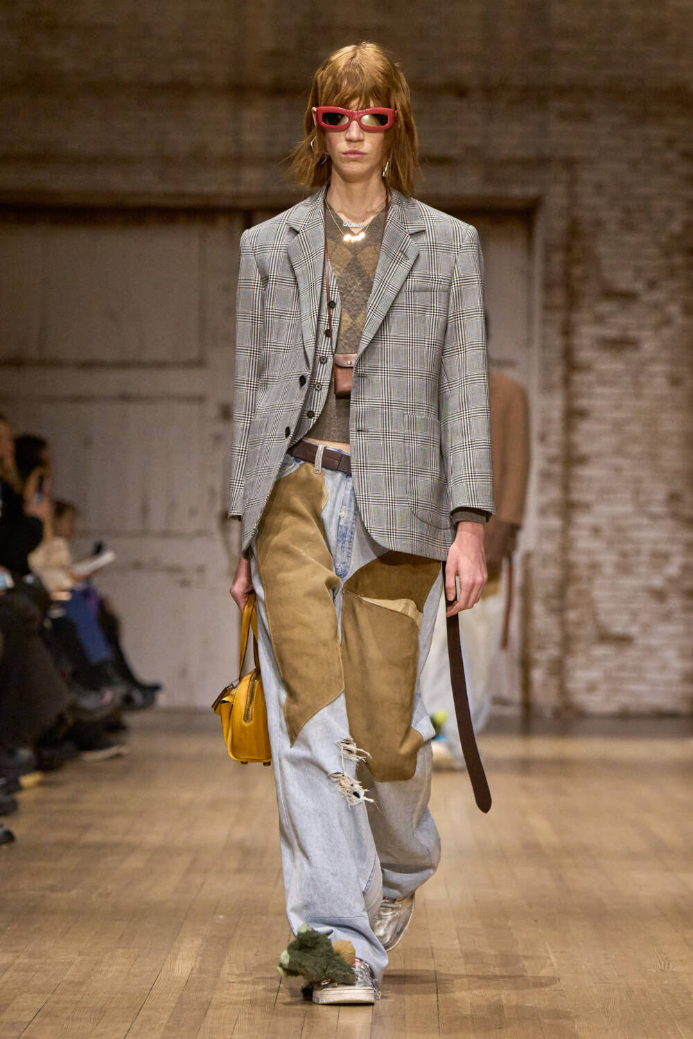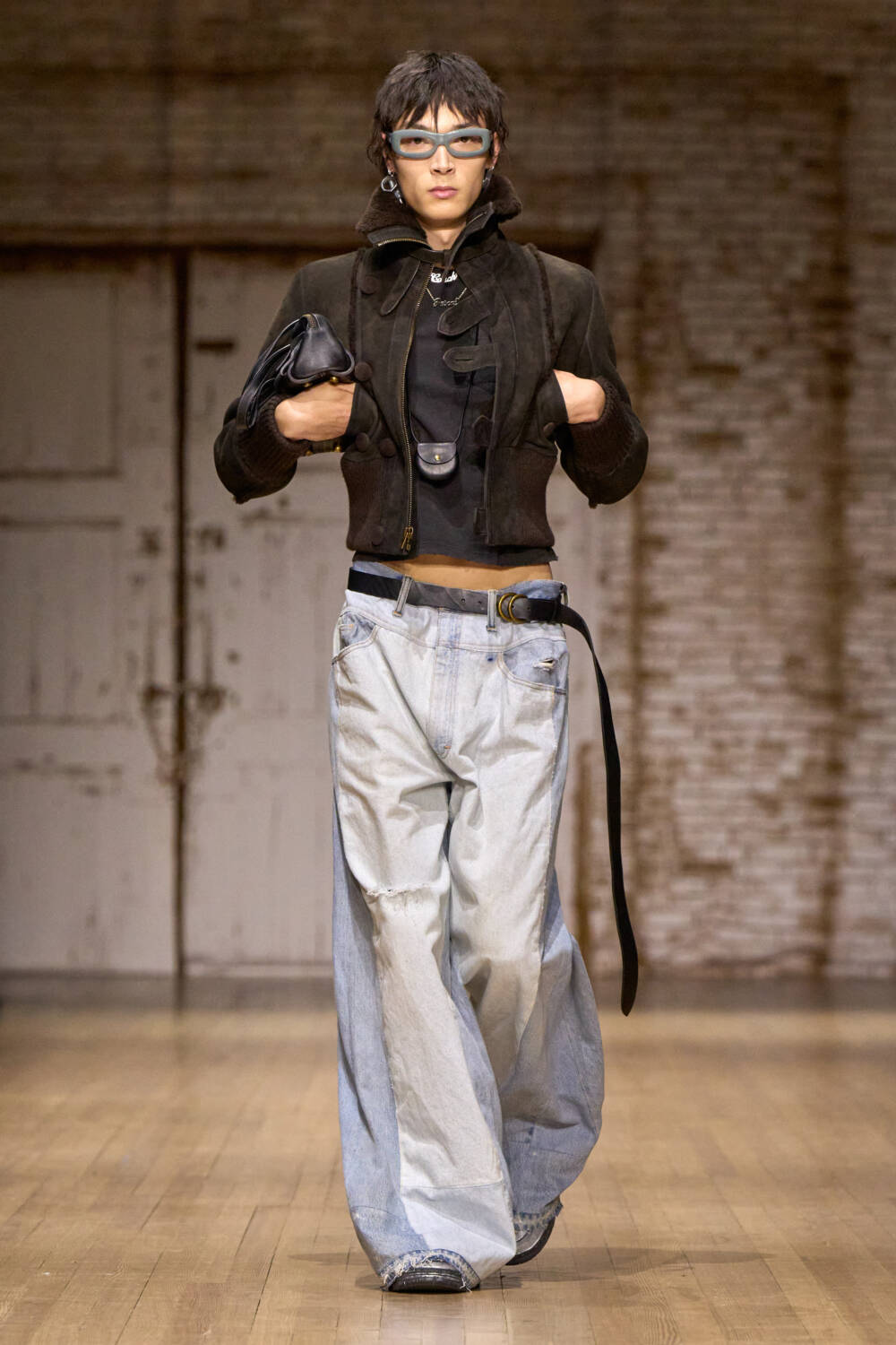 To execute said vision, Vevers and his team sent out upcycled outerwear whether it was cropped bomber jackets, trenches in leather and shearling, peacoats, and even a faux fur leopard number. In a very nineties-era thrifting move, they also turned vintage negligees and beaded gowns into a series of dresses. Even the denim was made from existing pieces, as second hand jeans were transformed into baggy pants that instantly brought to mind the skaters who would illegally grind the rails at the Banks. It was nostalgic but still fresh courtesy of the bits of argyle and lurex knits as well as the shrunken tees added to the mix.