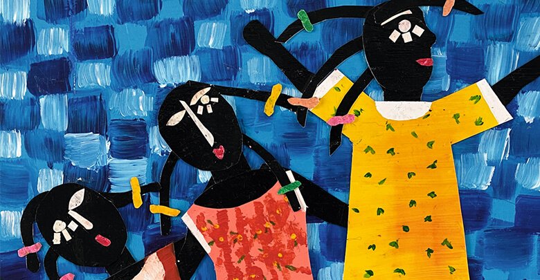Whether it’s a young girl’s uninhibited dancing or a collage of beauty products, empty beer cans, snacks and ephemera, Maddox’s work triggers memory and emotions – sometimes joyful, sometimes darker. “These are topics that I visit throughout my work,” she explains. “Sometimes it’s not like a specific place or thing but a feeling that I’m trying to express.” Her approach is instinctive. She doesn’t sketch, instead preferring to remember shapes. Her mind, she says, works like a movie. “That’s how memory is to me. It’s like a movie and I can run it back. If you’re looking at a body and remembering the movement of that body, then I remember the shape.” This way of abstracting reality has allowed her to develop her own symbolic language. In one painting, angels fly underneath a blue and white chequerboard quilt which she says represents the sky. “I love to do a woven landscape. I like my landscape to look like a quilt in a lot of my paintings. It reminds me of a family quilt I received, and to me the chequerboard pattern represents the duality in a situation, the good and the bad.”