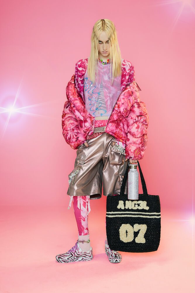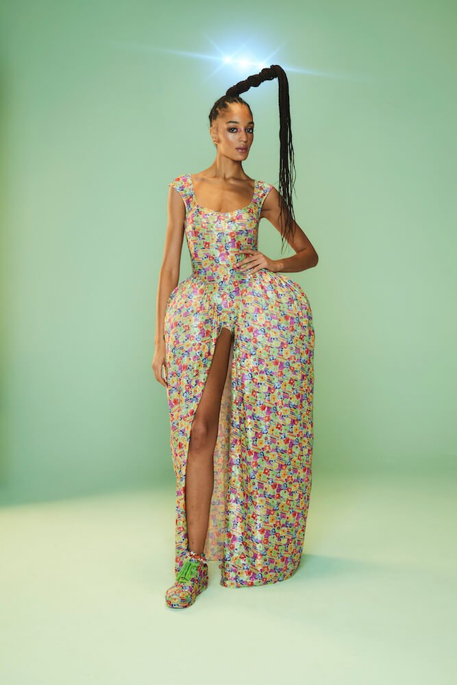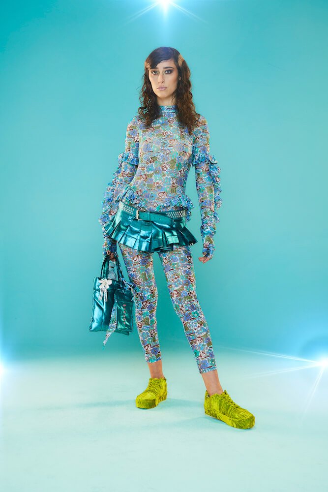 The clothes reflect this tree-hugging community utopia. There are flashy colours, shiny and velvet textures, and graphics inspired by 1970s psychedelic rock. Models, including brand muses Aaron Philips and Jazzelle Zanaughtti, come clad in a gaudy mix of Y2K cargo pants, micro-mini skirts worn over bonkers catsuits (Ashley Tisdale, eat your heart out) and zig-zagged jumpsuits with bulbous legs in cartoonish proportions.
