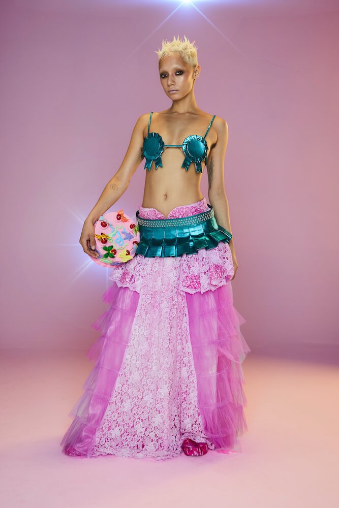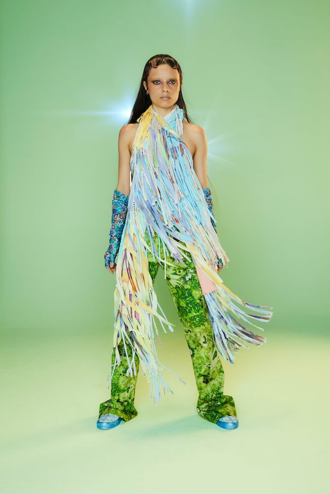 This realm of joy and colour has reached everyday items, too. In an accompanying lookbook, models hold encrusted reusable cups, while harness buckles hang from neon belts. The layer of sarcasm present in video doesn’t mean that the sustainable ideas of Collina Strada are any less actual. The designer has long been an avid user of deadstock fabrics, and textiles made from rose bushes and stems. This is a designer crusading against climate change, one reality TV gag at a time.