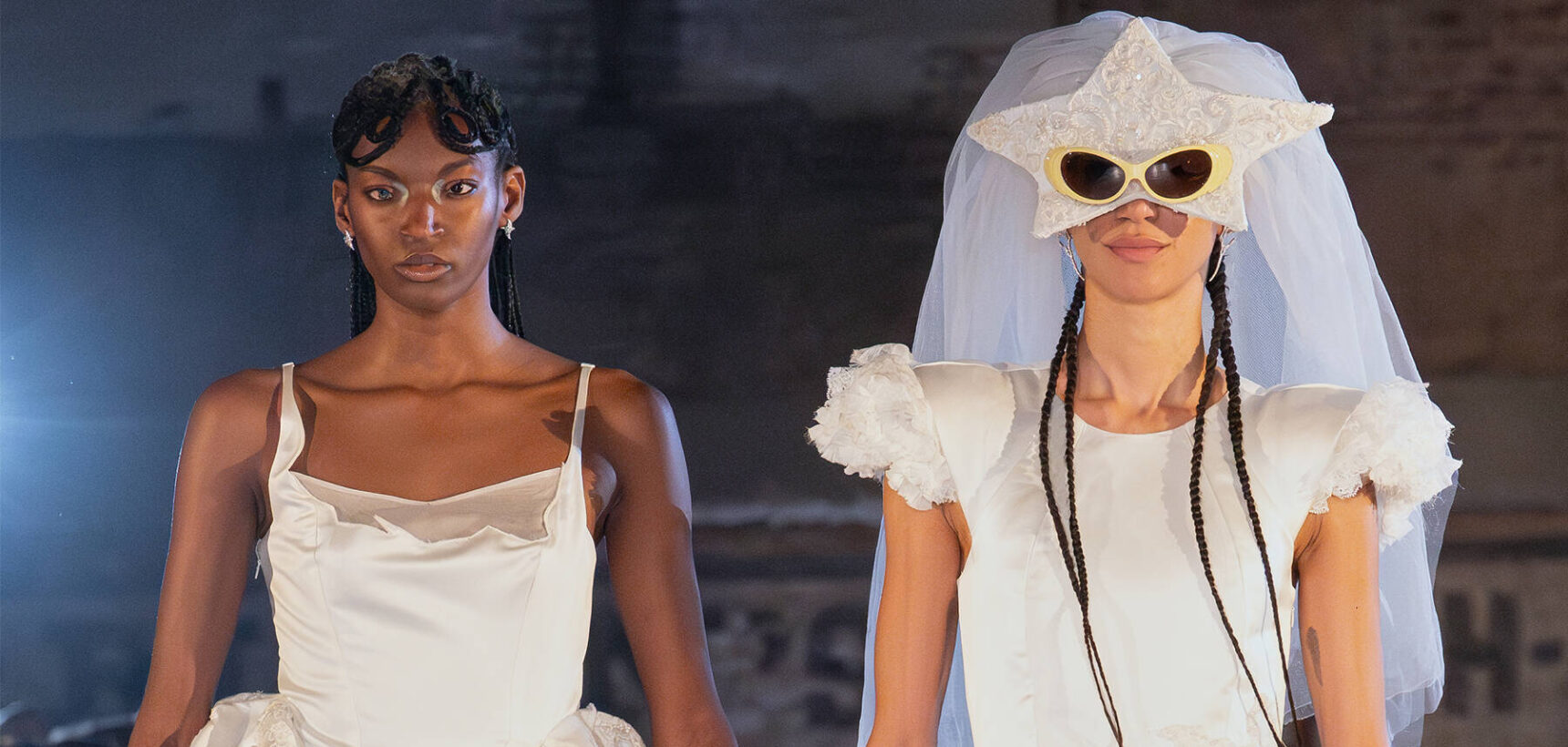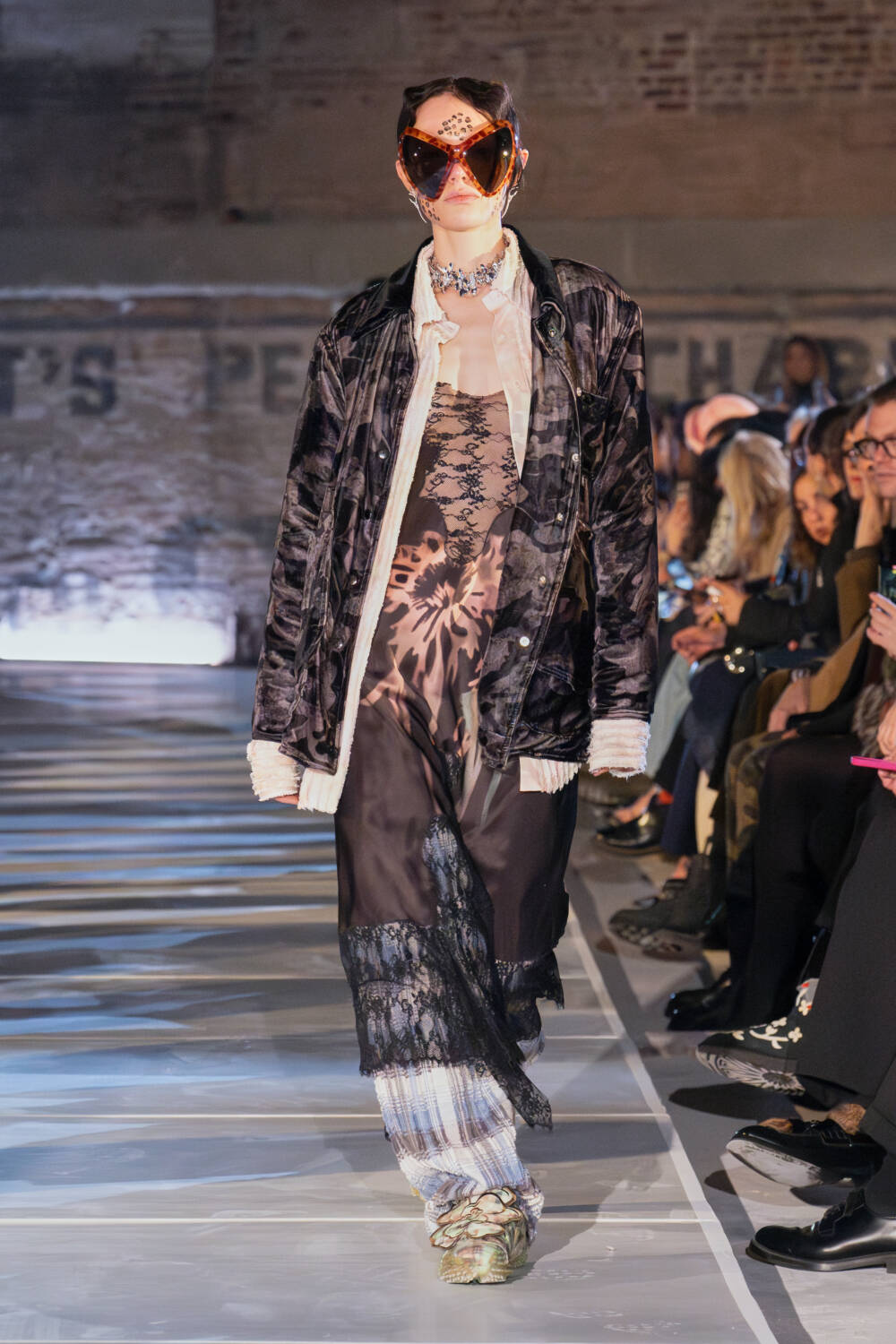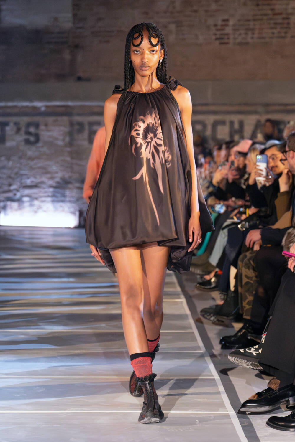 As for the clothes, the idea of taking what you need and letting go of what doesn’t was also evident. The Collina Strada team found themselves in New Jersey thrift stores to source materials. Men’s wool coats were stripped and rebuilt into softer silhouettes. Gauzy ruched dresses, a brand signature, floated down in muted tones as well as in black. Taymour also thrifted three wedding dresses, transforming them into her vision for bridal, complete with a dramatic kiss between two brides in the middle of the runway to cheers from the crowd. Everything felt seasonless, fitting for a new climate where one day it’s completely possible to be in a sheer skirt while another might call for warmer fare like a giant striped sweater with matching scarf.
