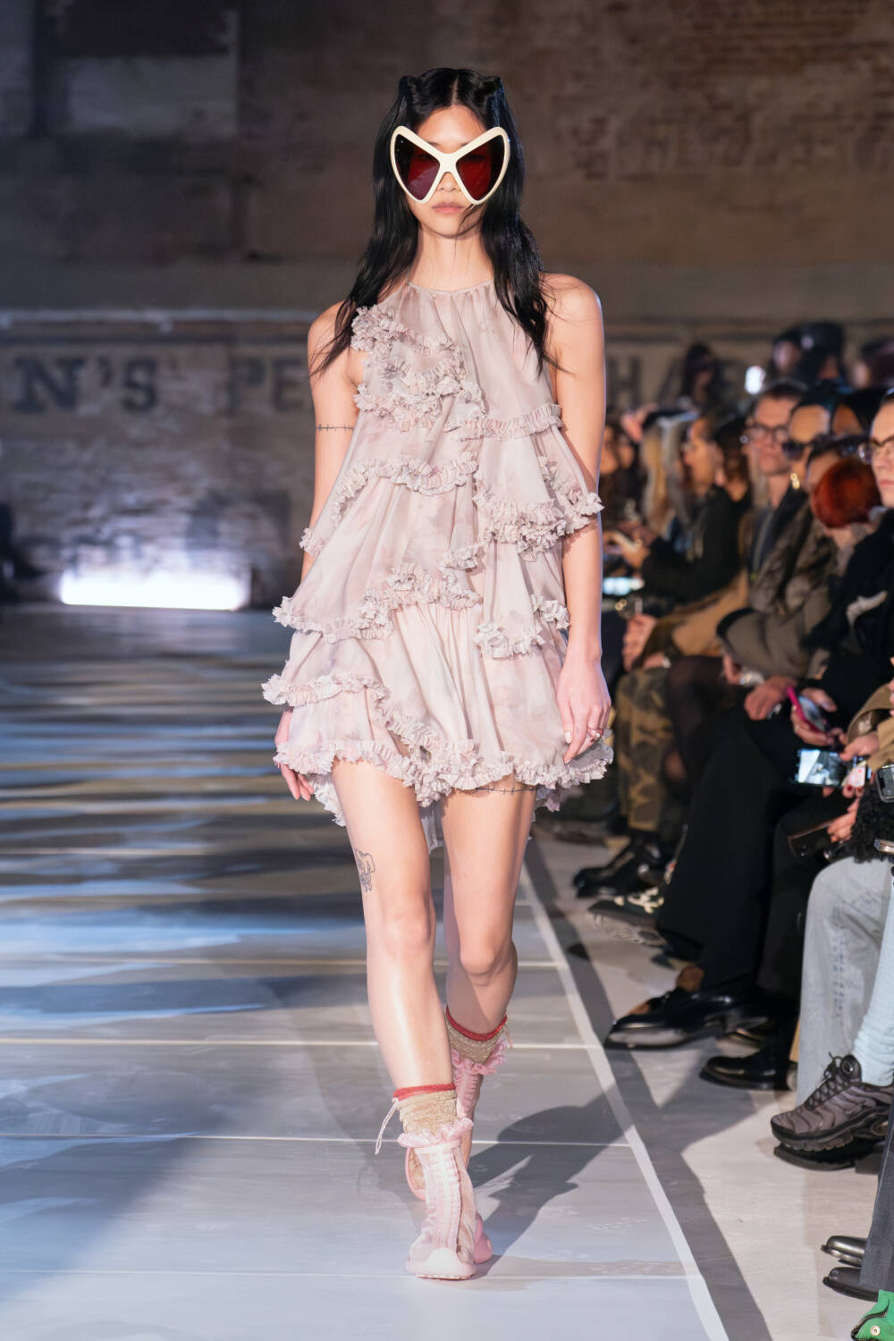 The idea of protection and armour also factored into the clothes and accessories. Giant star shaped sunglasses, balaclavas, hoods and other face-obscuring garments served to disguise in a world that feels less kind. Per the show notes, it’s intended for “hiding the tears, turning them into something else. Letting our freak flag fly, while knowing that sometimes stealth is survival.” While the upper half of the body might be focused on shielding from harm, the bottom half took a lighter tone. The brand worked with both Puma on iterations of their Mostro sneakers, as well as with Fctry Lab, an independent footwear label. Colourful and playful, it was exactly the type of contradiction that the Collina Strada customer revels in embodying.