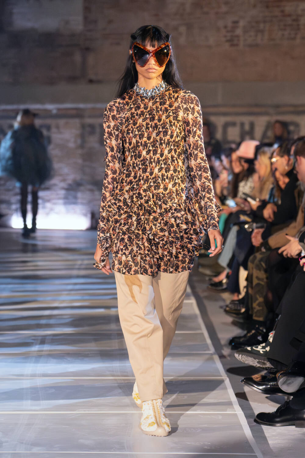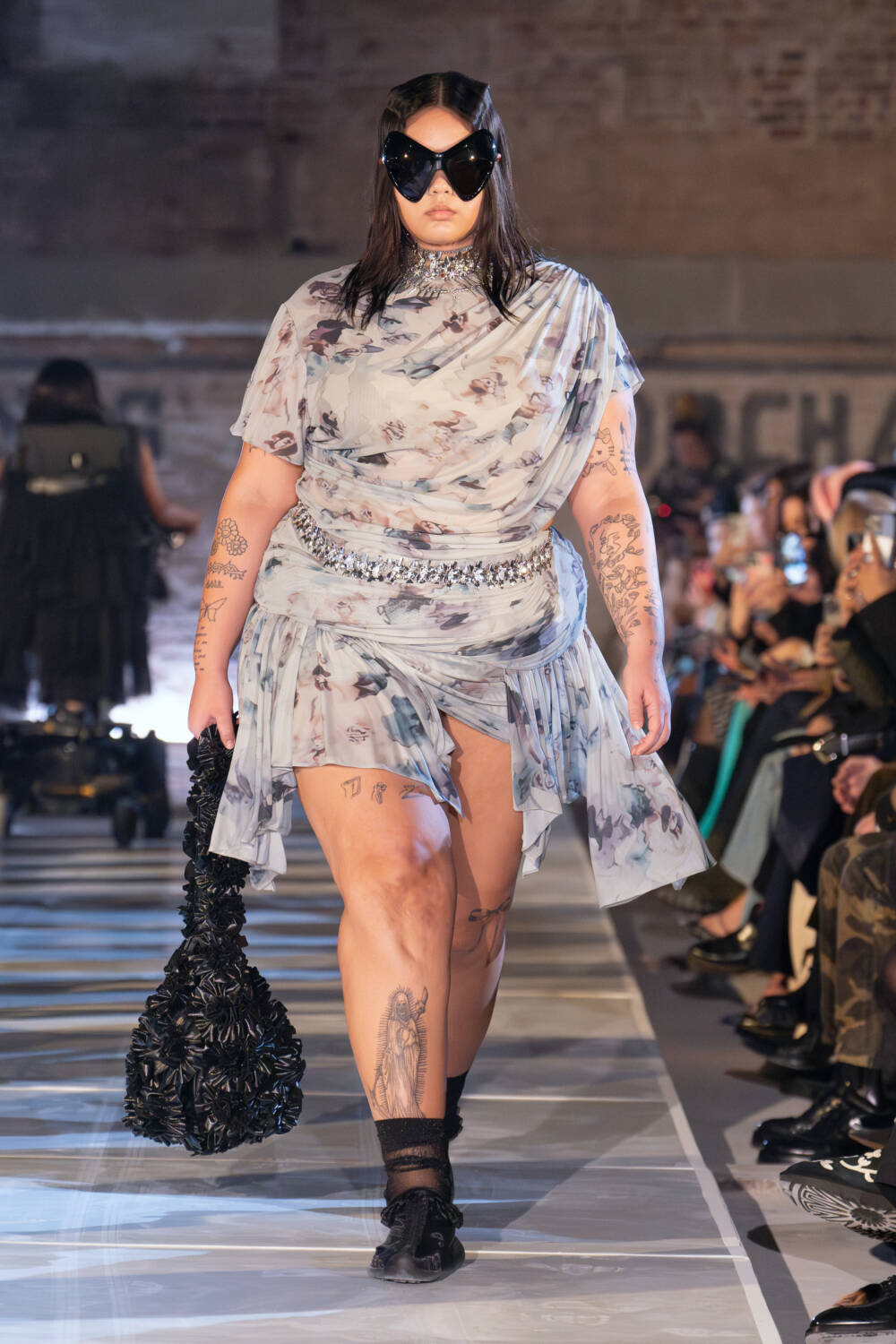 A few things are certain when you attend a Collina Strada show. You’ll see a creative cast of models walking the runway including perennial favourites Aaron Rose Phillips and Kathleen McCain Engman. The front row will be filled with a slew of cool kids including Ella Emhoff, Meg Donnelly, and King Princess. And lastly, founder Hillary Taymour will always have a creative soundtrack to set the tone. Last season it was a version of Ashlee Simpson’s iconic Y2K anthem Pieces of Me, with the lyrics rewritten to capture the brand’s eco-friendly ethos. This time around, it was a steady stream of familiar favourites, again adapted for Taymour’s message of sustainable living. Kicking off the show with a version of Enya’s Orinoco Flow before segueing into Destiny’s Child’s Independent Women, Part 1., the mood was decidedly upbeat for one of the first shows of a subdued New York Fashion Week.