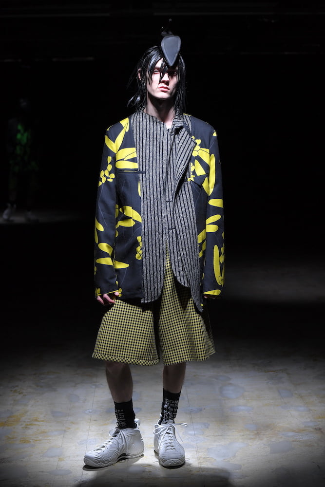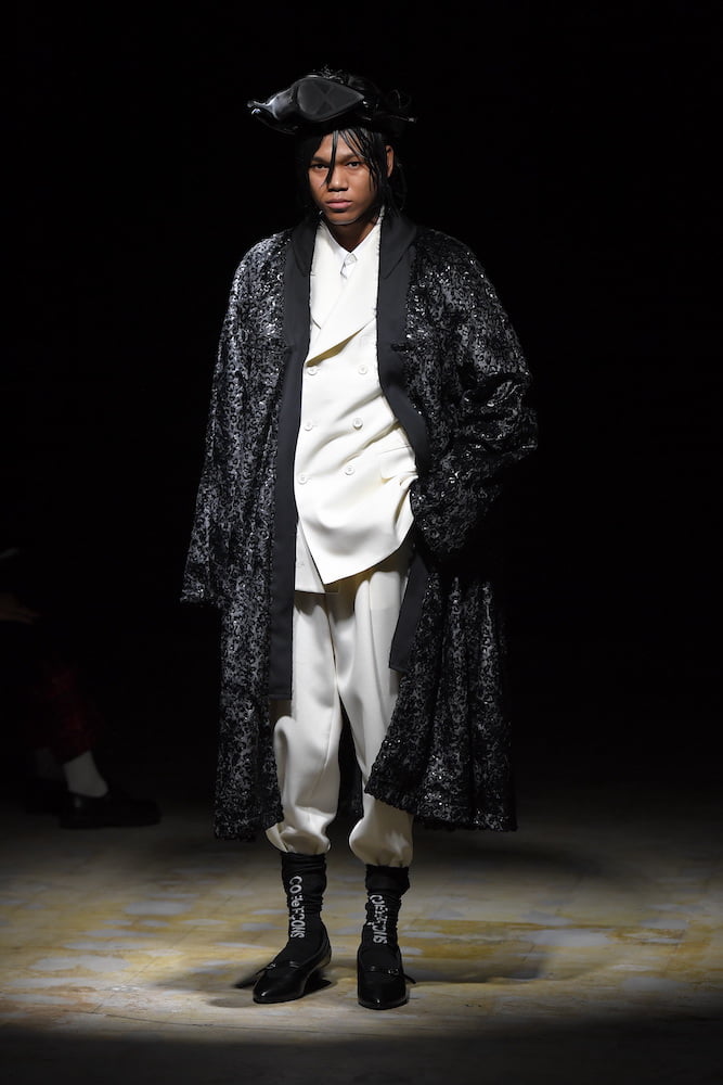 Kawakubo was particularly drawn to the New Jersey-based artist’s mask sculptures, made entirely out of high heels. “I am constantly looking for strong images and I suddenly had the idea to ask Willie if he would consider making headpieces instead of face masks,” says the designer, as the pair came together to adorn the heads of each model in elegant clusters of black pumps. Cole’s original sculptures also cropped up in the collection, via an all-over print that coated elongated shirts, padded blazers and traditional Changshan jackets.