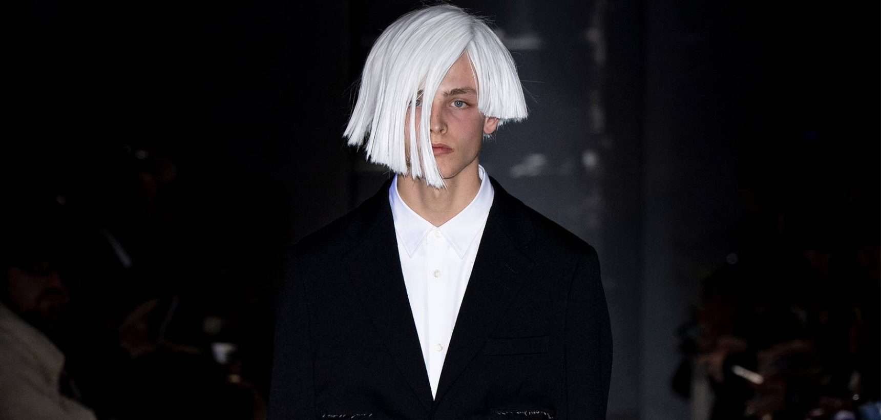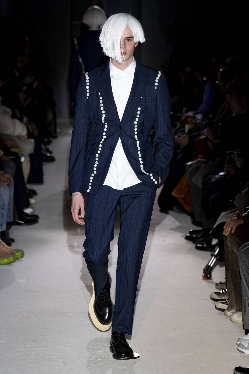 Her cast came with choppy, Warhol bobs and straw-like wigs that fell just above the shoulder, and were clad in a series of shrunken suit jackets that are set to delight loyal Comme shoppers thanks to their subtle flourishes. Like a pinstripe jacket, for instance, distorted at the chest to expose a flash of a silver shirt from beneath. Or the hybridisation of a blazer and a waistcoat to envision a singular jacket.