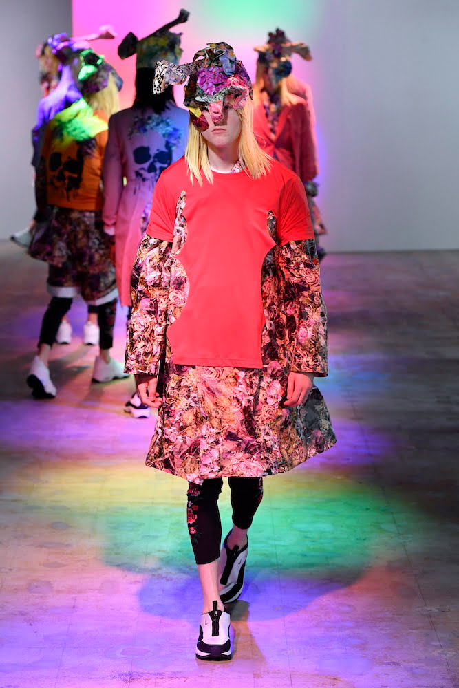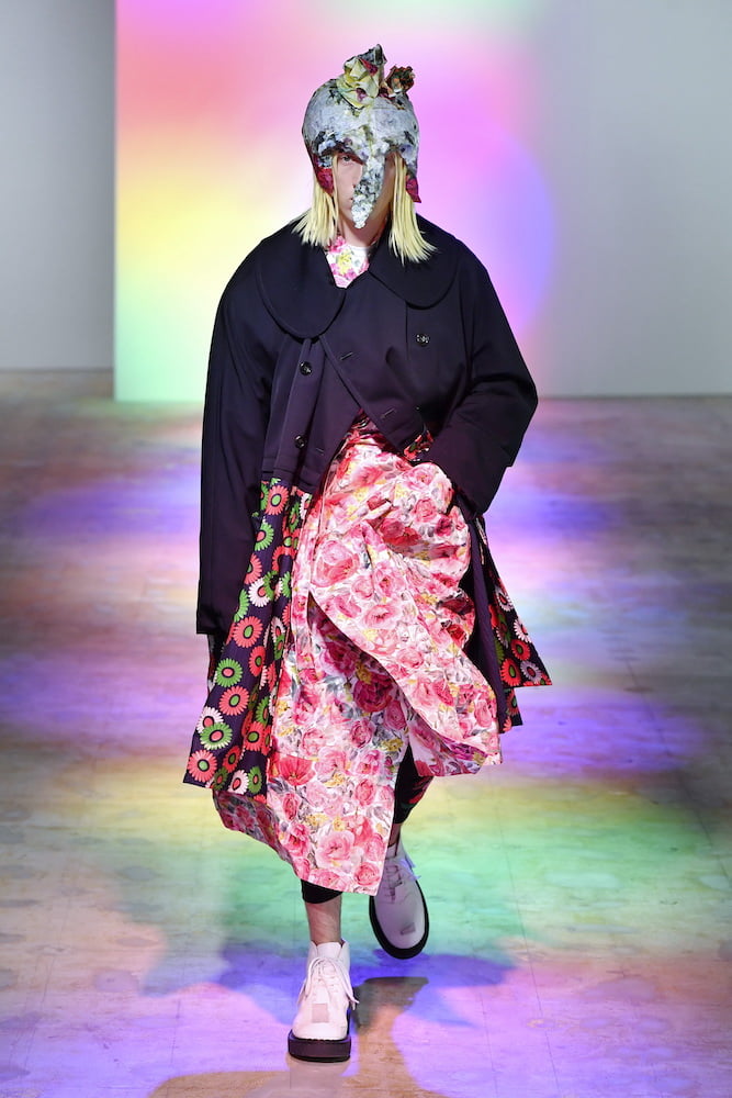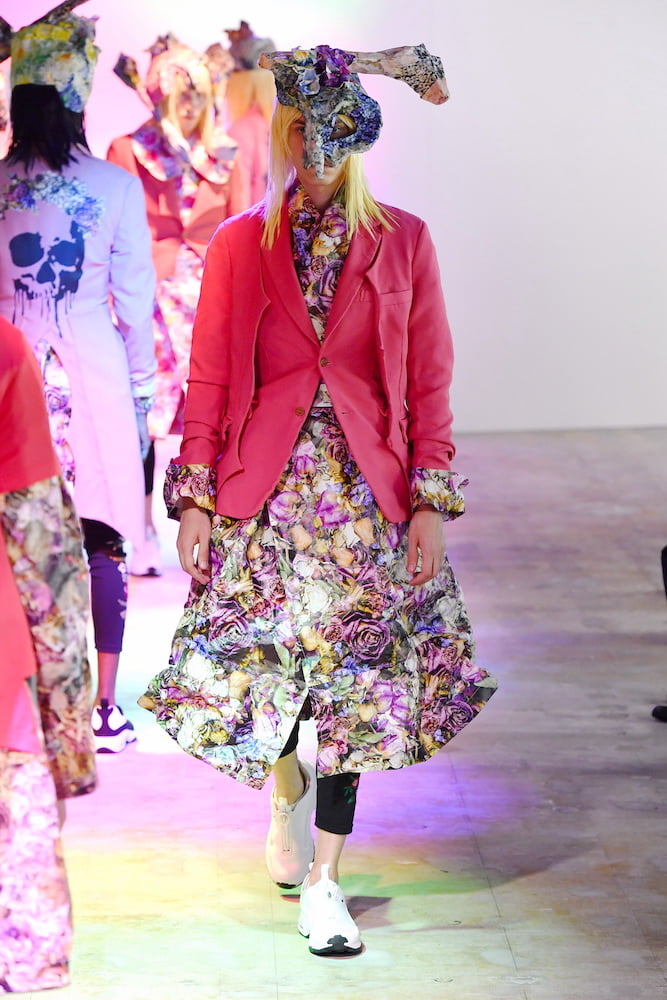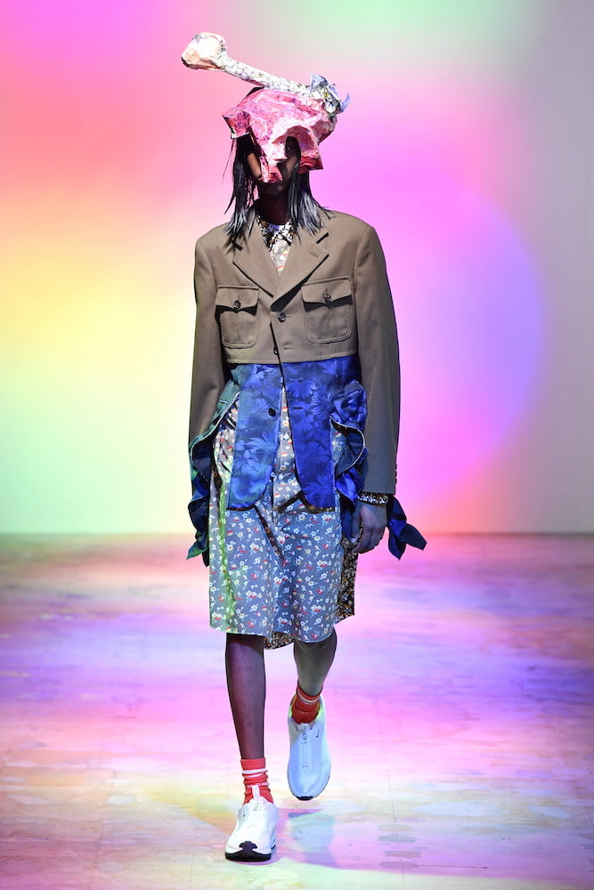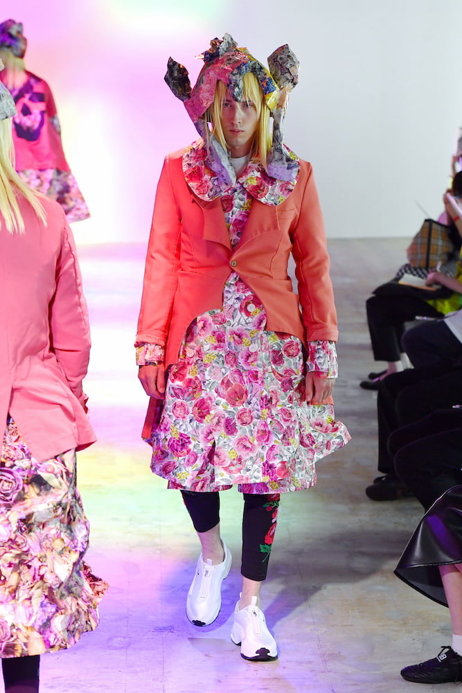 Car coats fell into dresses and acidic long sleeves were worn underneath childlike dungarees; offset with playful papier-mache headpieces by super stylist Ib Kamara. Arizona-based artist Travis Bedel, aka Bedelgeuse, lent his atomical collages – which mesh together bones and organs with flowers – to a series of white coats trimmed with faux-fur. On feet, models wore 3D-printed shoes, a new Nike Air Max Sunder collaboration, and a floral dress shoe designed by Comme, George Cox and John Moore of London’s influential boutique House of Beauty and Culture. The collection’s shapes and silhouettes were quintessentially Comme. The final result? Effortlessly beautiful.
