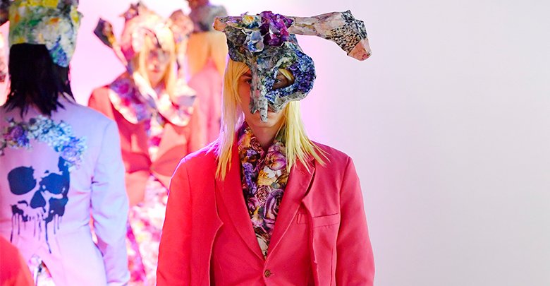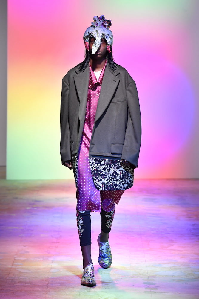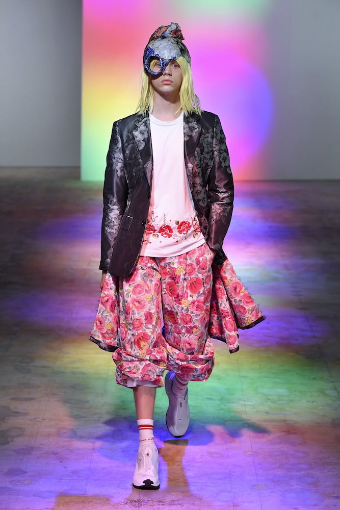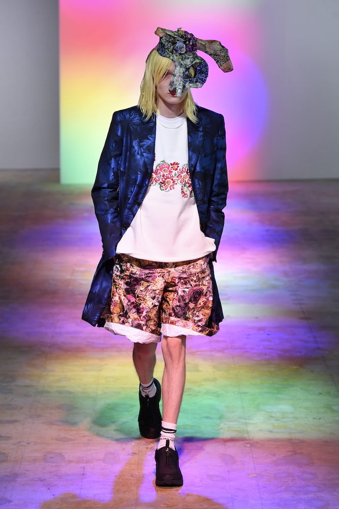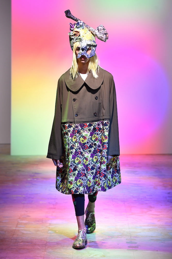 Car coats fell into dresses and acidic long sleeves were worn underneath childlike dungarees; offset with playful papier-mache headpieces by super stylist Ib Kamara. Arizona-based artist Travis Bedel, aka Bedelgeuse, lent his atomical collages – which mesh together bones and organs with flowers – to a series of white coats trimmed with faux-fur. On feet, models wore 3D-printed shoes, a new Nike Air Max Sunder collaboration, and a floral dress shoe designed by Comme, George Cox and John Moore of London’s influential boutique House of Beauty and Culture. The collection’s shapes and silhouettes were quintessentially Comme. The final result? Effortlessly beautiful.