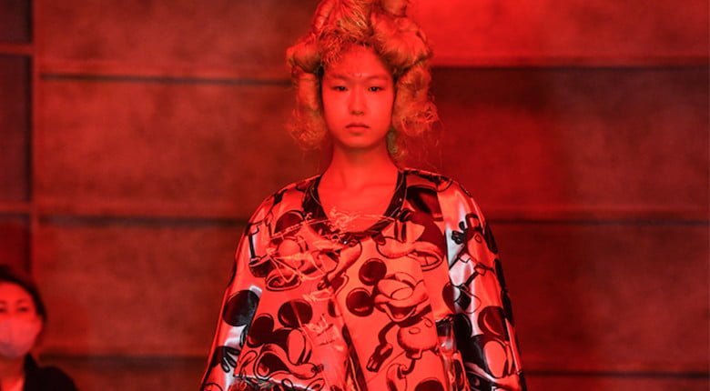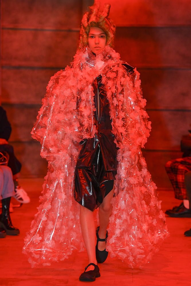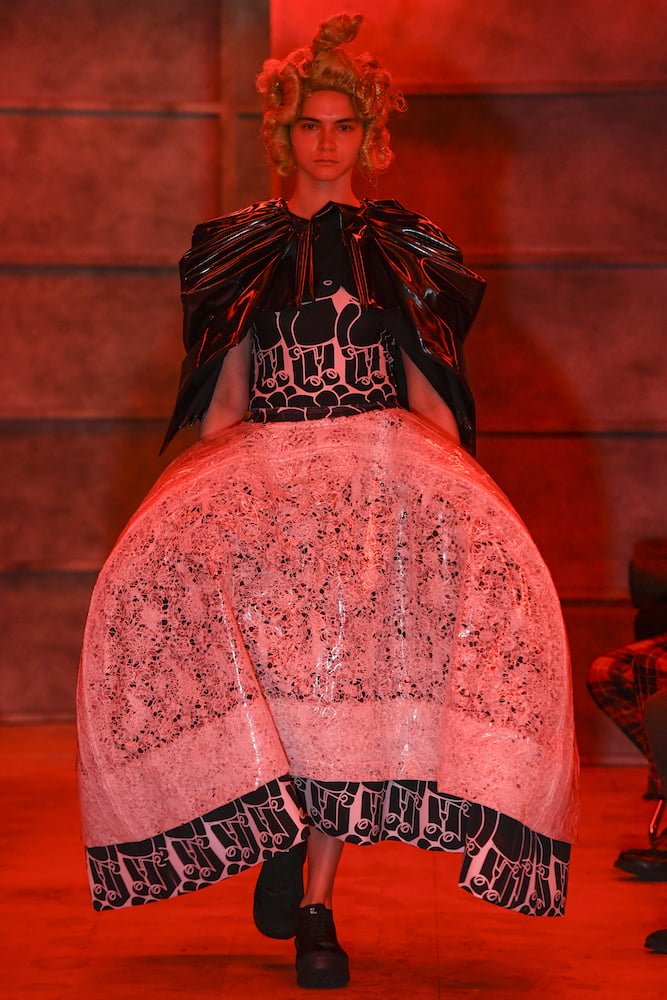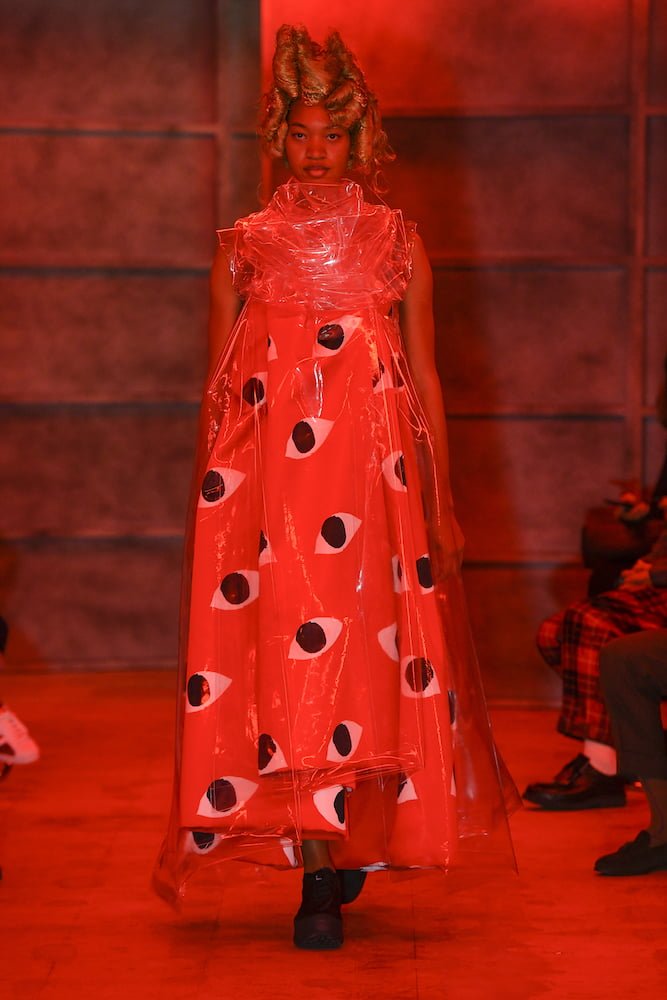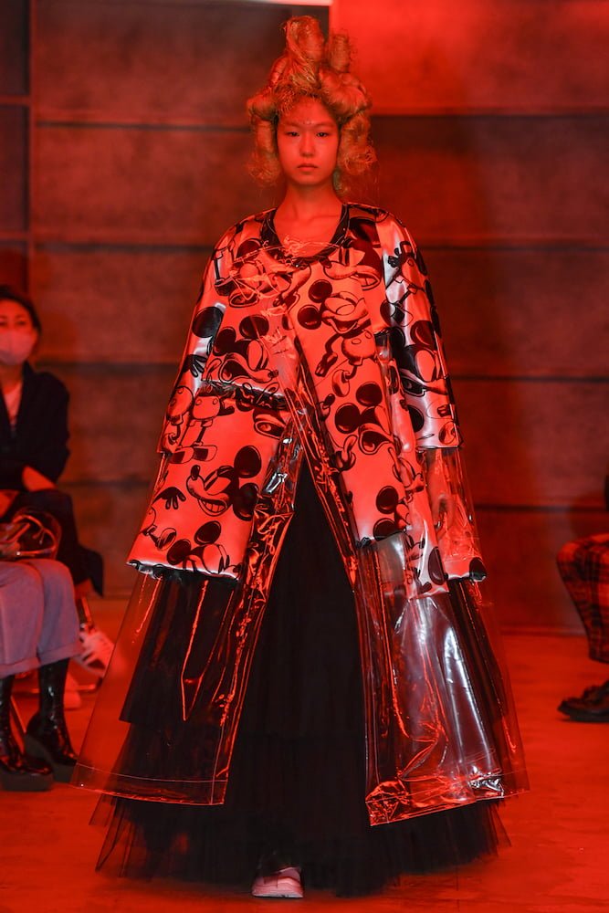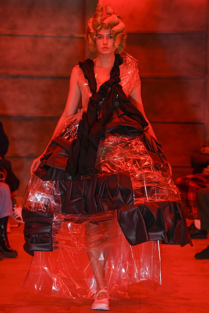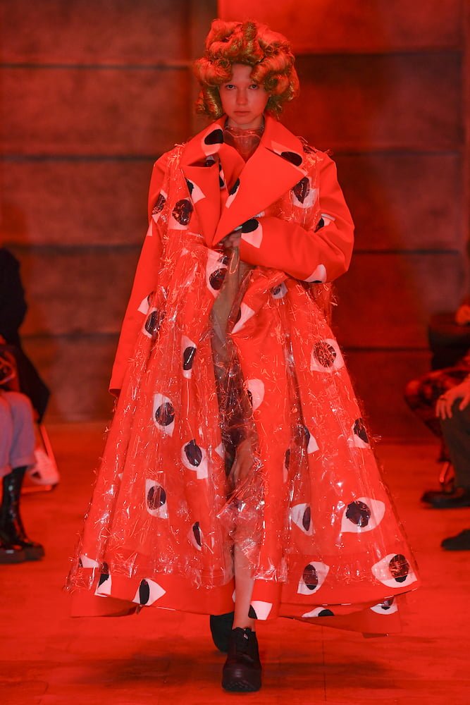 None of the normal rules ever applied to her way of thinking – in that sense she’s probably the one person in fashion most acclimatised to this era of upset. Her response? A red-li, hell-scape through which her models strode in cellophane-wrapped, panniered gowns. The grandeur and volumes of these creations combined historicism with the very contemporary need for social distancing. Micky Mouse – not cute but fierce and frantic looking – appeared on a graphic. Minnie Mouse’s polka dots played out on a distorted, balloon dress and there was a collaboration with the Bearbrick teddybear toy. These totems of childhood, twisted, in the only the way Comme can.