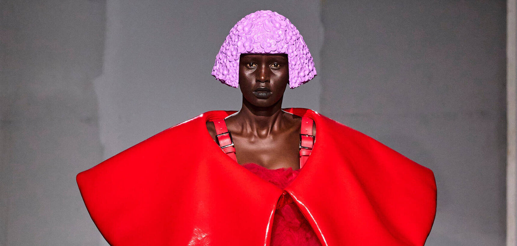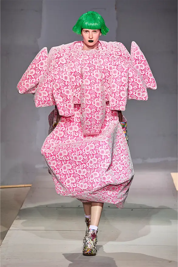 “To break free of the gloomy present, I hope to present a bright and light future.” That was the gnomic wisdom of Comme des Garçons and Rei Kawakubo, who presented a defiantly upbeat collection. The message seems to be if we’re all going to die anyway, you might as well do what you want with as much force and passion as you can muster. Bright happy shapes and colours might be out of character for Comme, but this is what Rei wants. This collection had it all – colour, sparkle, print, texture and impossible volumes, put together in a genius/madcap mix. Tropical print fabric was formed into huge domed capes worn with solid pink rubber bobbed ‘Rei’ wigs (did Lego do the hair?). Multi-coloured test-card prints were scrunched into rosettes and worn with giant wipe-clean Peter Pan collars.