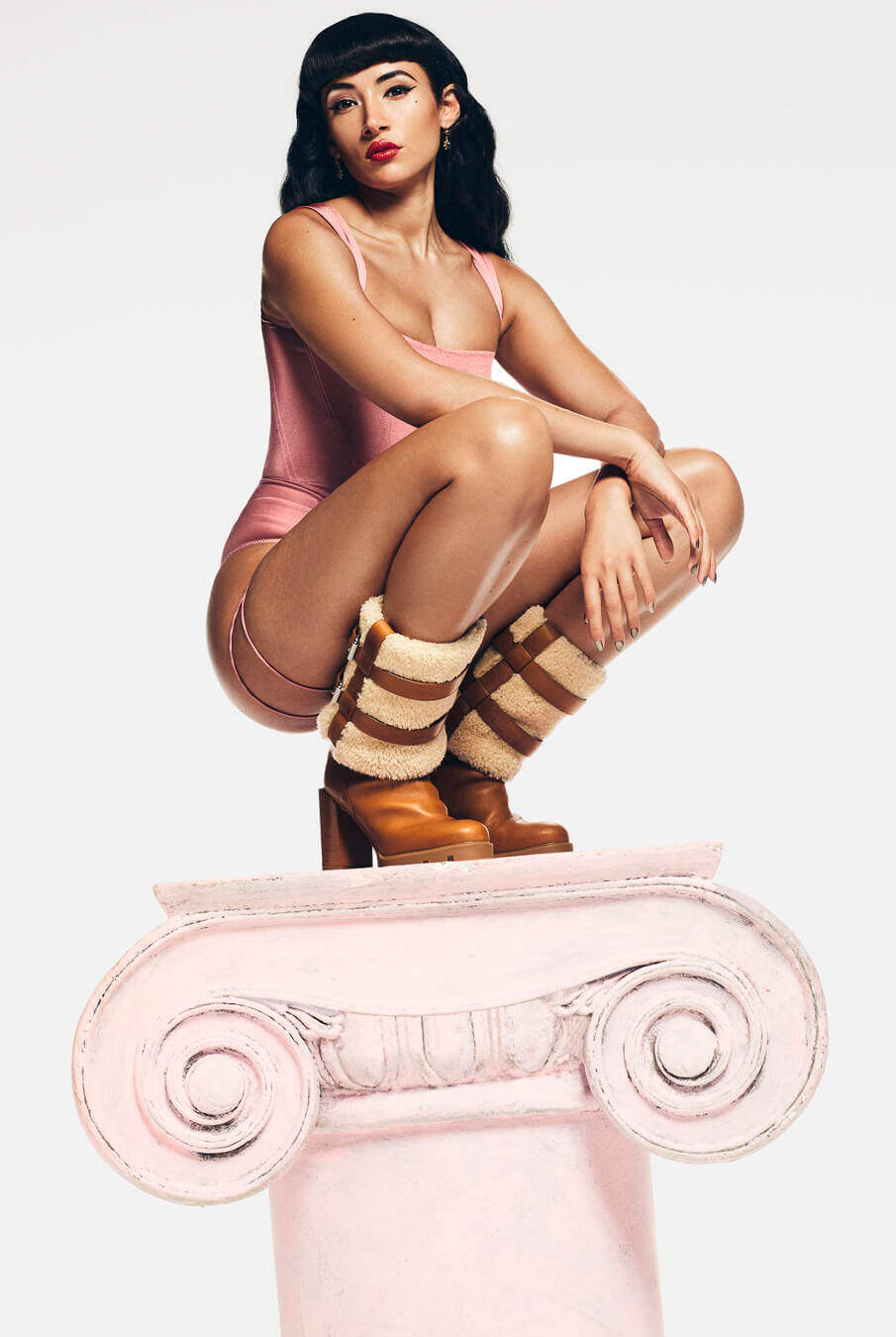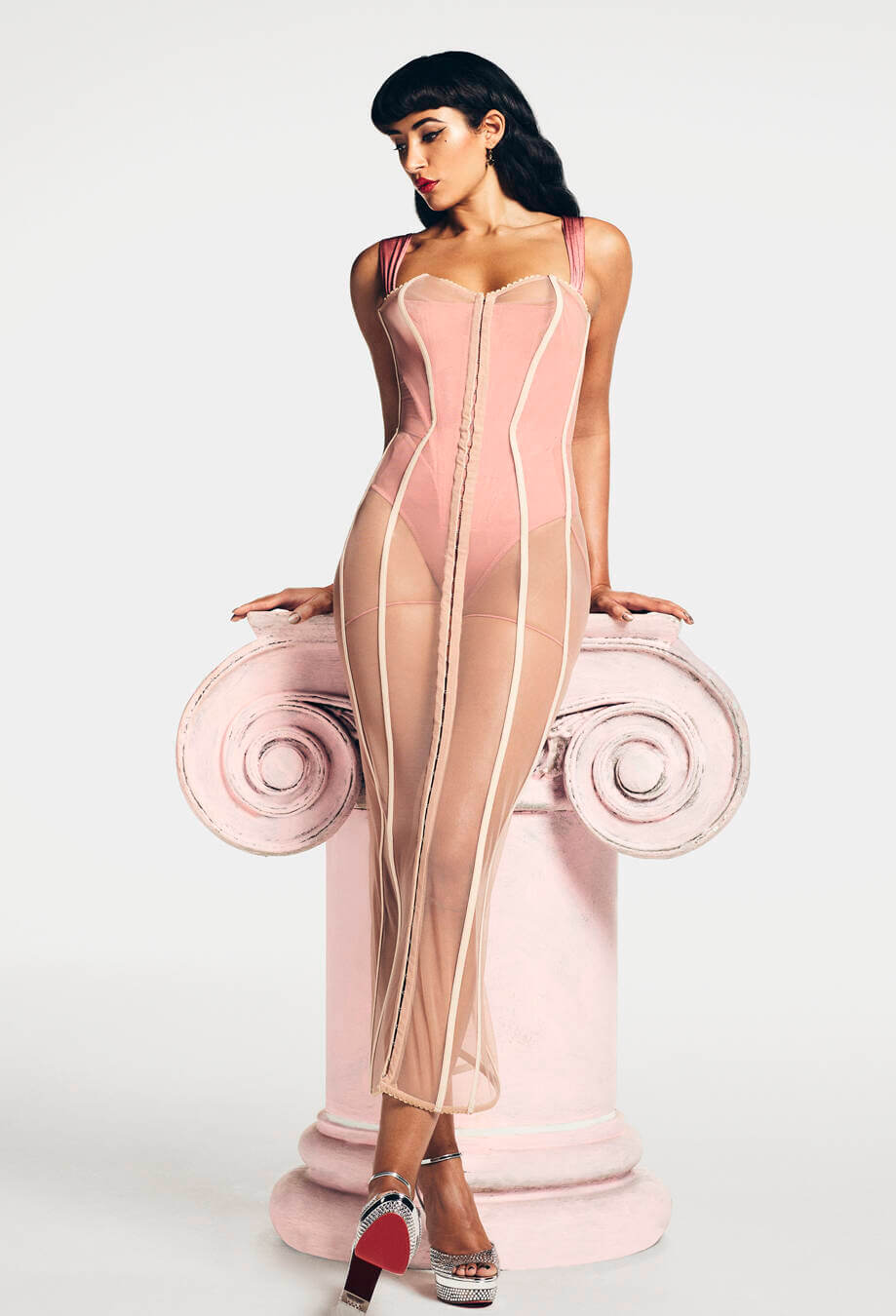 left: corset and shorts by GUESS USA, boots by CHRISTIAN LOUBOUTIN right: bodysuit by DILARA FINDIKOGLU, boots by CHRISTIAN LOUBOUTIN