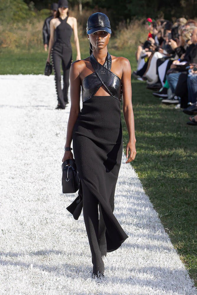 In turn, he turned his attention to festival wear, fusing rave garb with the vocabulary of the house. This meant rain macs based off a cape from 1968, wrapround halterneck dresses and tops made of PVC and pared back clubbing dresses with trains. Pair these with ribbed flared trousers and the brand’s vinyl jackets – a new favourite of Marc Jacobs – and you have a wardrobe that can take you from the dancefloor straight into everyday life.
