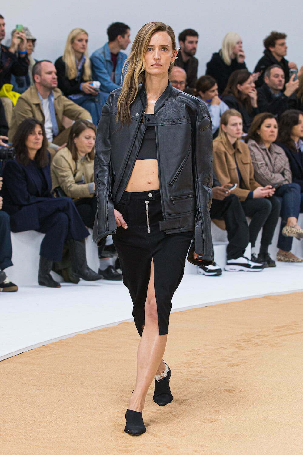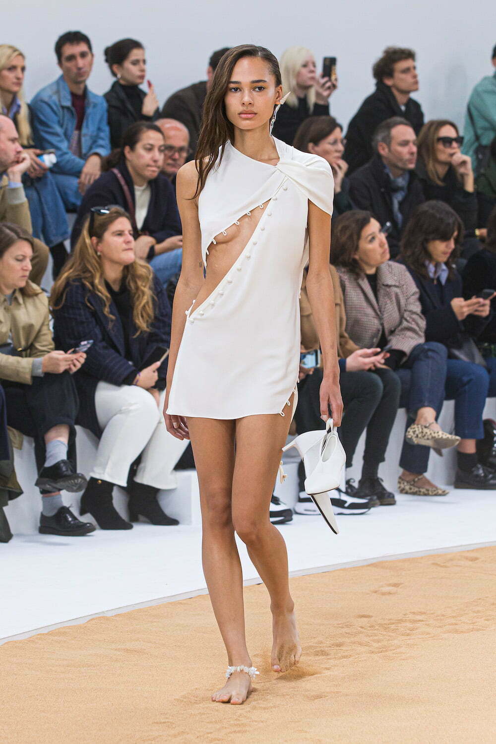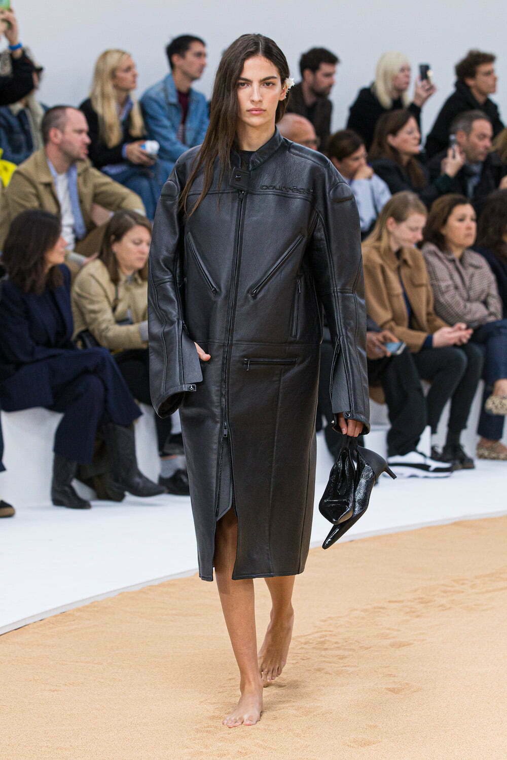 Their were echoes of Courrèges’ clubwear – popper flared trousers came exposed at the thigh like a mini-skirt hybrid, and leather jackets were equipped with straps so they could be carried like a bag when things get steamy – but this season felt more like the aftermath from the night before. Dresses and bodysuits made of scuba fabric were peeled down to the waist, worn with semi opaque bandeau tops in sunset hues. The designer proposed spiky silicone gilets which resembled coral and sent out a slew of wispy, rouleau-buttoned flou dresses inspired by a 1974 Courrèges design that could unzip in a spiral motion around the form of the wearer.