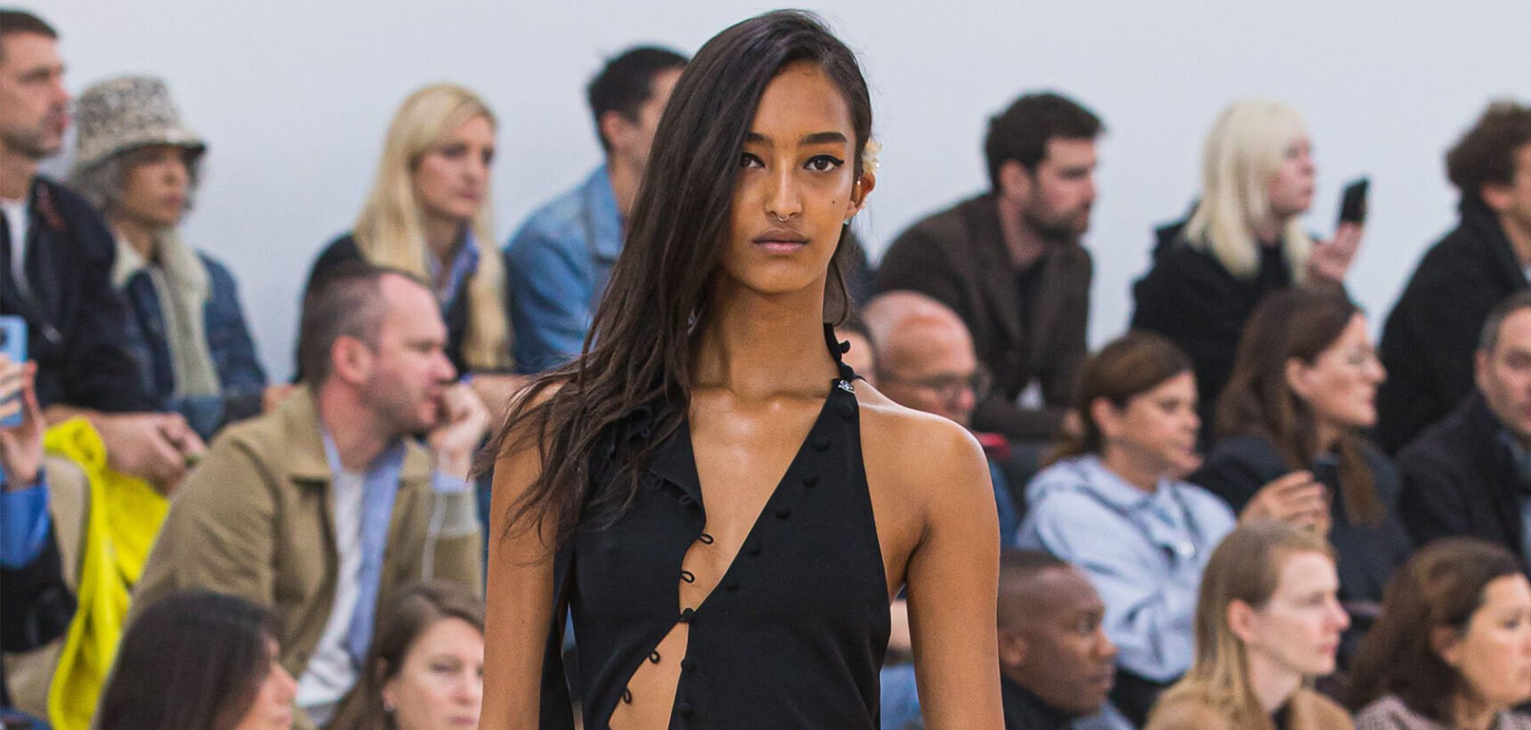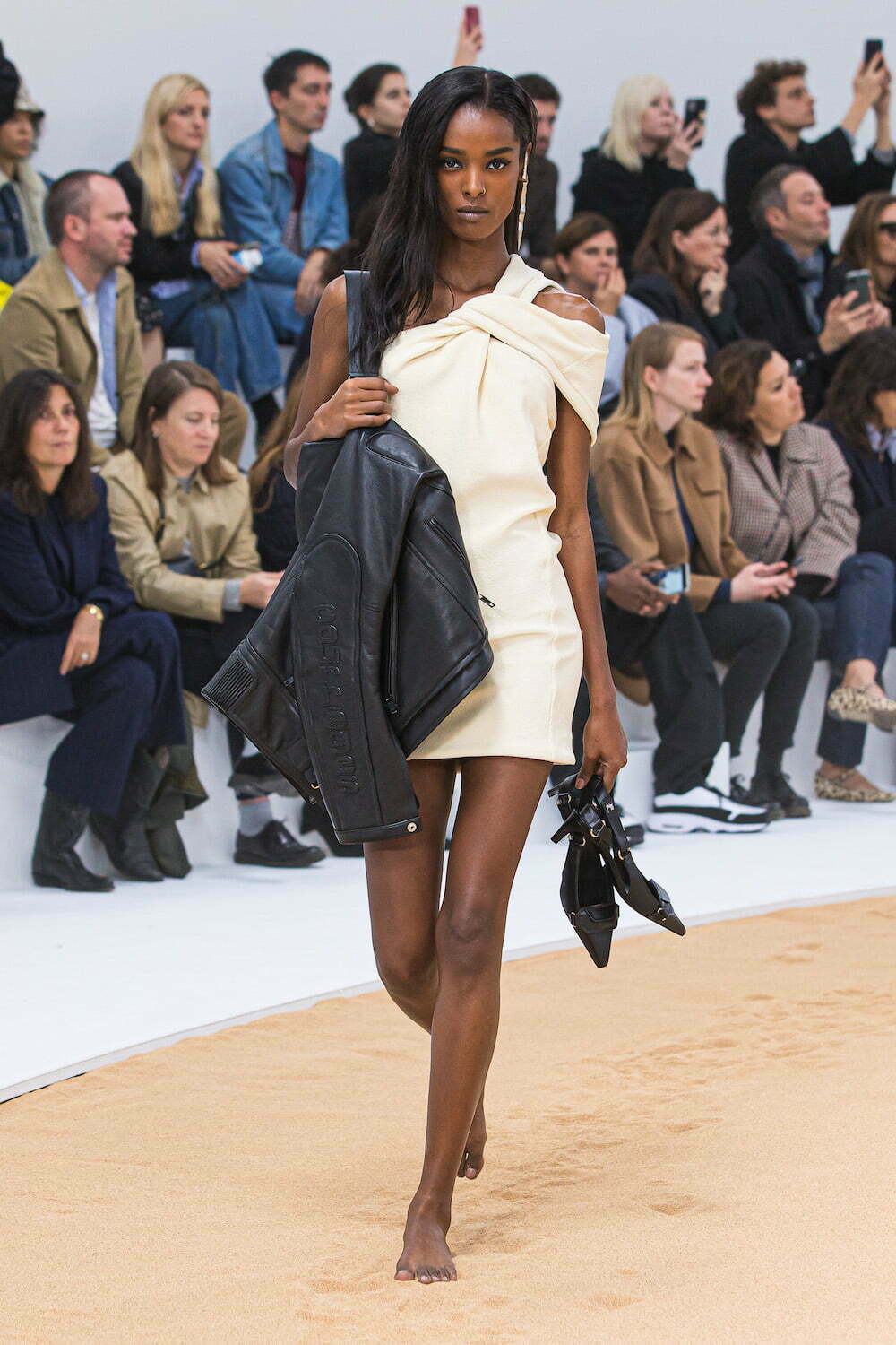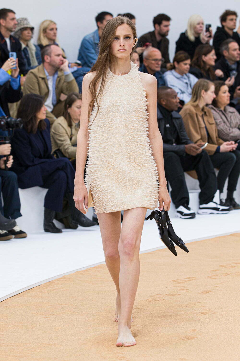 Their were echoes of Courrèges’ clubwear – popper flared trousers came exposed at the thigh like a mini-skirt hybrid, and leather jackets were equipped with straps so they could be carried like a bag when things get steamy – but this season felt more like the aftermath from the night before. Dresses and bodysuits made of scuba fabric were peeled down to the waist, worn with semi opaque bandeau tops in sunset hues. The designer proposed spiky silicone gilets which resembled coral and sent out a slew of wispy, rouleau-buttoned flou dresses inspired by a 1974 Courrèges design that could unzip in a spiral motion around the form of the wearer.