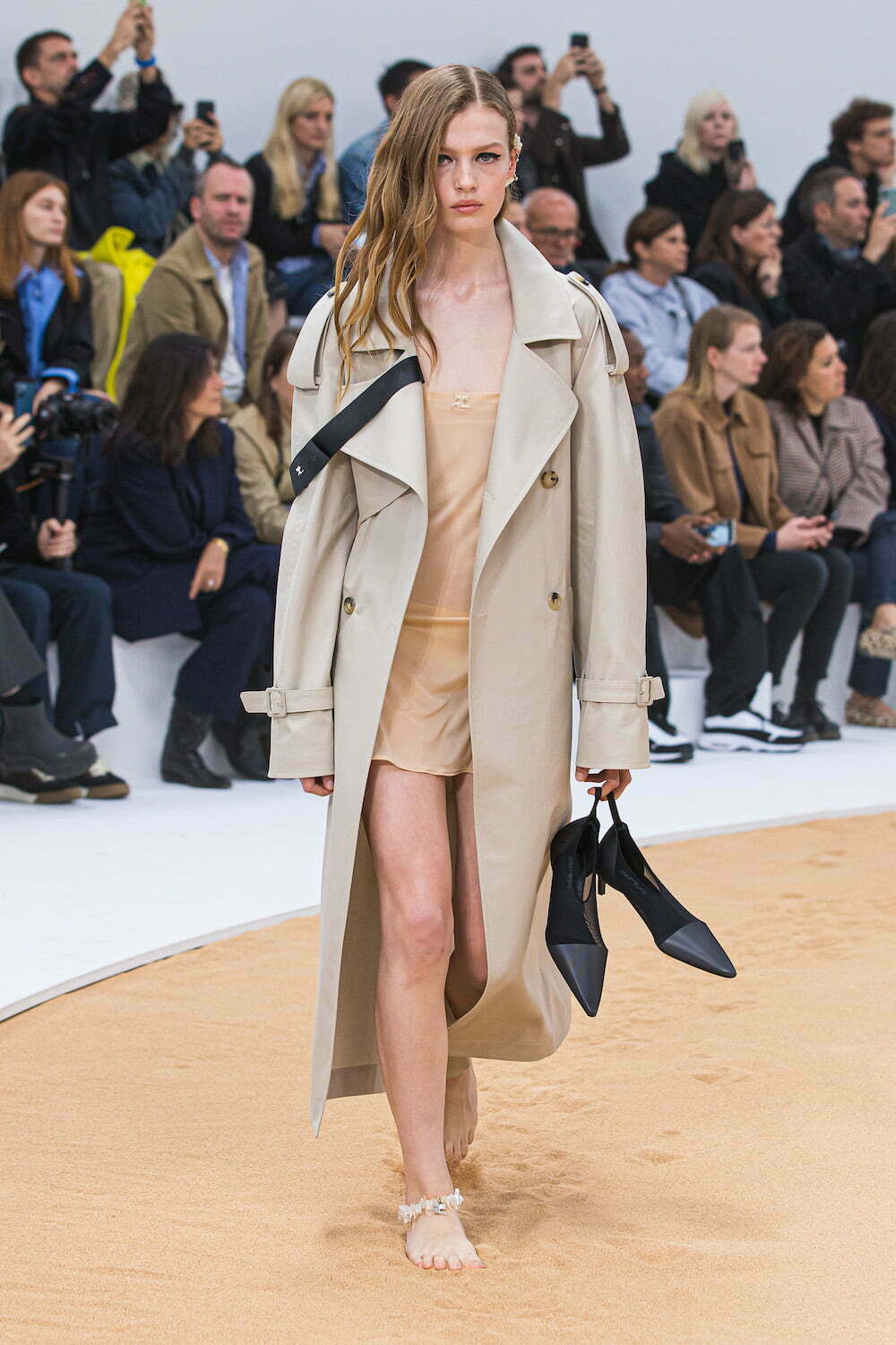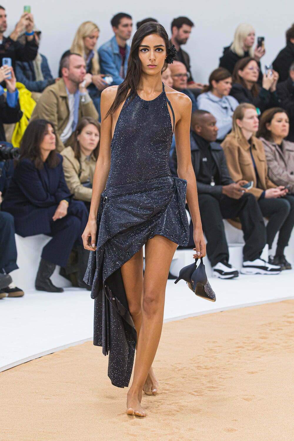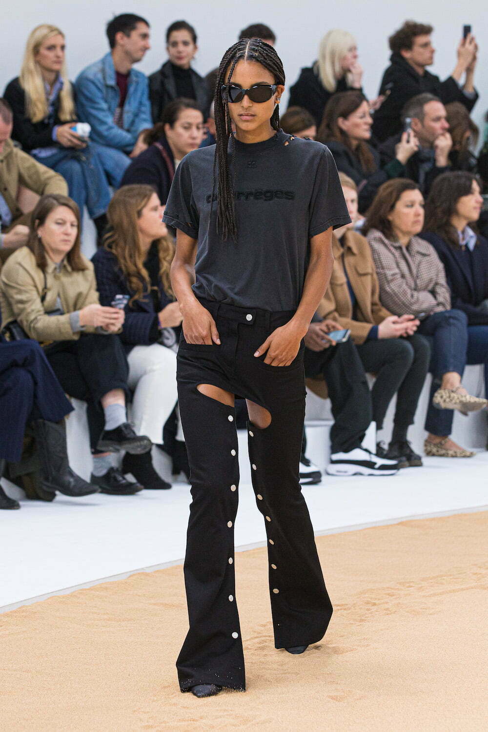 Though for SS23, the Courrèges clubbers stepped out from beneath the strobe lights and made their way to the beach. The set was created by French artist Theo Mercier, and symbolised an hourglass as a curtain of sand fell from the ceiling, forming a whirlpool from beneath. It was a metaphor for the passing of time; of how di Felice looks to Courrèges’ futuristic past to guide his design lexicon but is keen to push the brand’s codes forward.