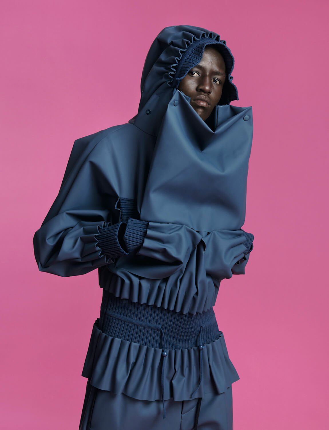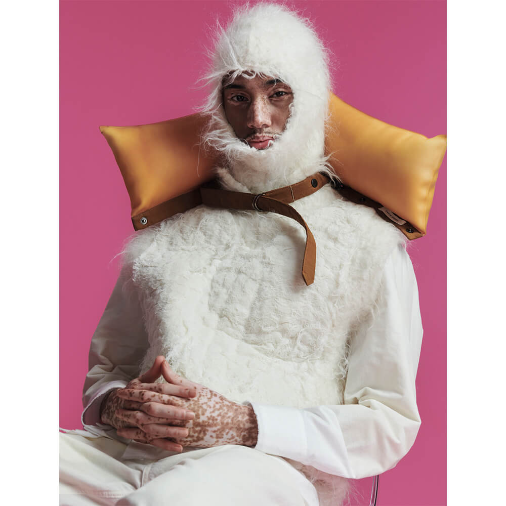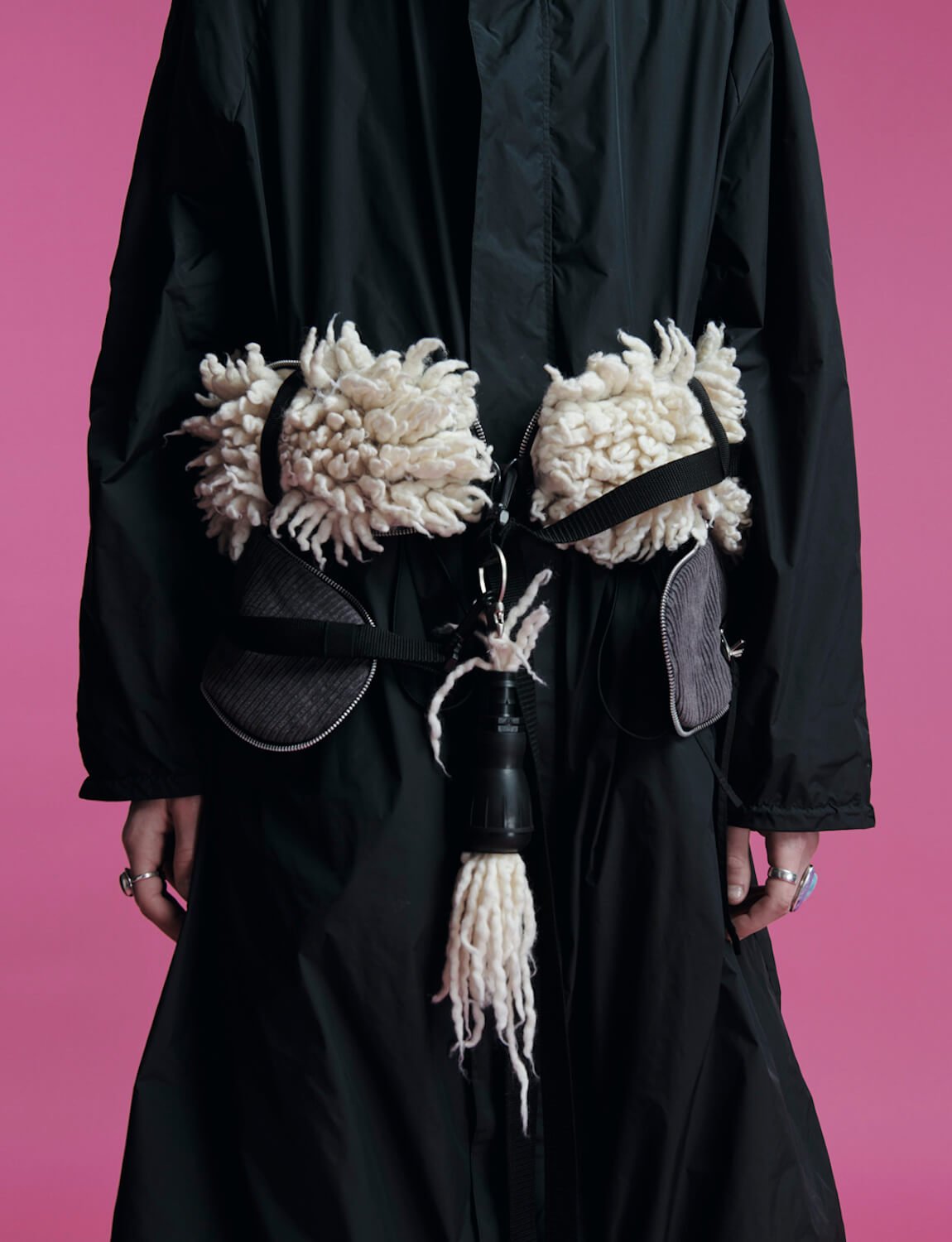 In this collection, he was also looking at the claustrophobia of tufty knitwear and delving into rubber. “I guess we were playing with lots of gross textures, which to some people are pleasure, and to some are fear. Latex and stuff like that – and lots of boiled, tufted wool, because I know lots of people hate the feeling of wool on their skin. We had tufting but it was all on the inside of the garment so you could really feel yourself encased in it.” He referred to the circular pocket openings on jackets as inspired by “the pocket valves in the sides of iron lungs, which let nurses touch the patient. All of them were made at a specialist rubber factory. The people we worked with make diving suits and an anaesthetic breathing bladder for medical use. They’re a dip-moulding factory. It was fun trying to convince them to make these! They were like: ‘What is that for?’