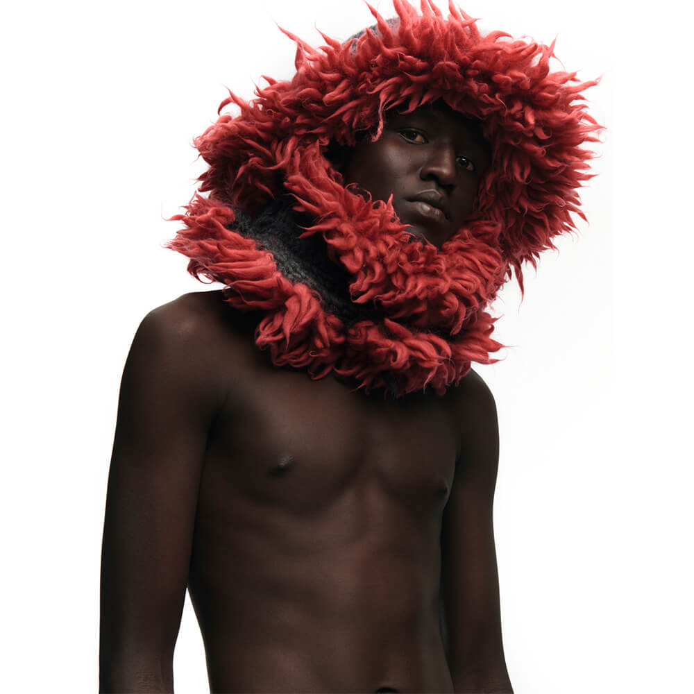 If that was Green’s way of processing of the general social trauma of lockdown, the ideas of suffocation and people breathing on ventilators, he and his team got a bit more than they were bargaining for. “It was strange, because a lot of the stuff that we were doing had certain smells to it as well, which were kind of gross. Some of the colour ways that we got done in the factory were cured wrongly. It had a very particular smell to it. The models were trapped in mohair with this smelly latex,” he says with a chuckle.