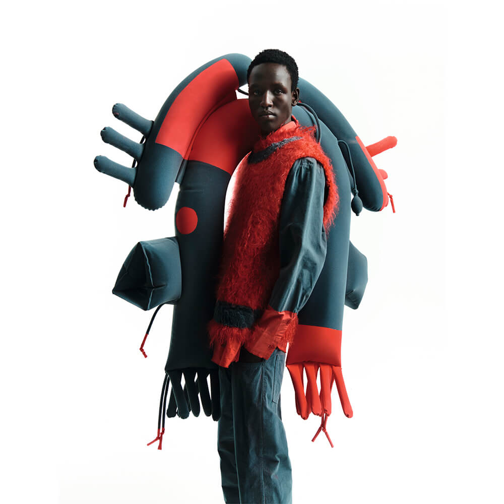 Huge, snaking, inflated tubes were laid out through a nearby warehouse. When you sat down, you realised that they were filled with water – a bouncily weird Craig Green sensation. “Oh yes: they were actually flood barriers that are used for emergencies”, he says. “You know, they come in, put them in cities and places. So, we rented them.” There were tubes draped over the shoulders of some of the looks, too. By the end, the conceptual pieces started to remind you of inflatable life rafts. The ever-presence of climate disaster and, frankly, war, are always calling somewhere in the background of his work.