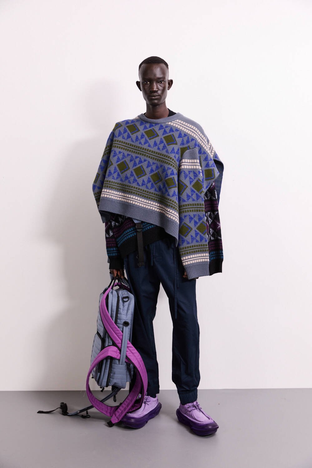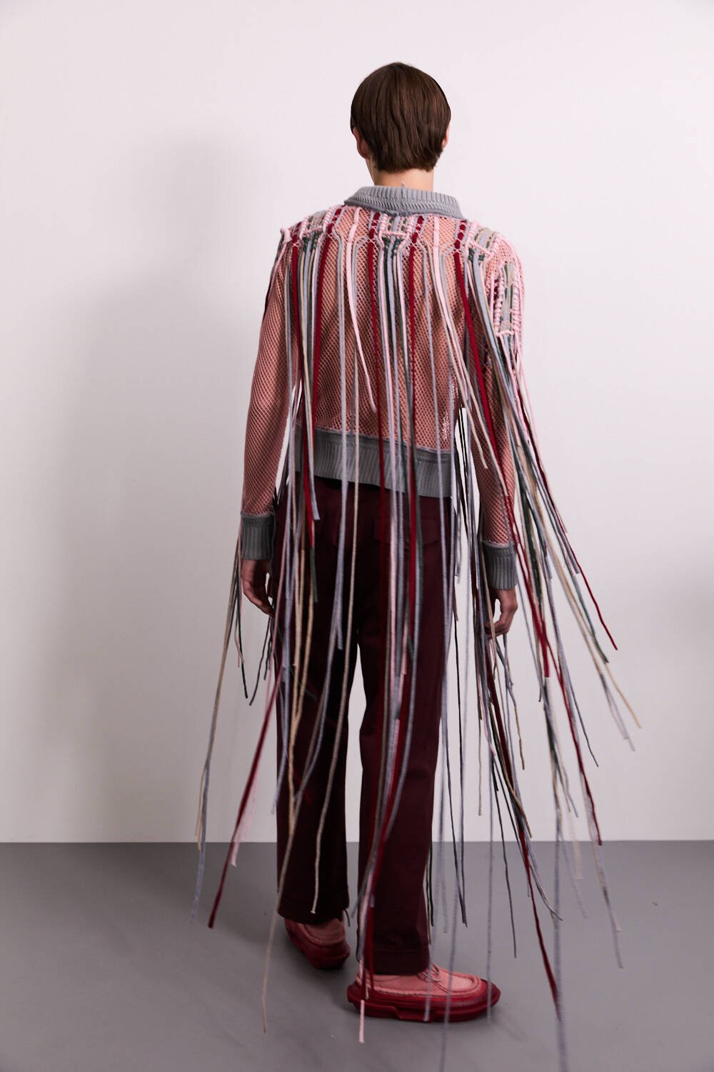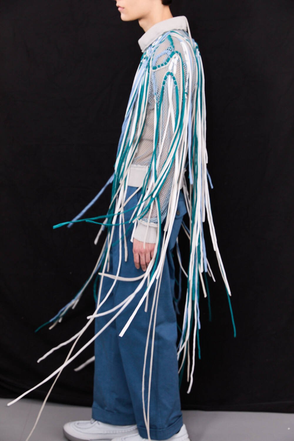 Over the last 10 years, Green’s collections have tackled the complex notions of modern masculinity via protective gear, workwear and experimental wearable sculptures. Here he dissected leather protective vests, cutting and reworking patches into swollen biker jackets made alongside ECCO.Kollektive that looked like the anatomical making of the human form. There were two collaborations threaded throughout: clever, double-collard polo shirts with Fred Perry and Eastpak backpacks equipped with tentacle-like straps that danced as the models walked through the space.