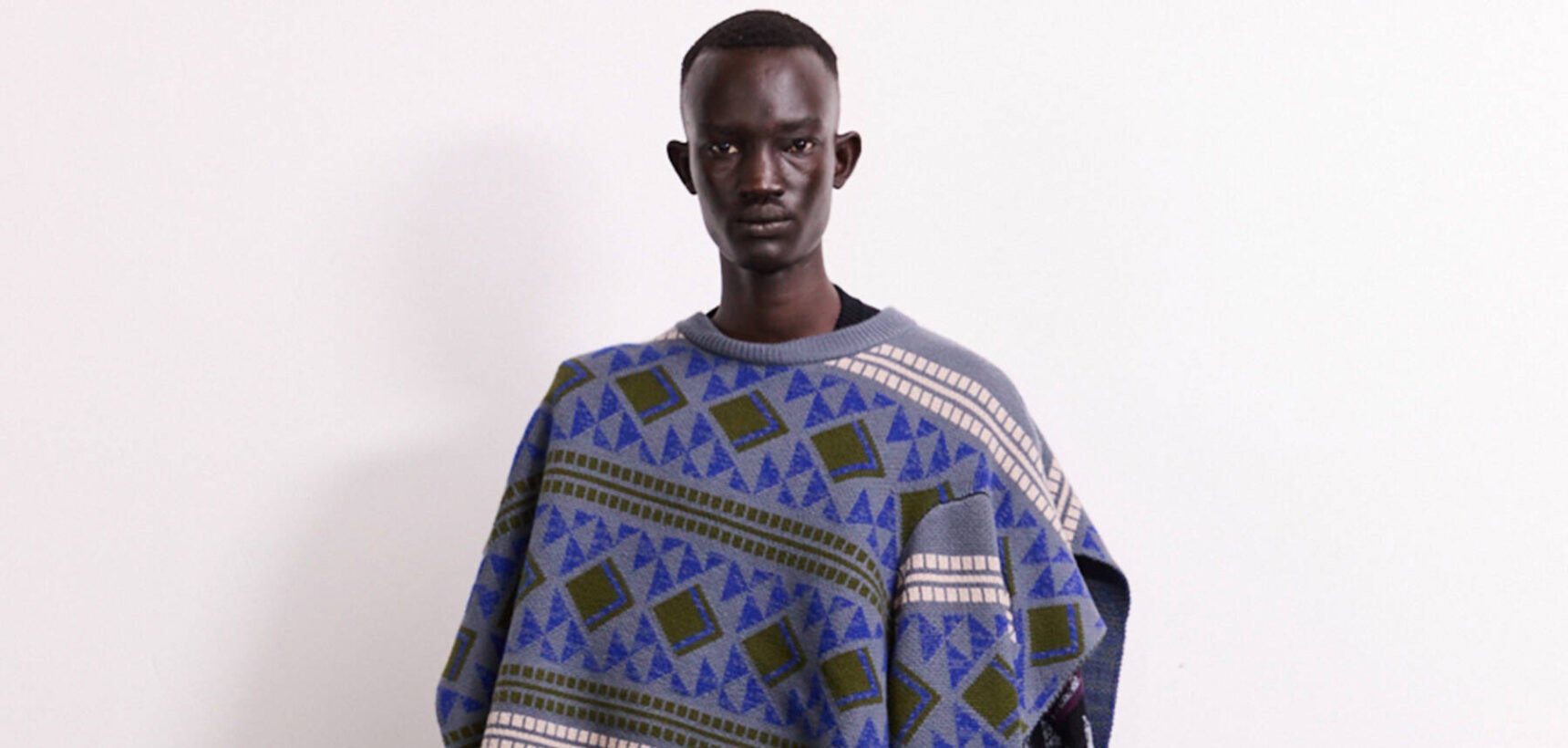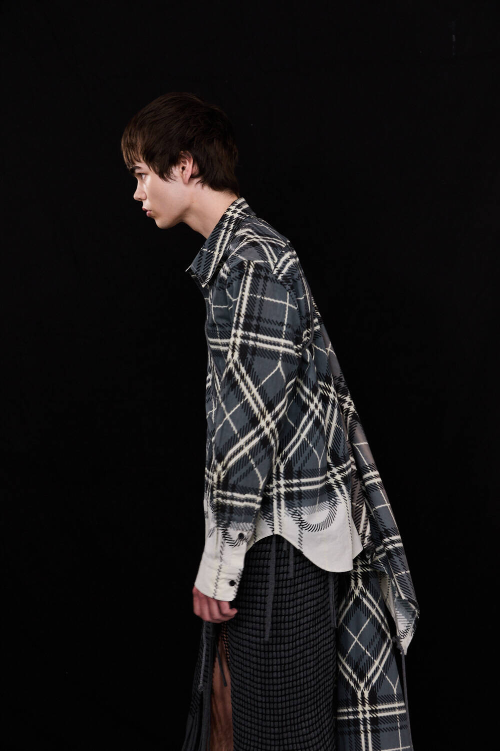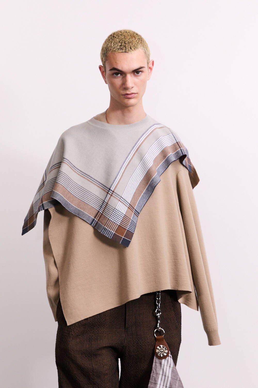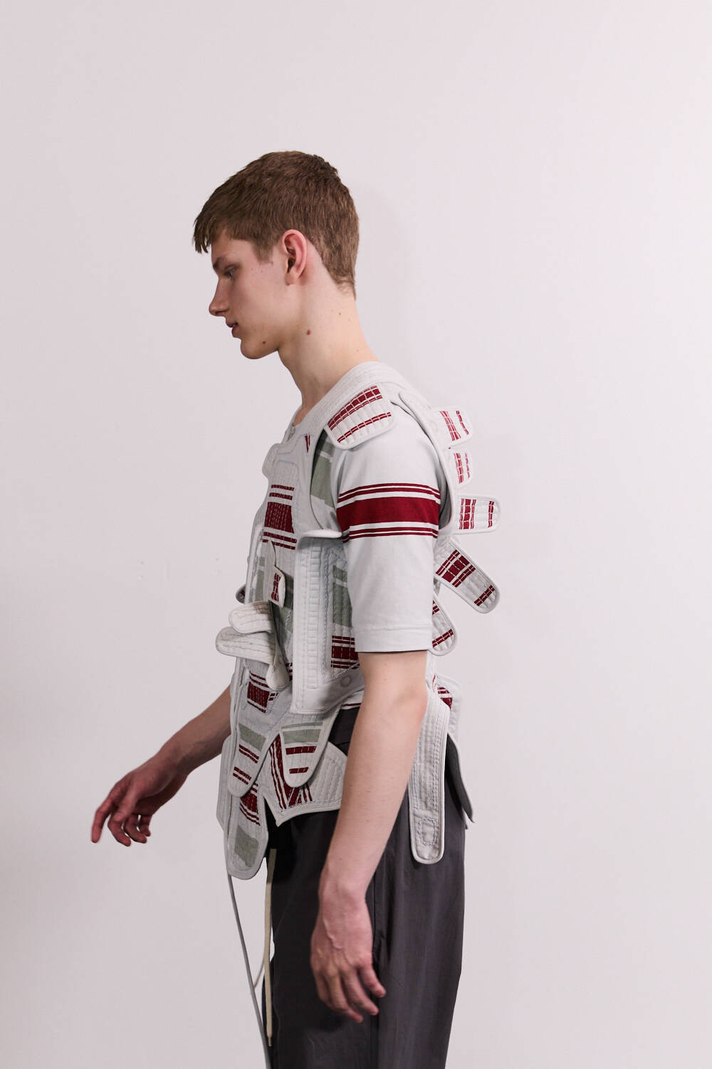 Over the last 10 years, Green’s collections have tackled the complex notions of modern masculinity via protective gear, workwear and experimental wearable sculptures. Here he dissected leather protective vests, cutting and reworking patches into swollen biker jackets made alongside ECCO.Kollektive that looked like the anatomical making of the human form. There were two collaborations threaded throughout: clever, double-collard polo shirts with Fred Perry and Eastpak backpacks equipped with tentacle-like straps that danced as the models walked through the space.