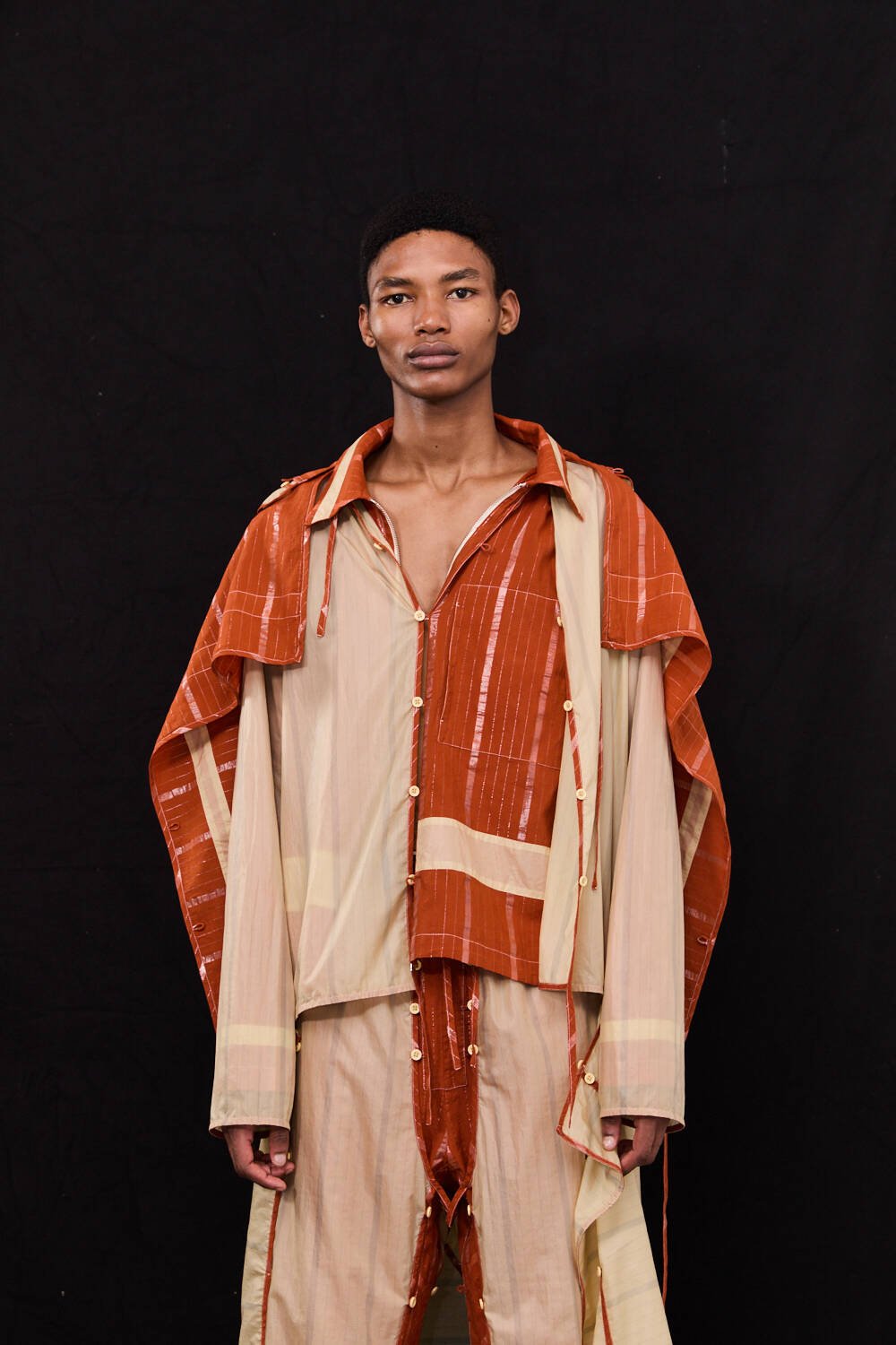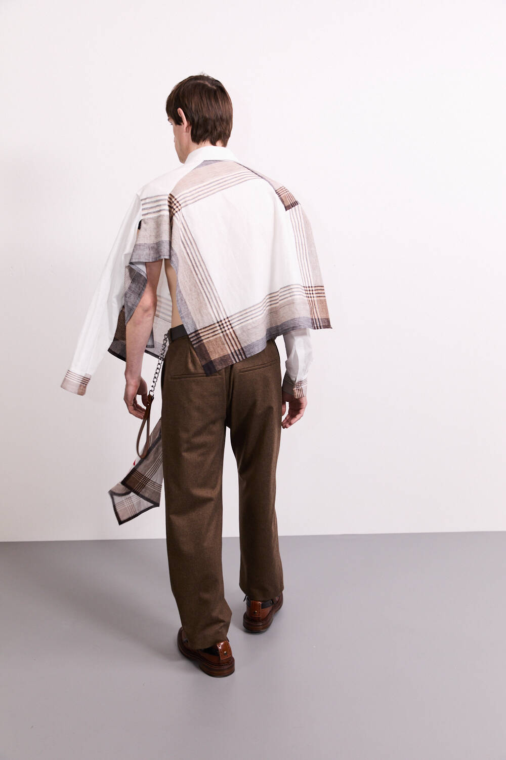 A series of shirts featured childlike depictions of diggers and fire engines. “They’re like traditional codes of masculinity,” said Green. “It’s strange how in children’s bedrooms they have pictures of tractors, fire engines and cement mixers from the day you’re born.” The shirts came cut in a handkerchief-style finishes. “My dad was never someone that had a handkerchief, neither was my granddad, but I like the idea of something so simple, like a square of fabric, having so much meaning.” He likened such to patchworks families often make of the clothes that once belonged to relatives that have passed.