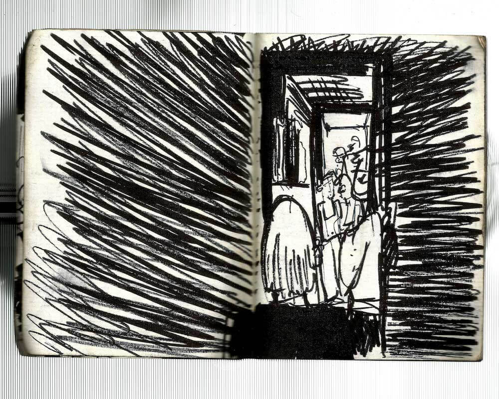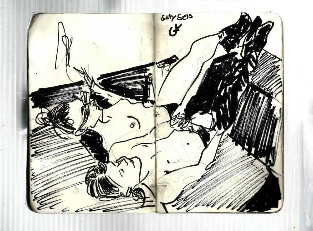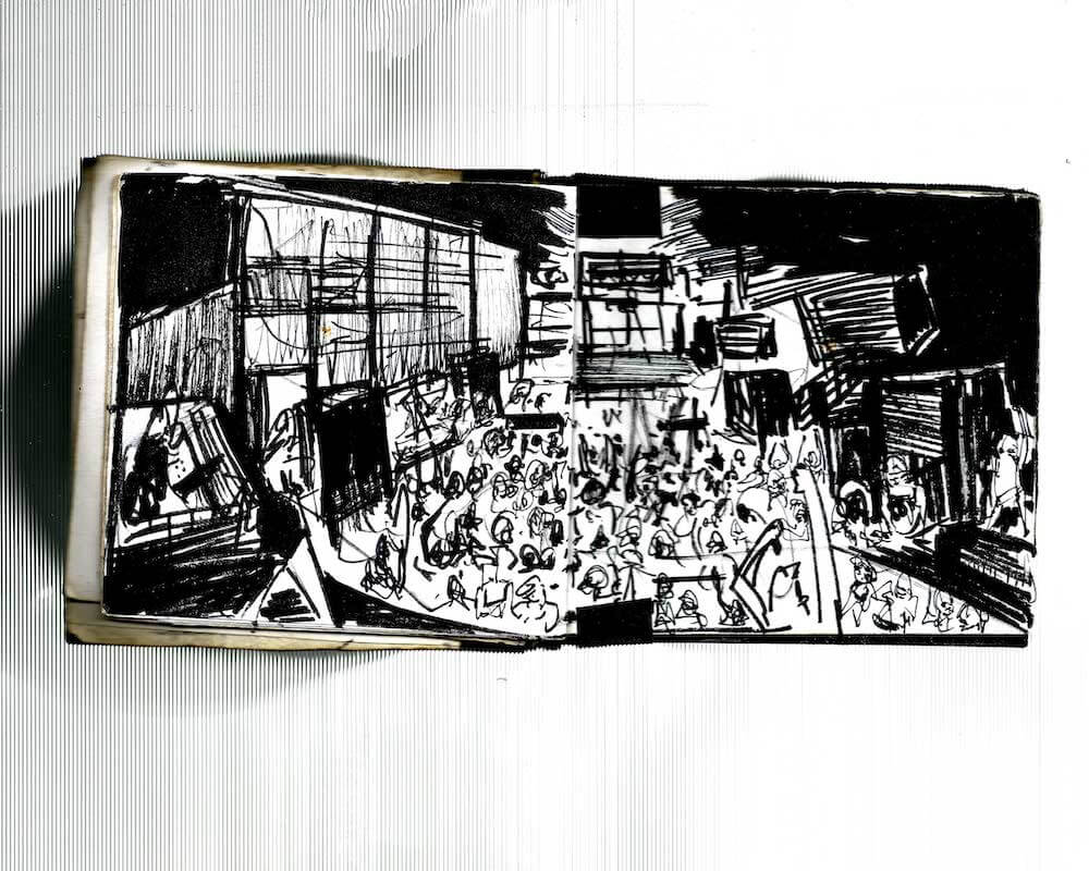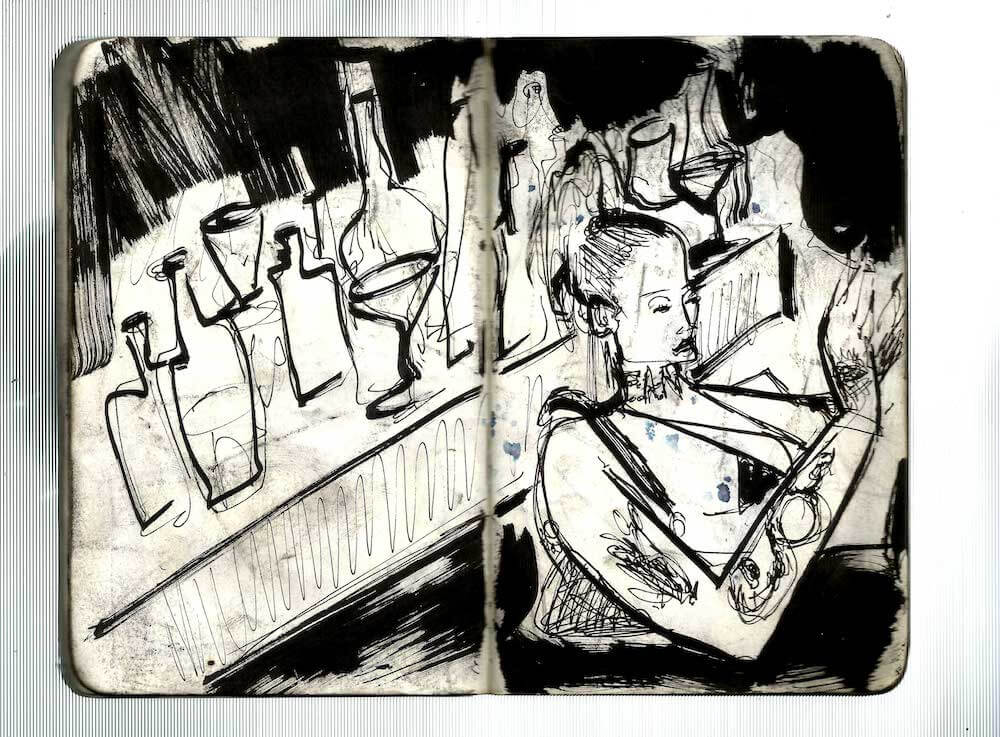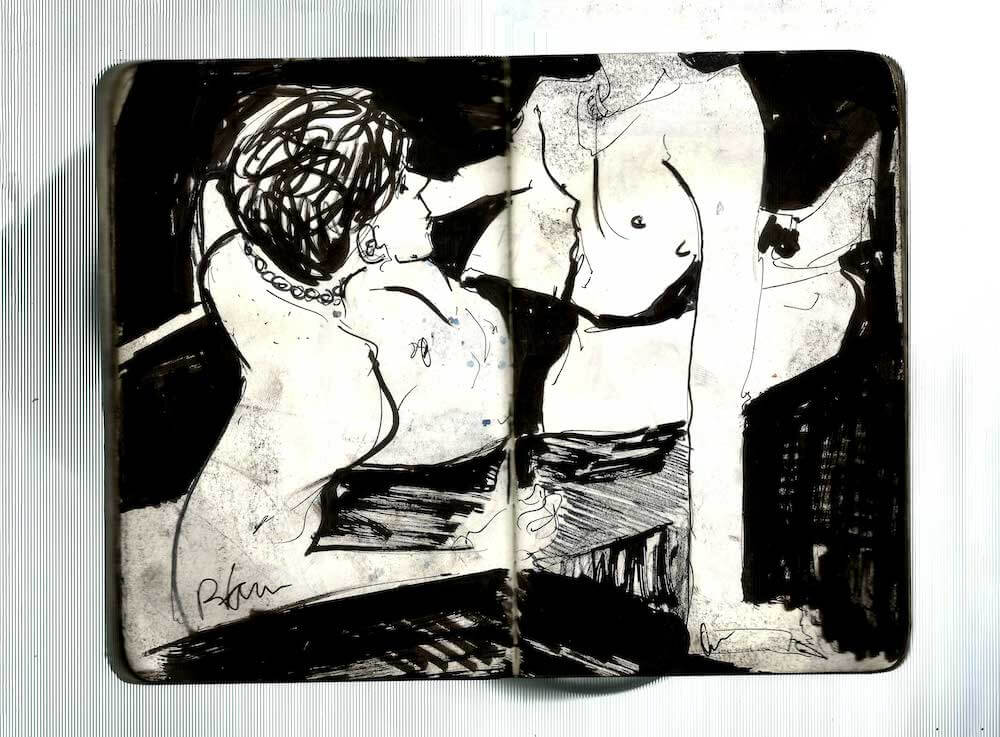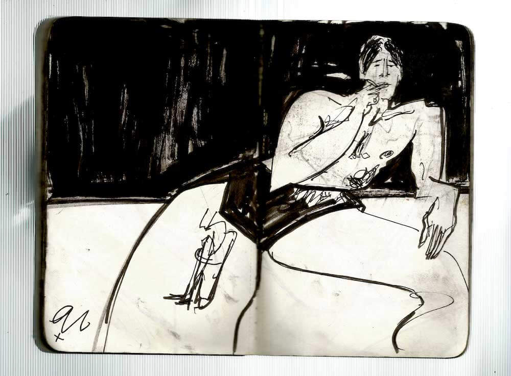 In his early Berlin years, Medina blew a lot of his money going out, “I was coming home exhausted and sad,” he says. His nightlife experiences became enriched once he began sketching: “My little sketchbook was full of experiences and people [I encountered]. It became a way for me to reclaim some power back in how I was going out.”