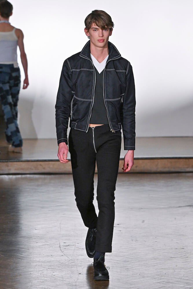 The CSM Menswear graduate further evolved his brand with a co-ed offering, breaking up the boyishness with mini dresses and A-line silhouettes. Then for the final four looks, a series of silk organza headpieces by Noel Stewart, inspired by The Rolling Stones’ 1973 Goats Head Soup album cover, closed off the catwalk.