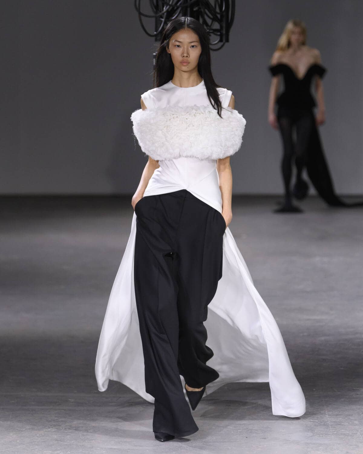 Silhouettes stayed predominantly on the slinky side, as sheer tank tops were paired with satin trousers. Tops were largely low cut, evoking a welcome air of elevated sultriness. Accessories were a particular hit, with larger-than-life clutches nestled into elbows, each drenched in a cloak of feathers tbat fluttered in the wind. Party outfits a-plenty, Koma knows how to please his crowd.