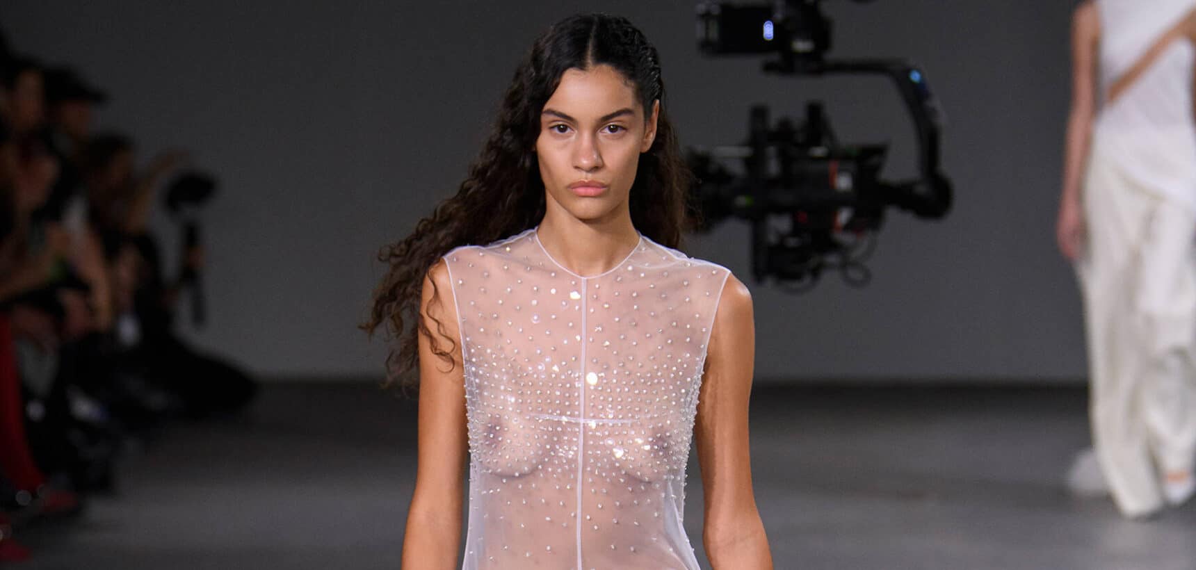 A dimly lit showspace, spotlighted with spheres of red and blue was the location of choice for David Koma’s AW24 collection. Interrupting the wide-reaching runway with two wire clusters that suspended moving cameras, the designer dressed his models in feathers, sequins and itty-bitty nipple covers, making the perfect uniform for a night spent on the tiles.