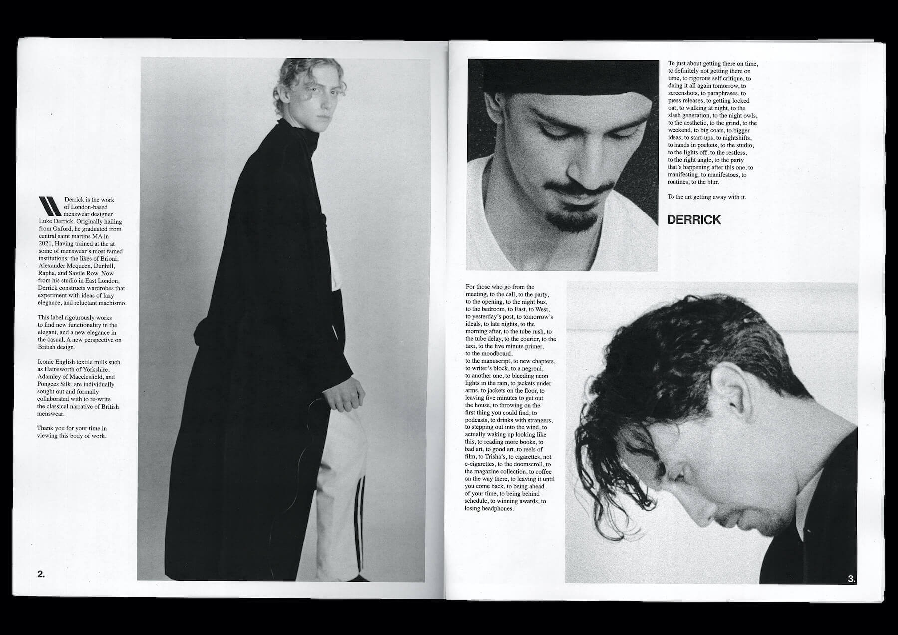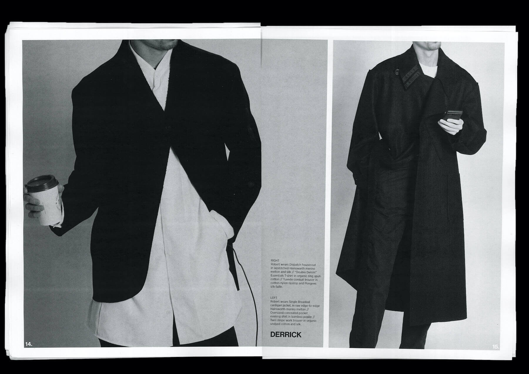 For the future, Derrick plans to continue taking “baby steps”, allowing his label to gain traction organically. “My brand is something that slowly grows and consistently reacts to the way we are living and those urban experiences and what garments are working on,” he says. “I’m the sort of person who spends a month on a jacket, rather than banging out six looks in 10 seconds – it takes time! I don’t think there is any point in rushing stuff. I’m just trying to enjoy the fact I’m not a mega global superstar yet; I’m just here in my box where I can experiment.”