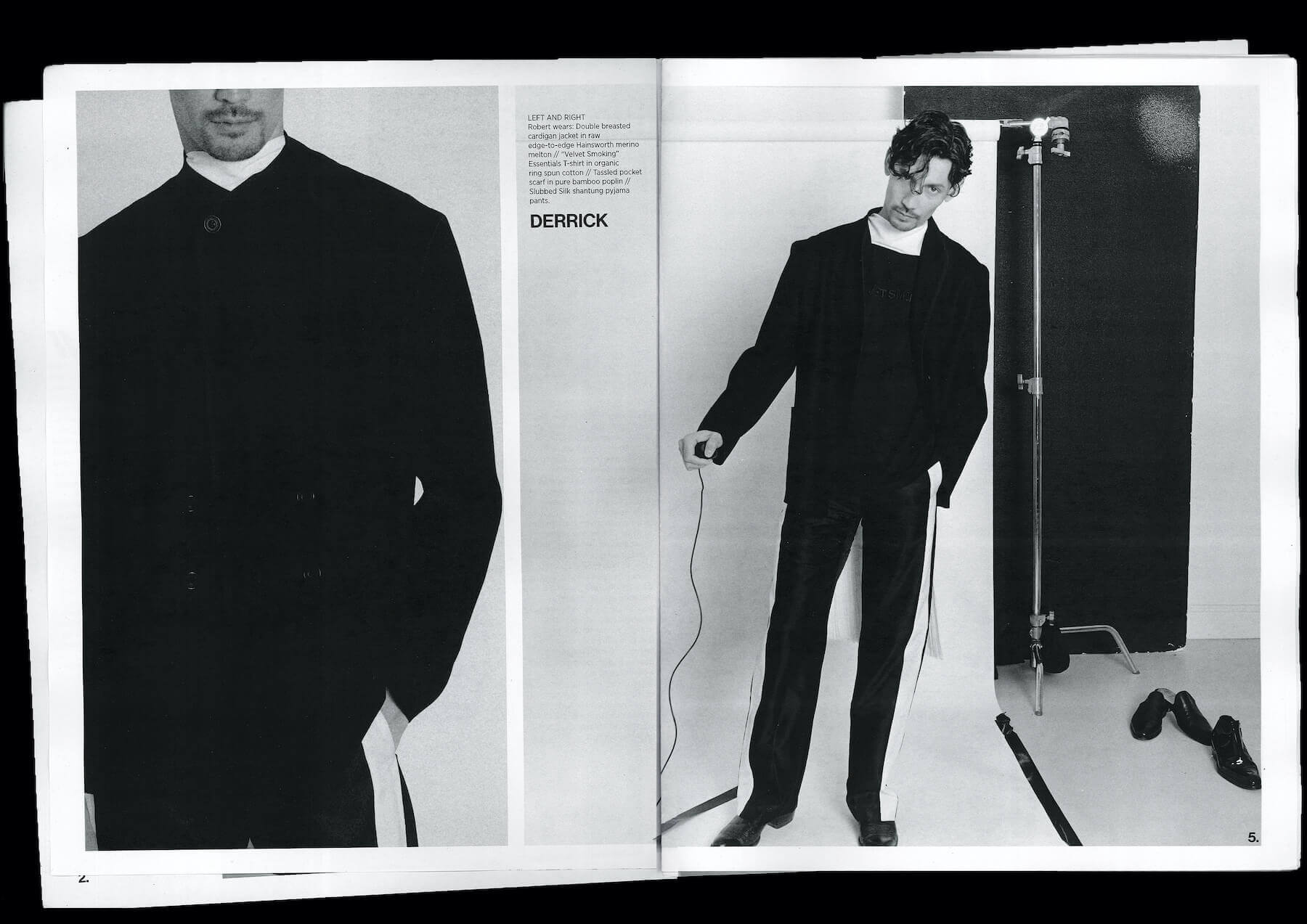 Meanwhile, Derrick’s mood boards are overflowing with vintage 60s imagery; the man in flux as he travels between events on a night bus, 90s airport photos of messy, tired passengers. It encompasses a kind of “dishevelled elegance” that translates into his clothes as an exploration of male archetypes in between destinations. “Instead of the James Bond idea – where you’re continuously ironing and getting changed – instead of trying to pretend that we are more organised and have our lives more together than we actually do, I put the idea of grabbing the first five things we see in our wardrobes at the centre of what I do. I like that challenge of, well there’s your wardrobe, find whatever and make it work.”