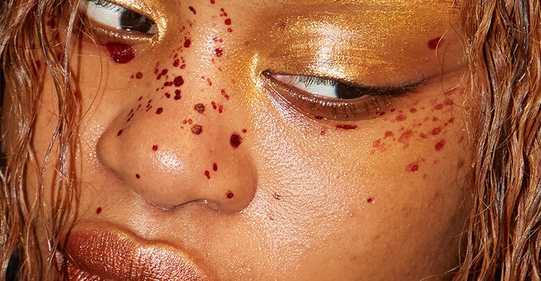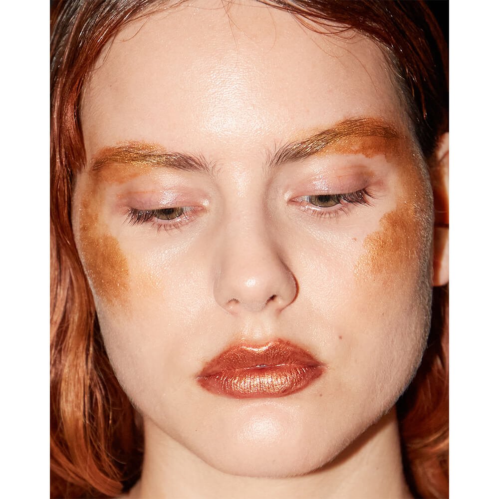 By dissecting these mythological references and jointly experimenting, Riley began to draw from parabolic tropes and bygone connections with the Earth. The result was a maquillage of transcendental gold. Messy, muddy strokes wisp across perfectly pointed Cupid’s bows, emulating the ceaselessness of the ever-changing seasons and bridging the gap between the fruitful and the famine.