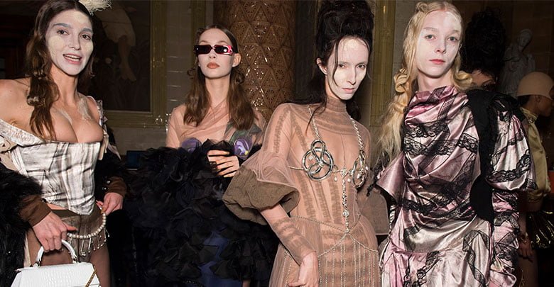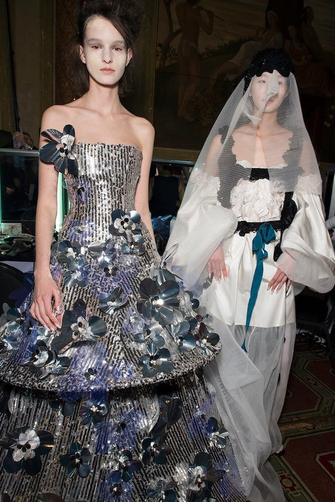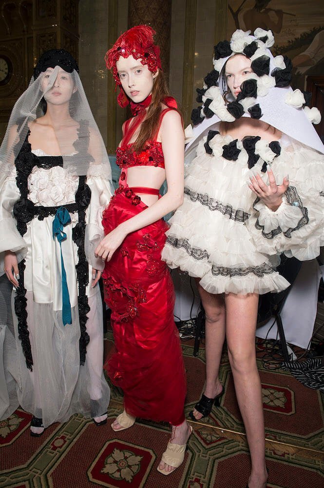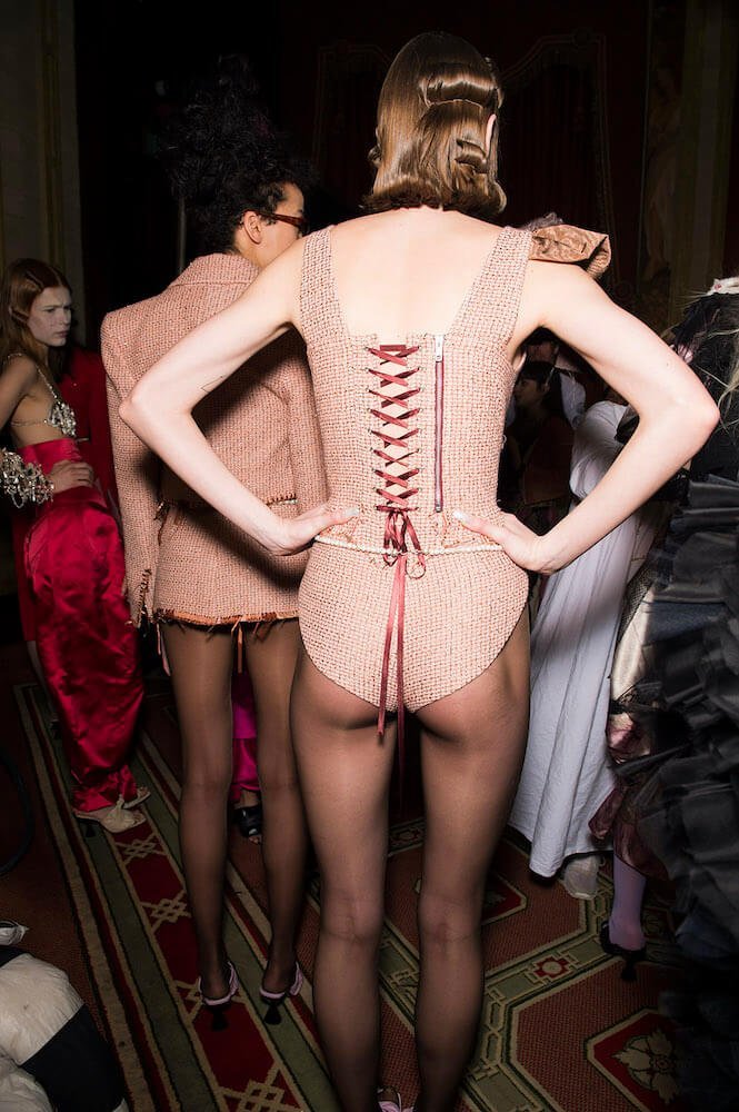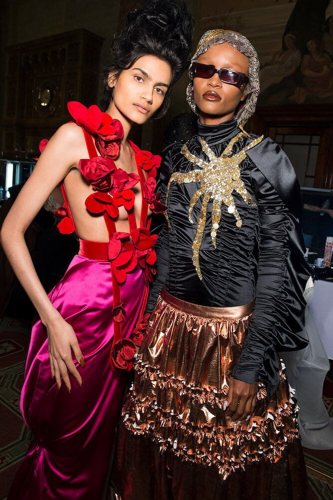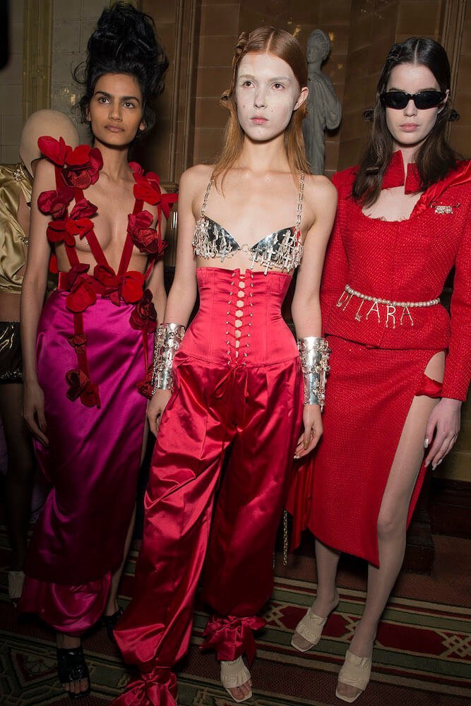 Dilara Findikoglu’s witchy woman is evolving. Victoriana will always be her first love but she’s also embracing tweed skirt suits – although they’re slashed to the hip bone and slung with a skinny pearl belt jangling with the letters of her name. A pink version of the suit came with a skirt so short it barely covered the model’s bum. Transgression is never far away in Dilara’s world. Sensual audacity is something she celebrates with her love of corsets (there were many great ones in this show) and championing of a distinctly feminine silhouette. She’s one of the the few designers – male or female – to show a sexually confident woman. But for all her muse’s power, transgression, glamour and self determination, Dilara also wanted to explore her vulnerable side with this collection.
