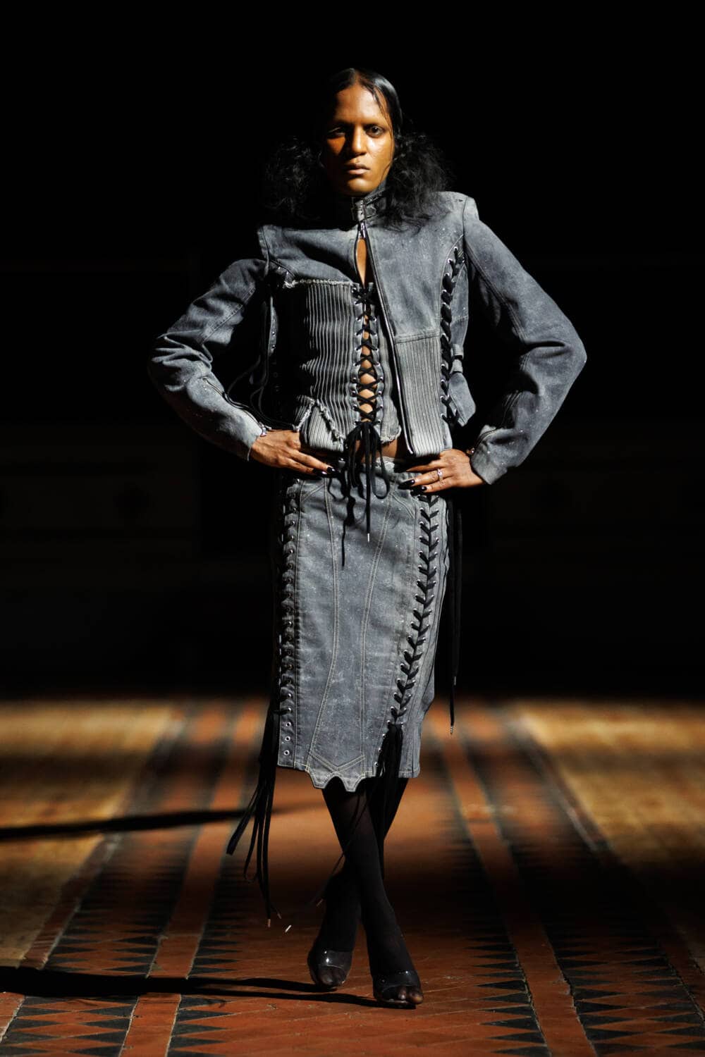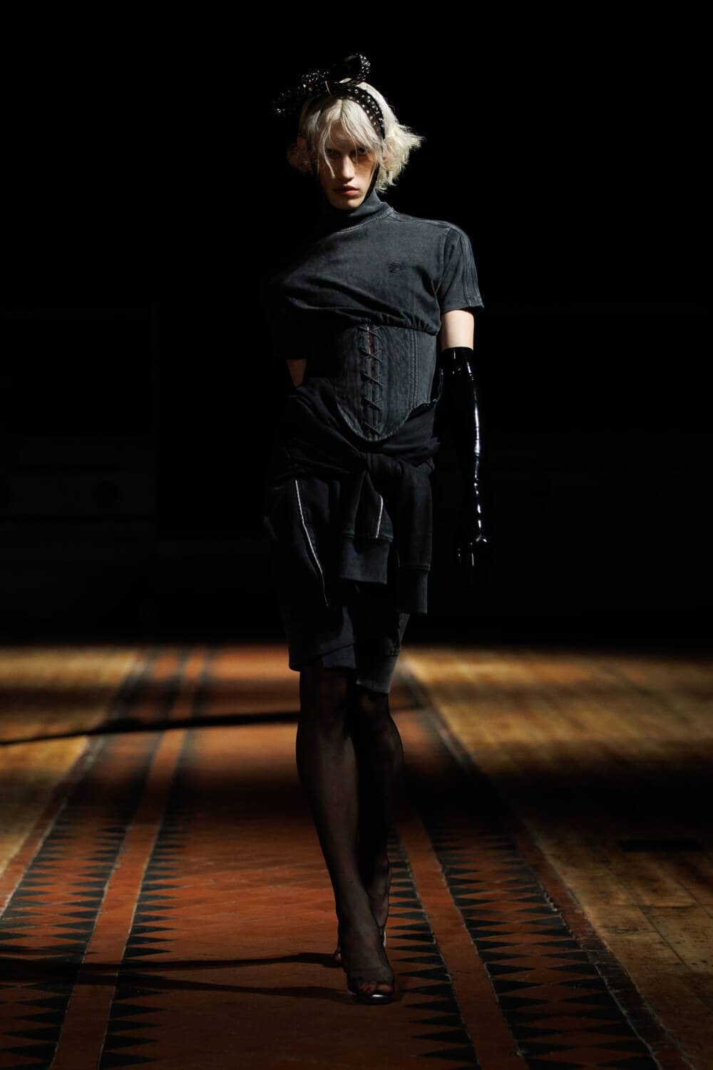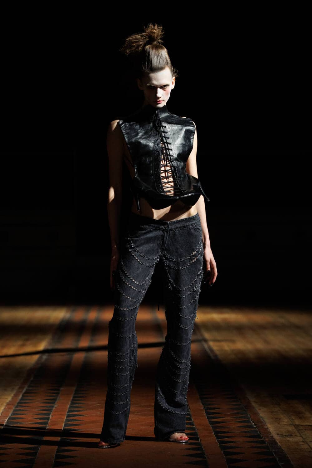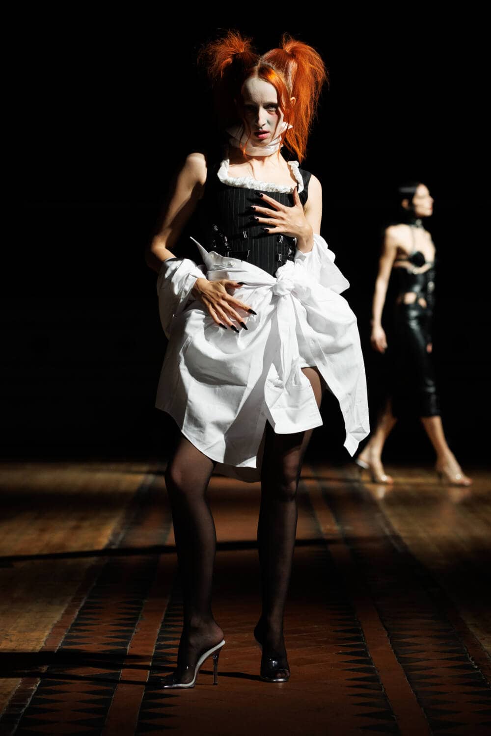 Corset lacing, cinched leather skirts, jeans and teeny-tiny hot pants; waspies, snatched waists; tight, pinstripe tailoring and white shirting were worn in disarray, in total disregard for convention and formal office rules. Elsewhere football tops were feminised with corset lacing. The looks were all named (‘Fragile Ego’, ‘Question of Time’, ‘Waking the Witch’) and each was accessorised with latex opera gloves and lucite mules. One model carried a newspaper with the headline “OMG Dilara Is Doing a Satanic Orgy at a London Church.”