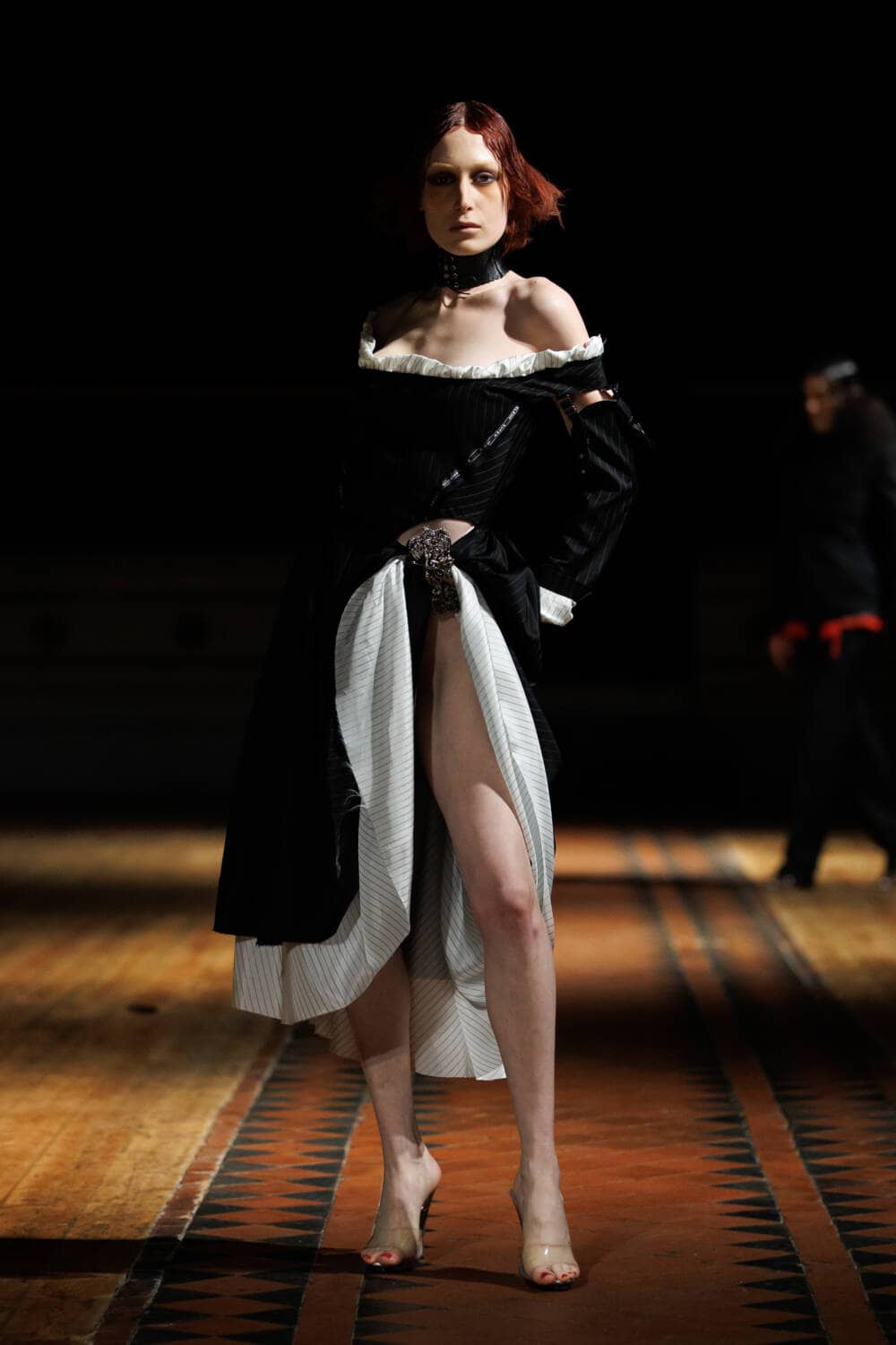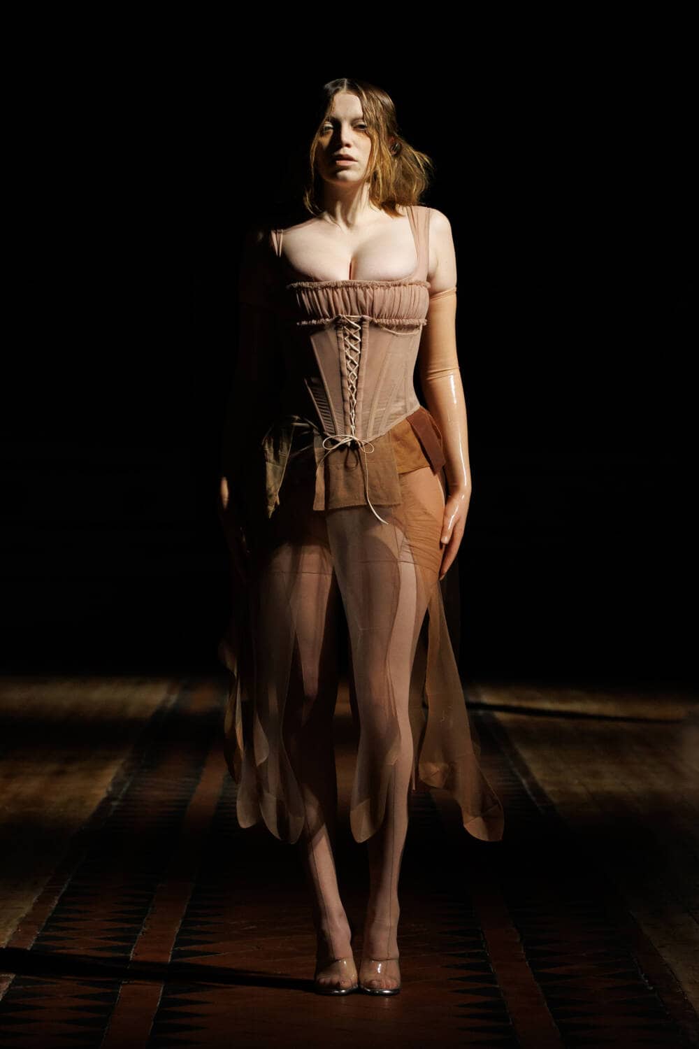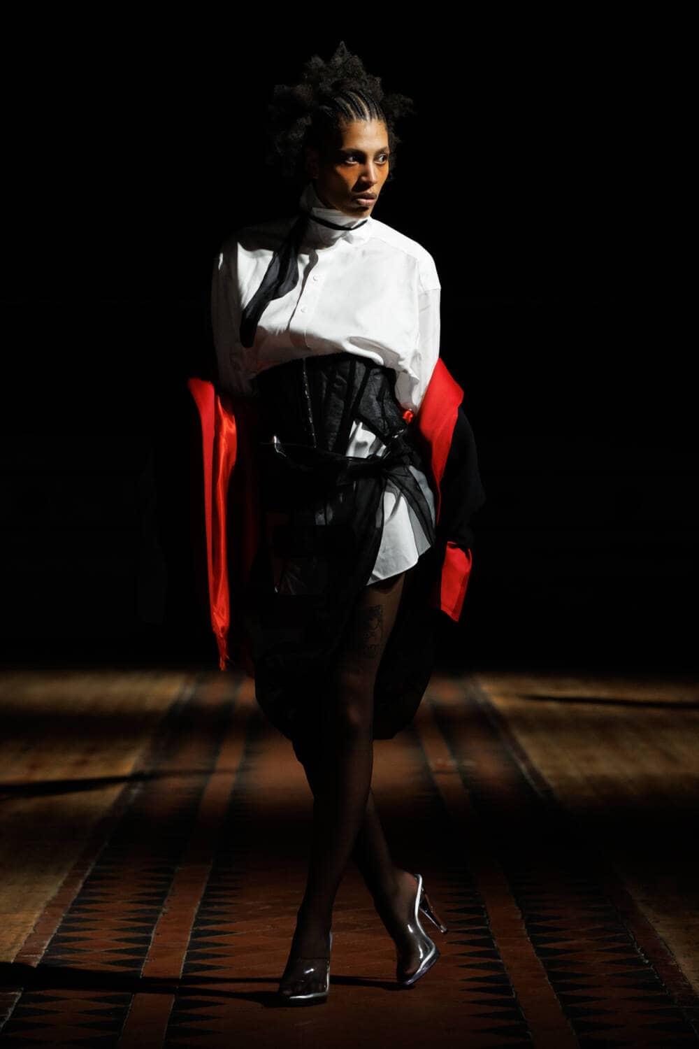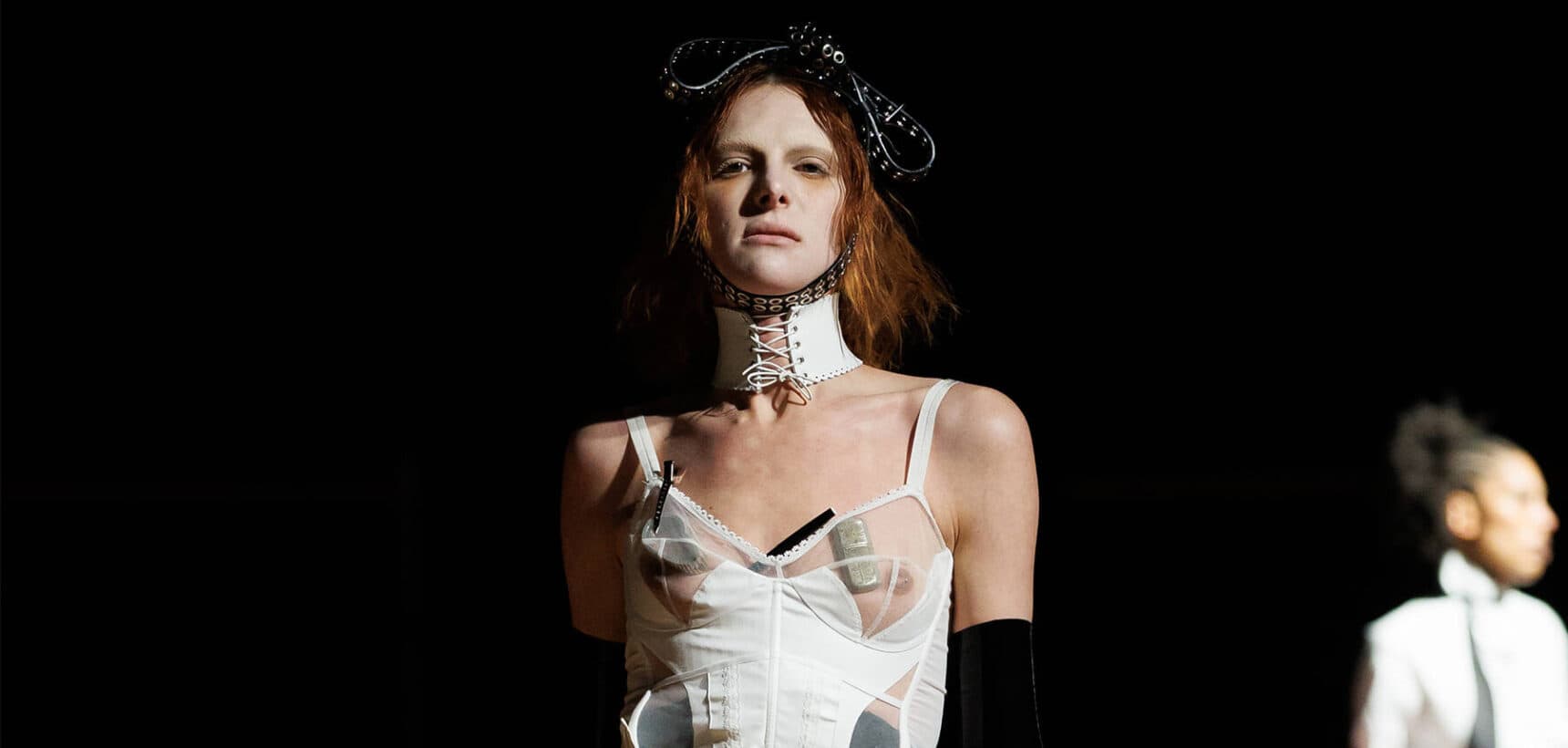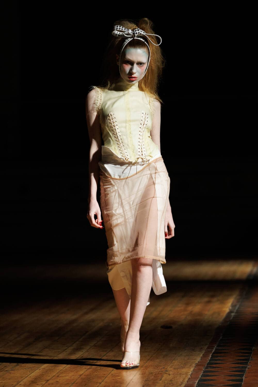 Corset lacing, cinched leather skirts, jeans and teeny-tiny hot pants; waspies, snatched waists; tight, pinstripe tailoring and white shirting were worn in disarray, in total disregard for convention and formal office rules. Elsewhere football tops were feminised with corset lacing. The looks were all named (‘Fragile Ego’, ‘Question of Time’, ‘Waking the Witch’) and each was accessorised with latex opera gloves and lucite mules. One model carried a newspaper with the headline “OMG Dilara Is Doing a Satanic Orgy at a London Church.”