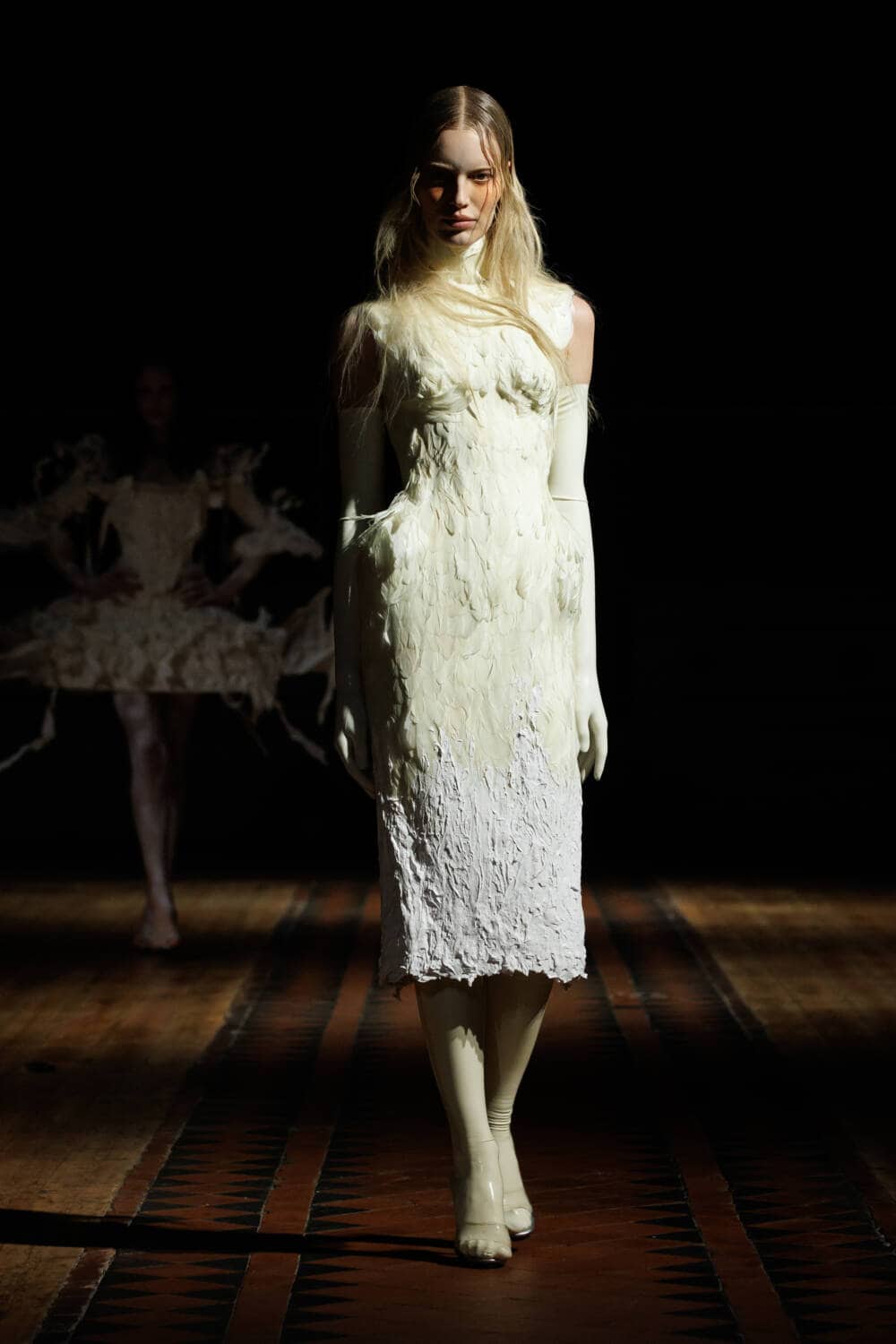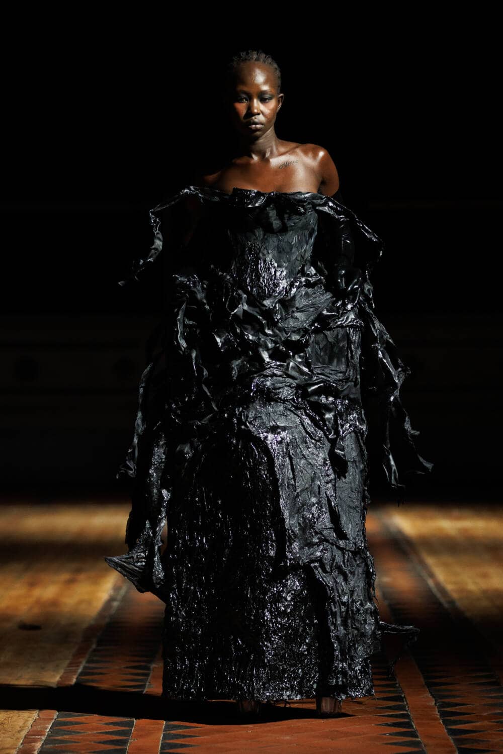 Speaking after the show, held in a soaring church in Shoreditch, the designer said this: “It’s about toxic masculinity – and being beyond it: I feel like tonight we are doing a mass ritual to end it. The collection is called Femme Vortex because I wanted to create a different reality, outside politics, borders, gender norms, any kind of systematic rules that have been created by hetero-patriarchal men. My previous collections were about fighting, about resistance. But I’m not fighting any more: I wanted to express divine feminine power somewhere beyond time, beyond reality, and beyond what is happening.”