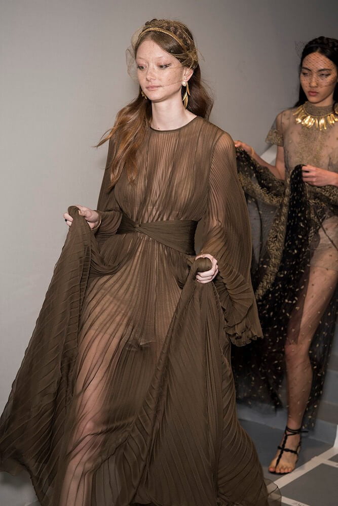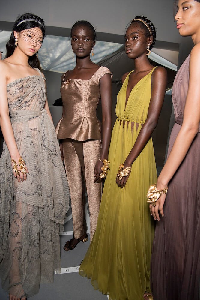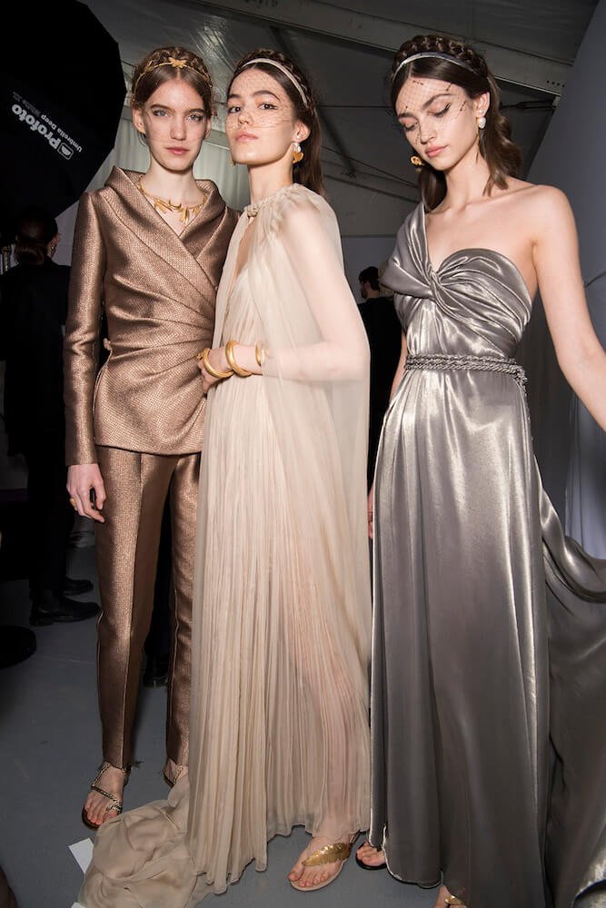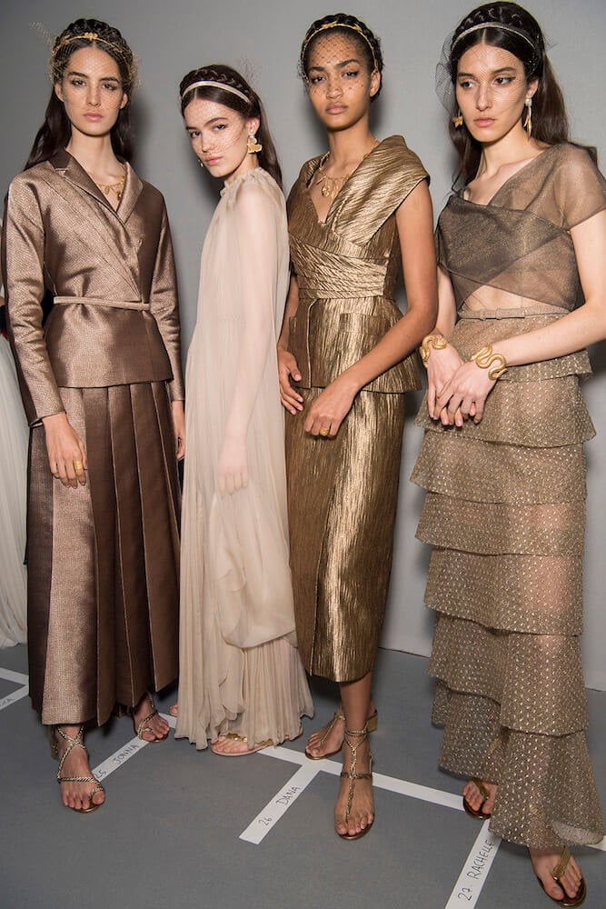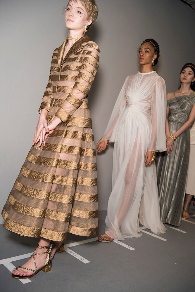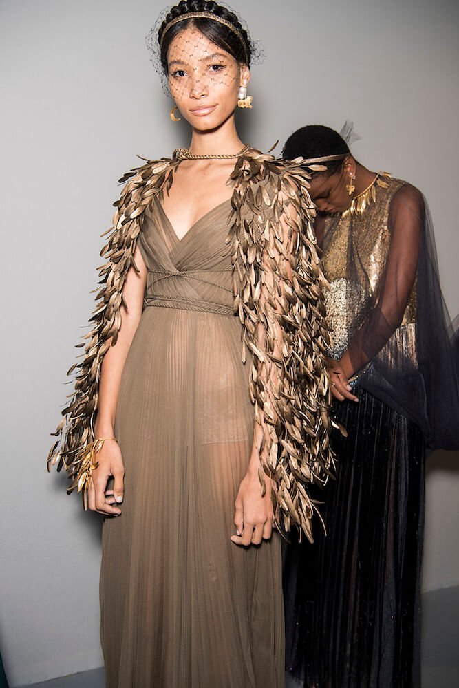 Chiuri took inspiration from the goddesses of Ancient Greece and the couture workmanship was awe-inspiring. Chiuri directed the Dior atelier to drape and gather chiffon into glorious gowns worthy of Athena. Swishing, golden fringe dresses shimmered down the runway as their easy grace belied their complex construction. An embroidered opera coat was made of cloth of gold. Chiuri found new ways to work the signature hourglass Dior silhouette cutting glinting, gilded cloth, in curving swathes around the body. It was light as mist and some gowns were so sheer that they came with their own matching chiffon bras and boxer shorts beneath. Chiuri found strength in delicacy. The models walked, sure footed and confident, in their flat, gold rope sandals and wore golden bands in their plaited hair. The power of elegance is marvellous to behold. Backstage, Chiuri spoke of her own activism and a desire to inspire a new generation of young women to follow big dreams, take charge and rule the world.
