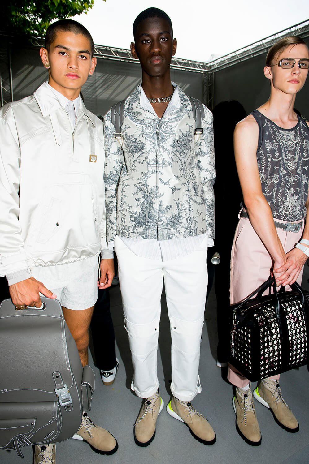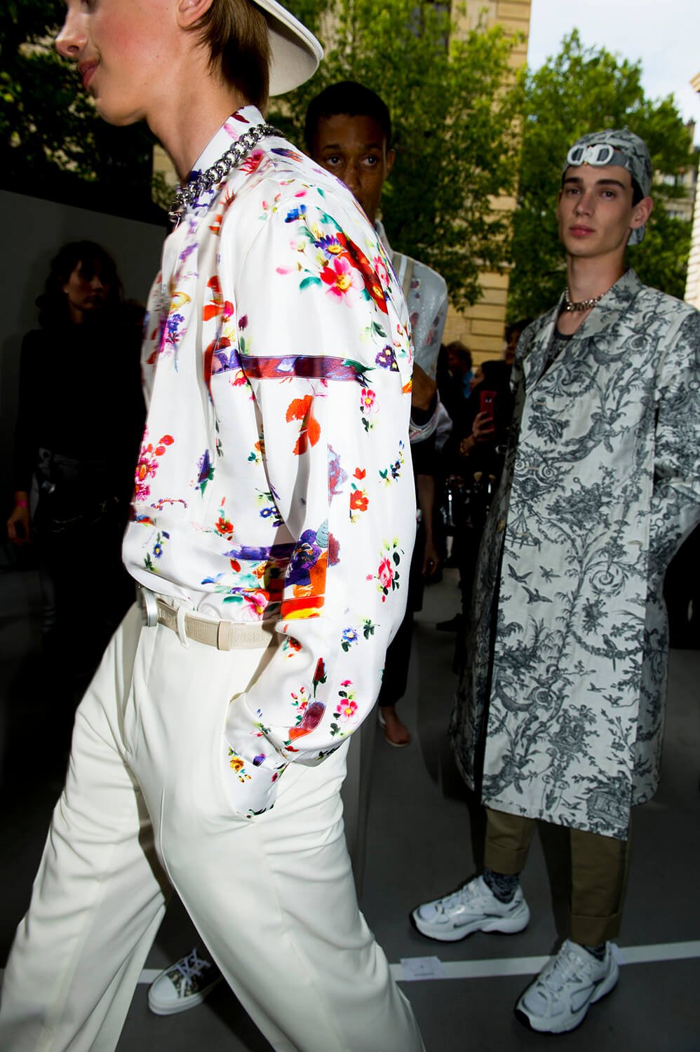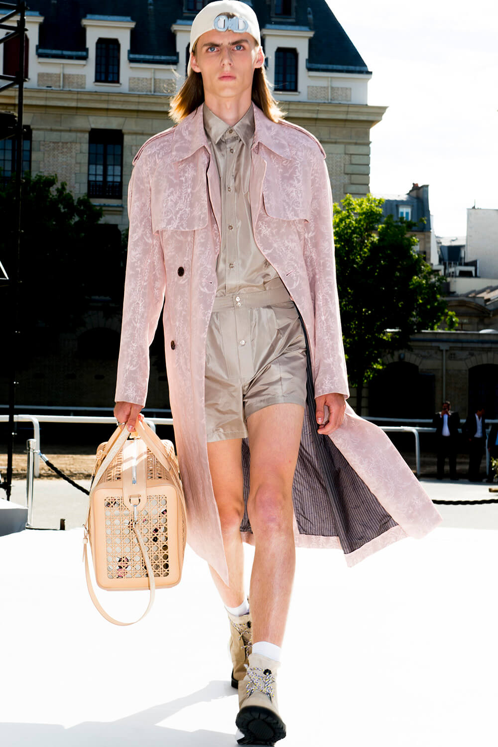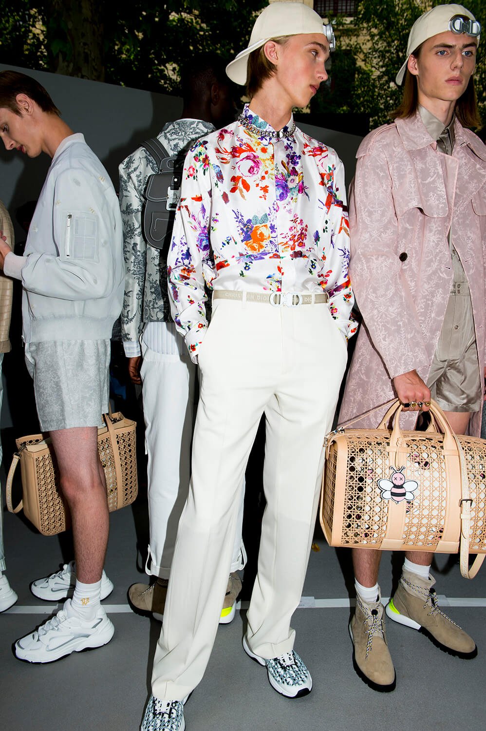 The designer Kim Jones has been releasing snapshots of his collaboration with the artist Brian Donnelly for the past few days on Instagram. Today the prolific social media fan enlisted his friends including Kim Kardashian A$AP Rocky and Skeptagram to pose with Donnelly’s knitted Kaws dolls, the dolls were wearing tiny black Dior Homme suits. Donnelly is the kind of contemporary artist and personality Jones has on direct dial; the two are also good friends. Jones is a truly modern designer who embraces contemporary culture and has an instinctive feel for what’s happening in the great “out there” before it reaches the rest of us. He surrounds himself too with a raft of creatives like his friend and jewellery designer Yoon Ambush and the milliner Stephen Jones. They’re all part of the exciting network of talent he incorporates into his design world. And all that just adds to the anticipation and excitement surrounding Jones’ first show as the new Creative Director of Dior Men. ‘Kim Jones fuses reference to Haute Couture with sportswear’ read the show notes with ‘music by Diplo’. Translated on the catwalk this meant softer shaped suits with a rounded and elegant shoulder line; a shirt had a cowl neck at the back. Another section, based on M. Dior’s love of his garden had echoes of “femme fleurs”, a print used in his women’s couture line. Indeed the whole wardrobe had a couture sensibility. Jones has spent hours in the archive at Dior HQ looking at “the master’s” work and this afternoon it all came together in a cohesive modern wardrobe. A quick word on bags: bread and butter business at the French house. The saddle bag, that famous shape based on a horse’s saddle, and touted by celebrities galore in the ‘90s, and more recently resurrected for the Dior womenswear line to become summer’s new it-Bag, is now available for men, but this time it’s a bum bag in grey leather. The whole thing was a tour de force and exceptional in every way. We feel so proud of Kim Jones here at 10: he’s an incredible designer.