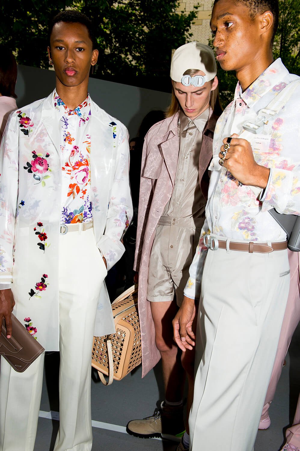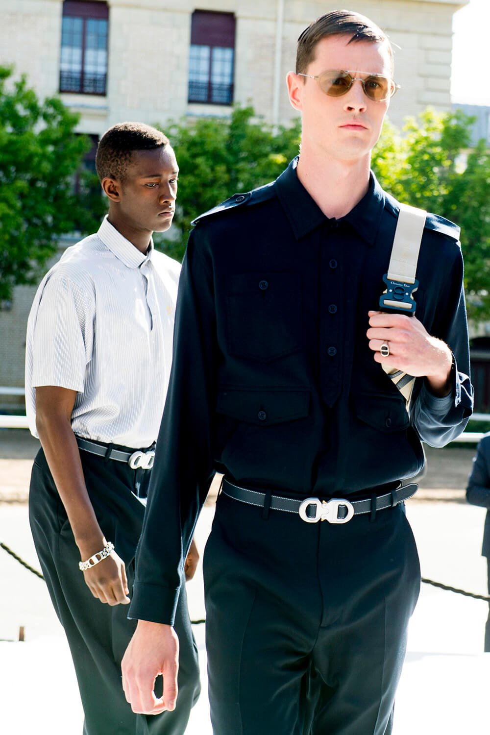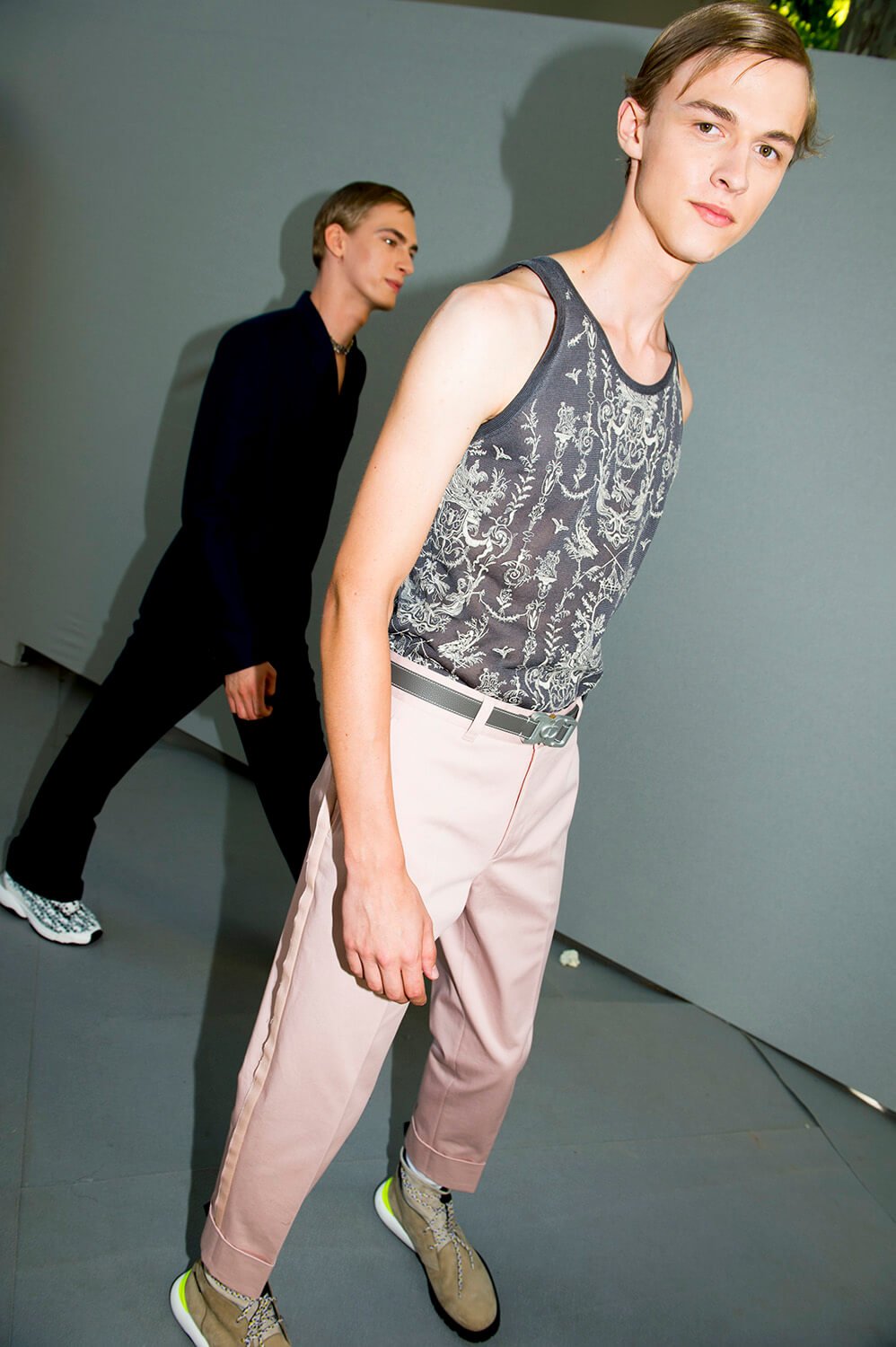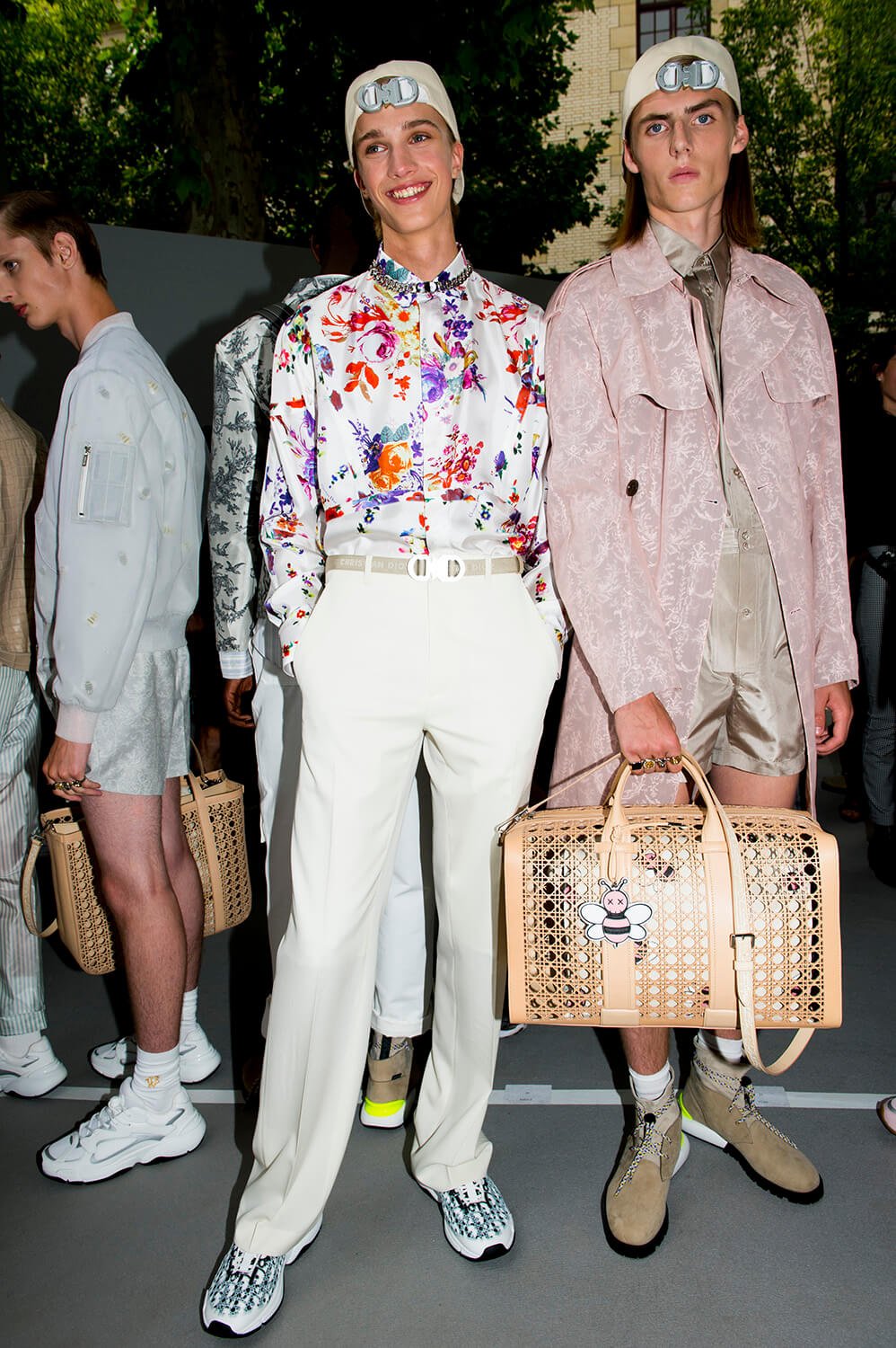 The designer Kim Jones has been releasing snapshots of his collaboration with the artist Brian Donnelly for the past few days on Instagram. Today the prolific social media fan enlisted his friends including Kim Kardashian A$AP Rocky and Skeptagram to pose with Donnelly’s knitted Kaws dolls, the dolls were wearing tiny black Dior Homme suits. Donnelly is the kind of contemporary artist and personality Jones has on direct dial; the two are also good friends. Jones is a truly modern designer who embraces contemporary culture and has an instinctive feel for what’s happening in the great “out there” before it reaches the rest of us. He surrounds himself too with a raft of creatives like his friend and jewellery designer Yoon Ambush and the milliner Stephen Jones. They’re all part of the exciting network of talent he incorporates into his design world. And all that just adds to the anticipation and excitement surrounding Jones’ first show as the new Creative Director of Dior Men. ‘Kim Jones fuses reference to Haute Couture with sportswear’ read the show notes with ‘music by Diplo’. Translated on the catwalk this meant softer shaped suits with a rounded and elegant shoulder line; a shirt had a cowl neck at the back. Another section, based on M. Dior’s love of his garden had echoes of “femme fleurs”, a print used in his women’s couture line. Indeed the whole wardrobe had a couture sensibility. Jones has spent hours in the archive at Dior HQ looking at “the master’s” work and this afternoon it all came together in a cohesive modern wardrobe. A quick word on bags: bread and butter business at the French house. The saddle bag, that famous shape based on a horse’s saddle, and touted by celebrities galore in the ‘90s, and more recently resurrected for the Dior womenswear line to become summer’s new it-Bag, is now available for men, but this time it’s a bum bag in grey leather. The whole thing was a tour de force and exceptional in every way. We feel so proud of Kim Jones here at 10: he’s an incredible designer.