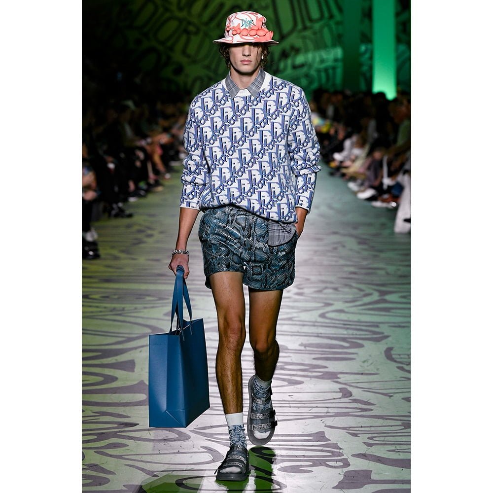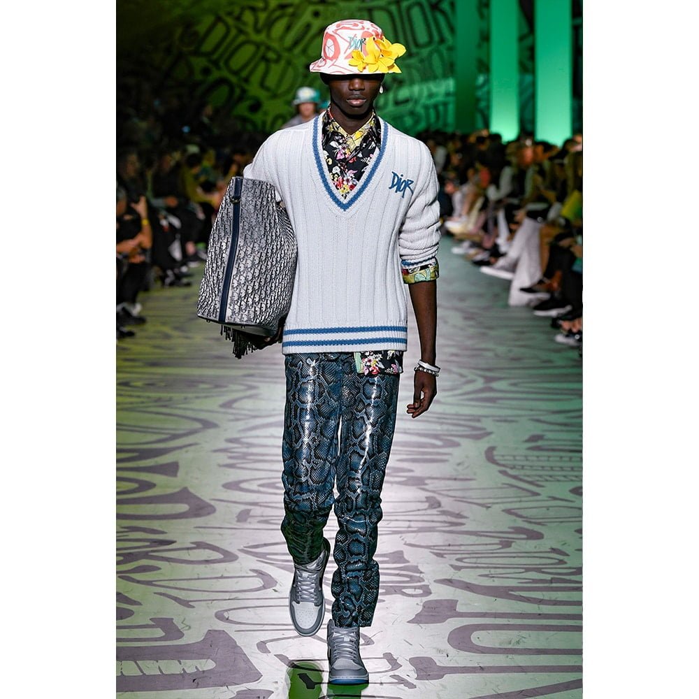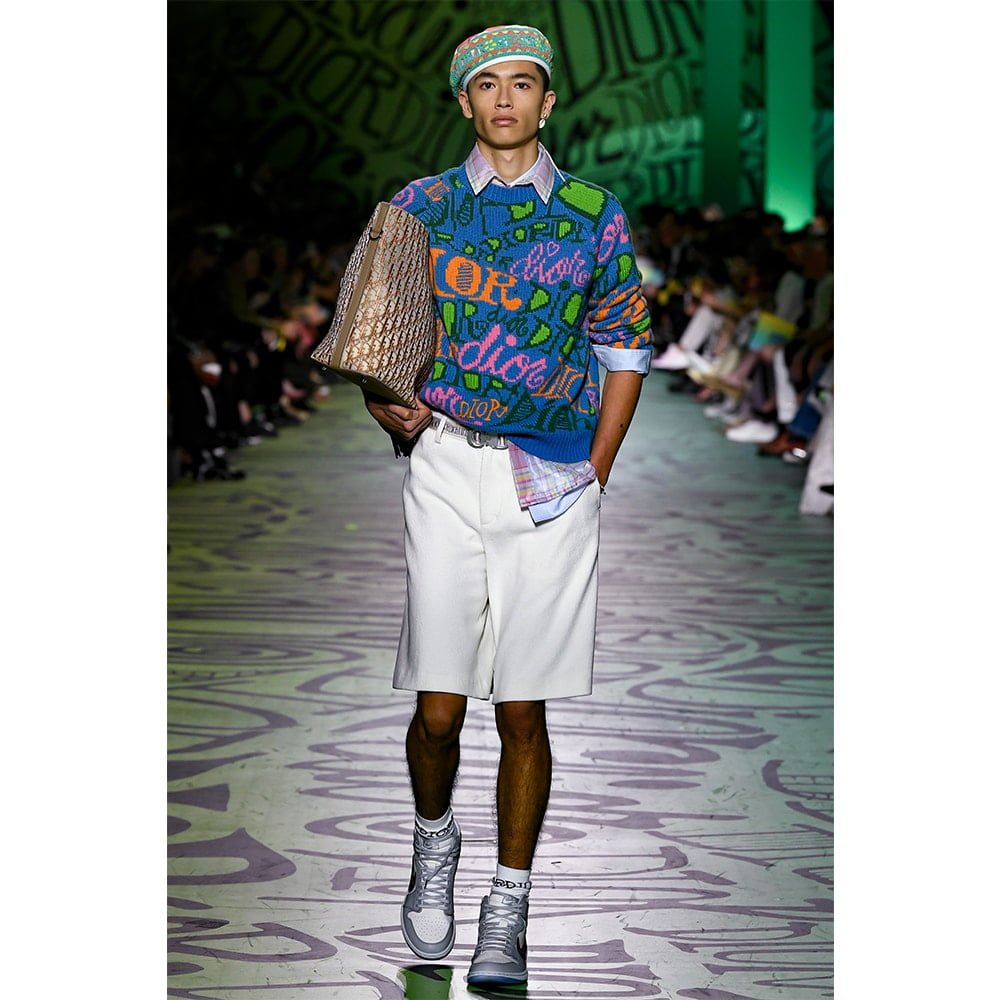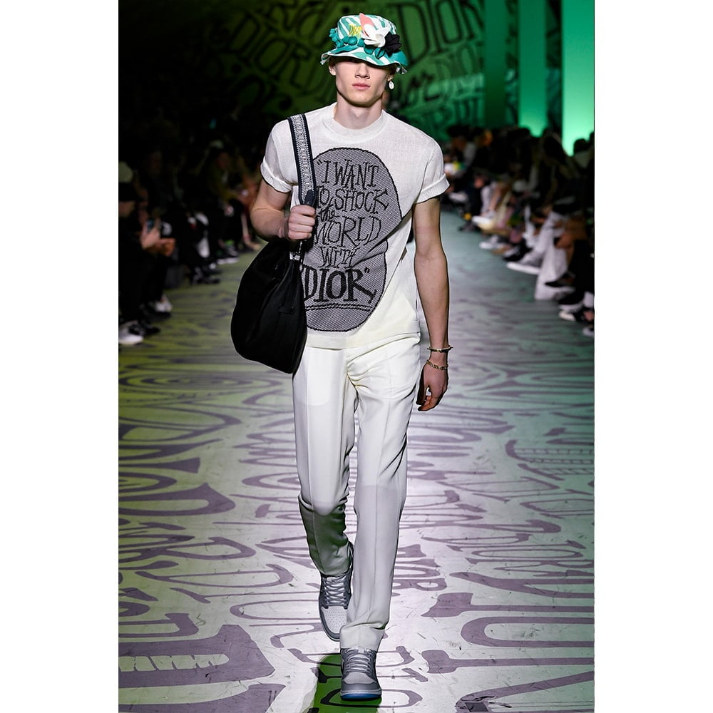 First look out on the turquoise-hued catwalk covered with hand-drawn logos reminiscent of Stussy’s signature font (more about that later) was a turquoise jumper with “Dior” written all over it, a pair of corduroy bermuda shorts, two patterned shirts layered over each other and a monogram print bag under-arm, with a crochet beret in contrasting colours on top. A lot to take in – or was it? The first impression might have been an eclectic mish-mash of silhouettes, colours and textures, but in fact, these pieces could easily be broken down into individual staples and introduced into just about anyone’s wardrobe. Part of that first look was also a trainer that made their rounds around the social media even before the show commenced – Air Jordan I High OG Dior, created in collaboration with Jordan Brand (who debuted the silhouette in 1985), will only be made in 8,500 pairs and is bound to become an icon of the resale market like the Supreme merch Jones presented during his time at Louis Vuitton.