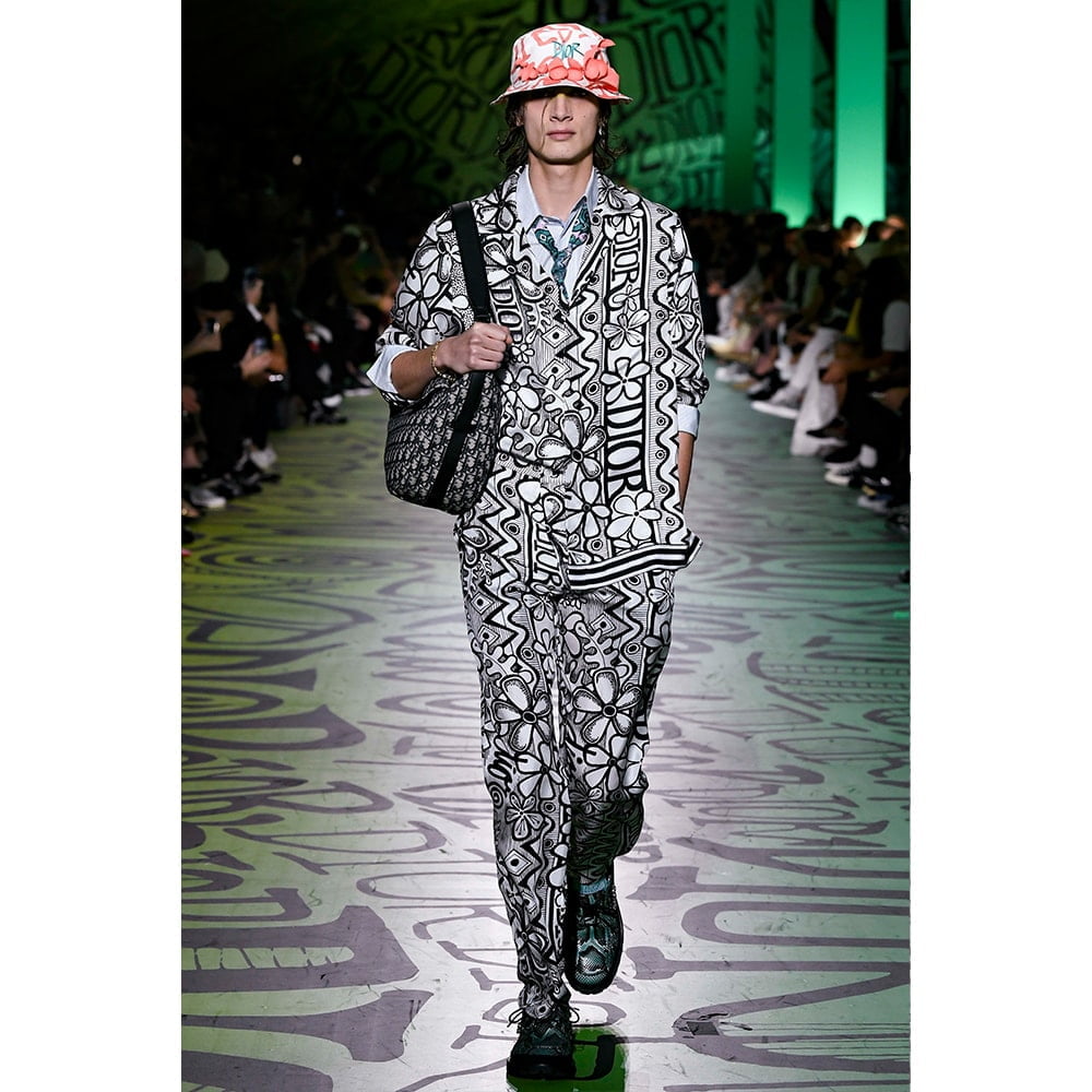 Another collaboration that debuted on the catwalk was the designer’s work with streetwear pioneer Shawn Stussy who brought in his own signatures into the convo. Not only through graffiti fonts and prints reminiscent of his surf merch brand founded during the 1980s, Stussy’s influence was seen on the more subtle beachy elements which hark back to those early days. Bucket hats with floral corsages as well as brooches and jewellery created by Ambush’s Yoon Ahn, all breathe with the irreverent spirit of Stussy’s hey-day of counter-culturing about. “Kim reached out to me through a very old mutual friend, Fraser Cooke. Fraser had worked with Michael Kopelman, who was my guy in London for many years. He inquired if he could give a buddy my number. When I asked who, he replied Kim Jones… I knew the name as we both come from the same circle of buddies, but from different eras. I was, of course, familiar with the Louis Vuitton collaboration he had done with my friend James Jebbia from Supreme. Kim called, and six months later we’re at the runway show in Miami. The world works in strange ways, as I have always believed,” Shawn Stussy told us.