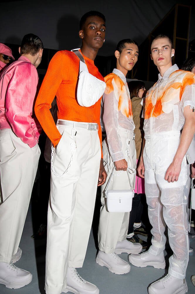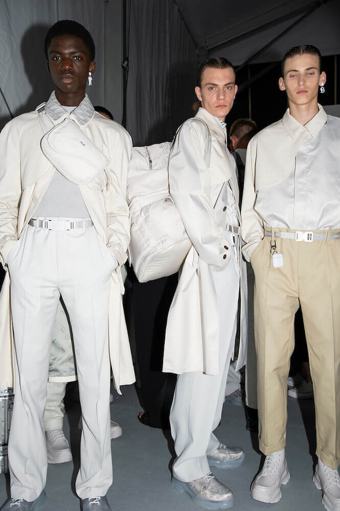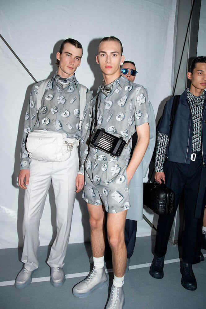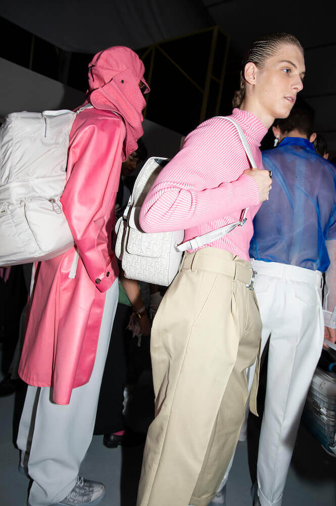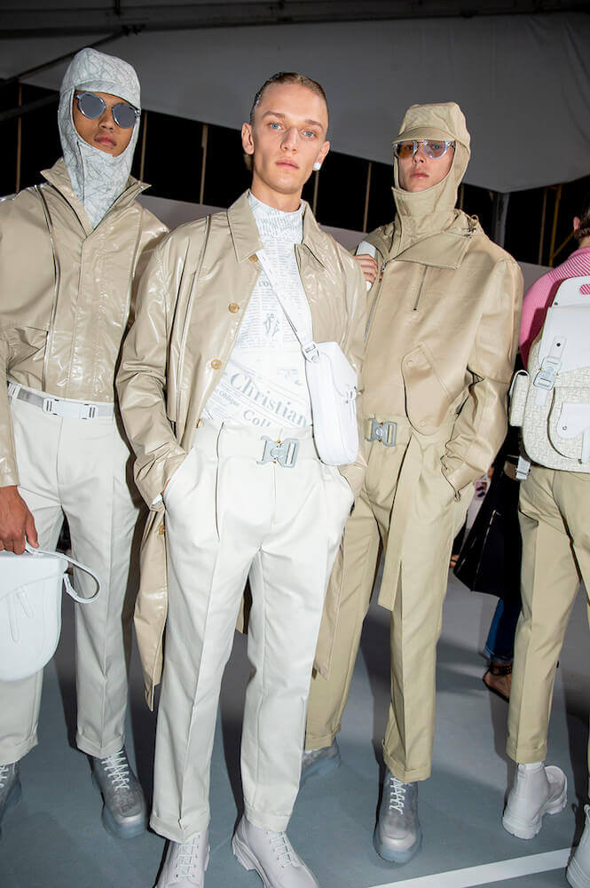 Upon walking into the Dior runway venue for designer Kim Jones’ SS20 show, guests were greeted by a reimagining of Christian Dior’s world and personal ephemera including his desk and a fireplace. These were created by the American artist Daniel Arsham. These “personal relics” were made to appear dusty as if entombed for millennia. It was a hint of Jones’ clothes and accessories to come. Inside the huge venue, and tracing the edges of a square made entirely from pink sand, 49 models walked 49 looks past huge letters spelling out DIOR. The letters were cast to look like decayed concrete with huge crystals poking through their broken surface.