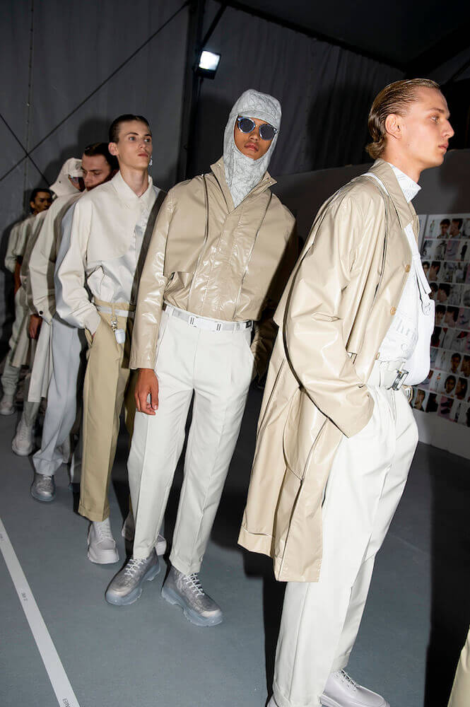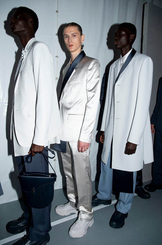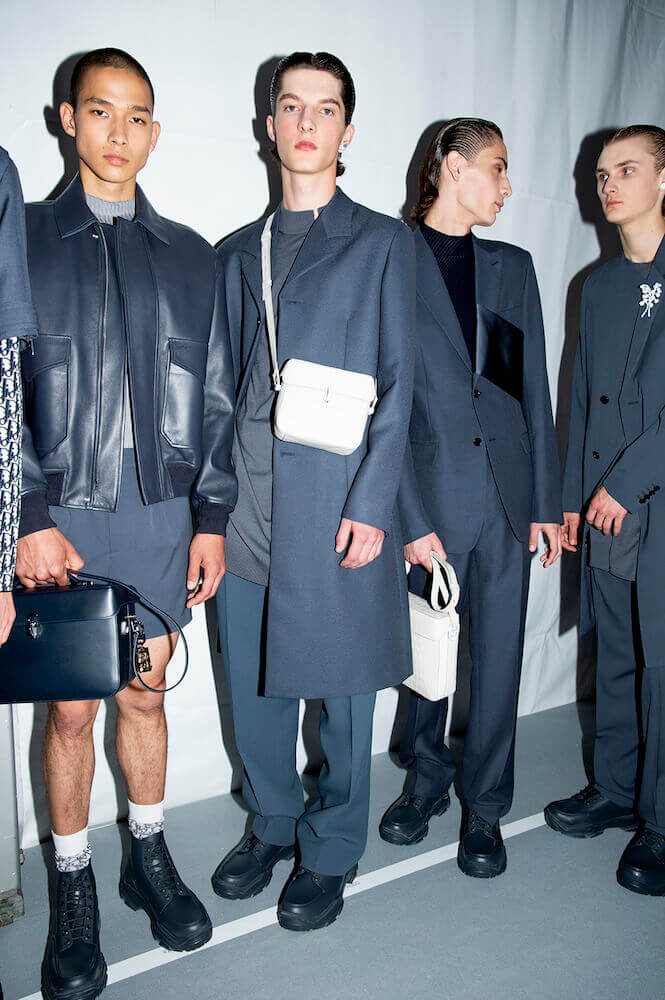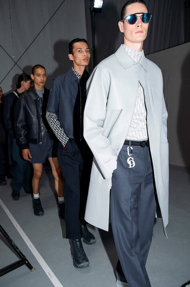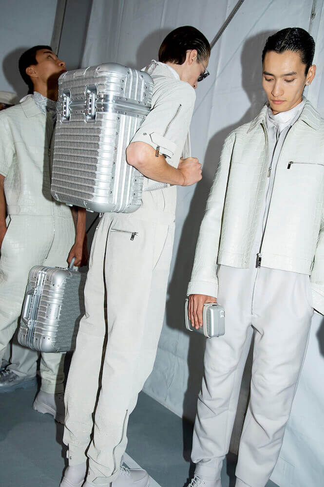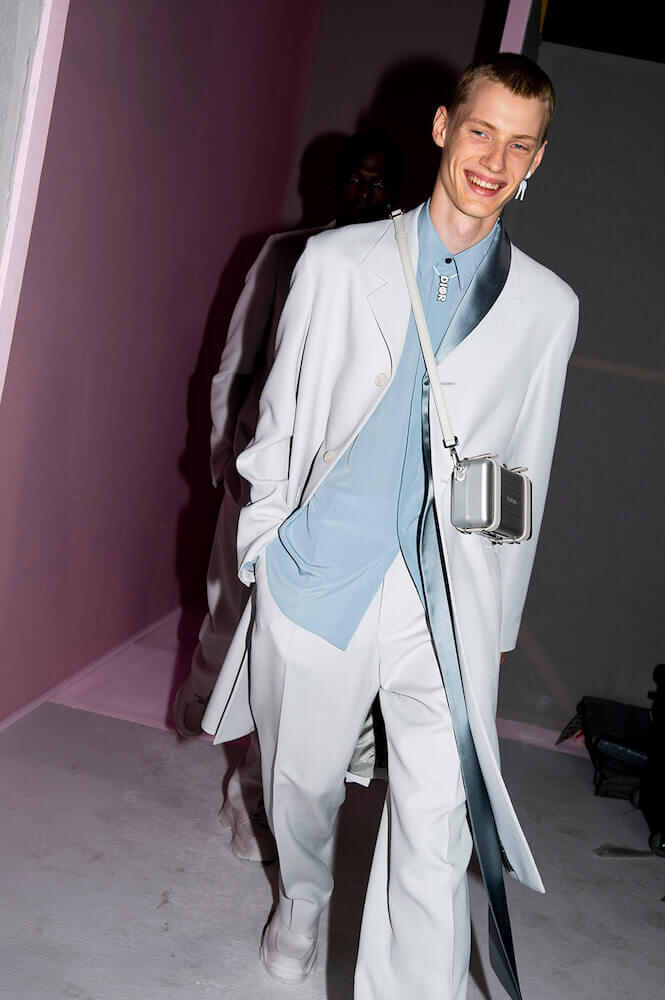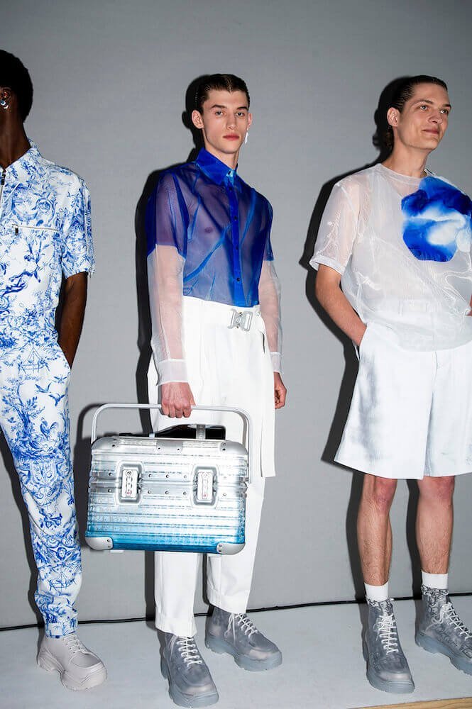 The business will thank him for his new collaboration with the German luxury luggage company Rimowa. Thanks to Jones, the classic ribbed aluminium (formerly untouchable) now comes with a unique reflective finish in a clutch; a backpack even a champagne case. They’re the kind of new-look accessories guaranteed to trigger his younger fans into frenzy. For these same fashion shoppers, Jones resurrected Dior’s own archival relics: the house Toile de jouy print became a boiler suit; the “John Galliano for Dior” newspaper print became a see-through shirt, matching trousers and saddle bag; even socks. But one piece, in particular, spoke strongest of the collection: a concrete-coloured long-sleeved sweater with ‘Dior’ printed on the chest. Jones had – someway, somehow – and using a particular technique, created “cracks”, which ran down the front and through the logo. A future relic for sure.