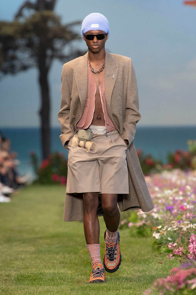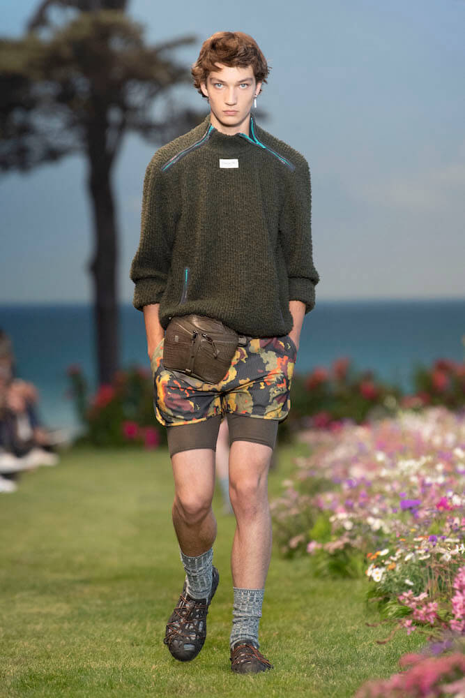 In a romantic palette of rose pinks, dusty blues and cream, Jones transported Grant’s artworks to couture-level knits, paired alongside wide-cut trousers, boyish shorts, and summer hats designed by Stephen Jones. Signature Kim Jones tailoring met elevated activewear in an attractive cocktail of contrasting styles which felt slick and modern. Like sharp-shouldered suit jackets paired with woolly socks and climbing shoes. Or ankle-length wellies and plaid anoraks which felt elegant and equipped for an expedition, all at once.