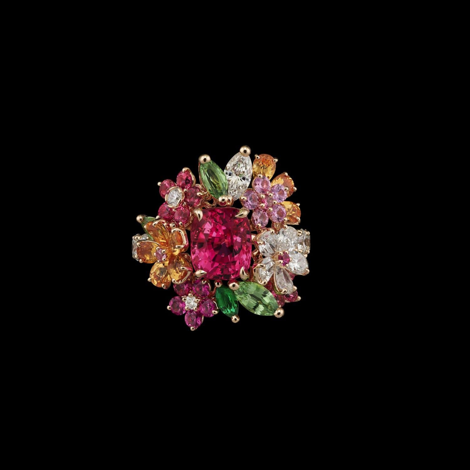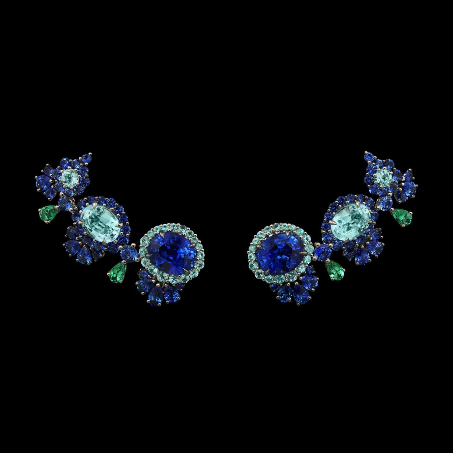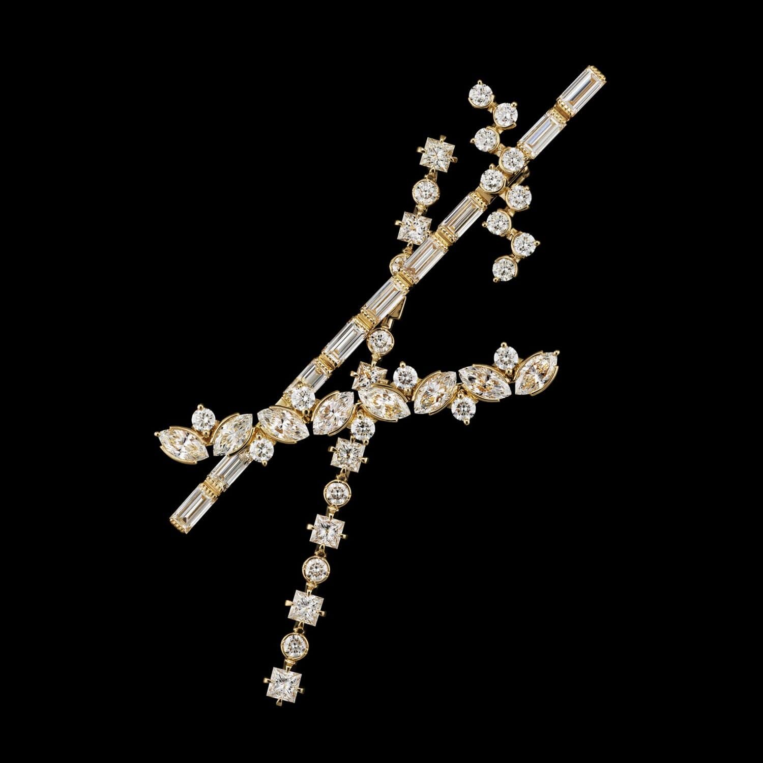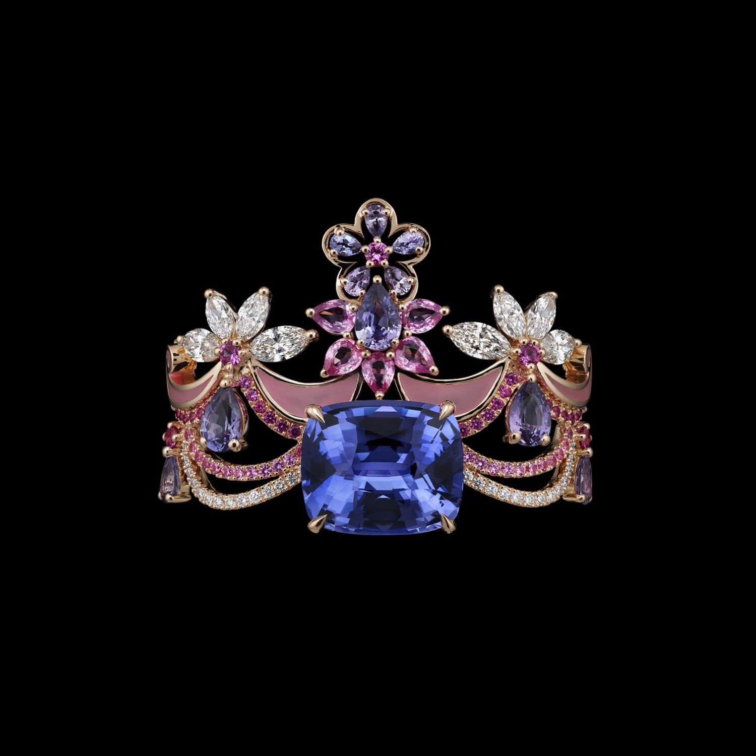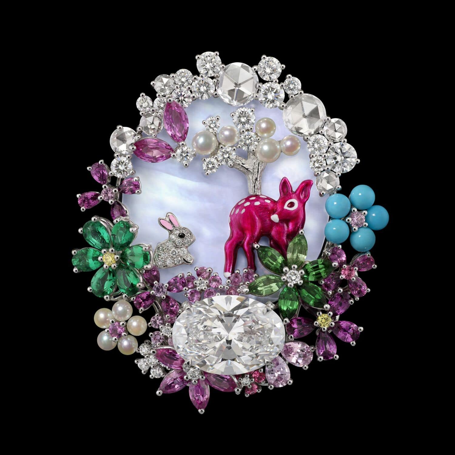 Many of the pieces are scene-like “windows,” flat, pictorial and framed in diamonds and gemstones opening successively onto tableaus of a childlike landscape, a vibrant garden or a miniature haute couture salon, offering a peek into Castellane’s dreamlike universe. Expect a wealth of brooches, necklaces, double-rings, ear cuffs, ear climbers, a tiara, a hair clip and several parures alongside show-only couture creations like belts, anklets and cufflinks, crafted to complement bespoke looks by Maria Grazia Chiuri.