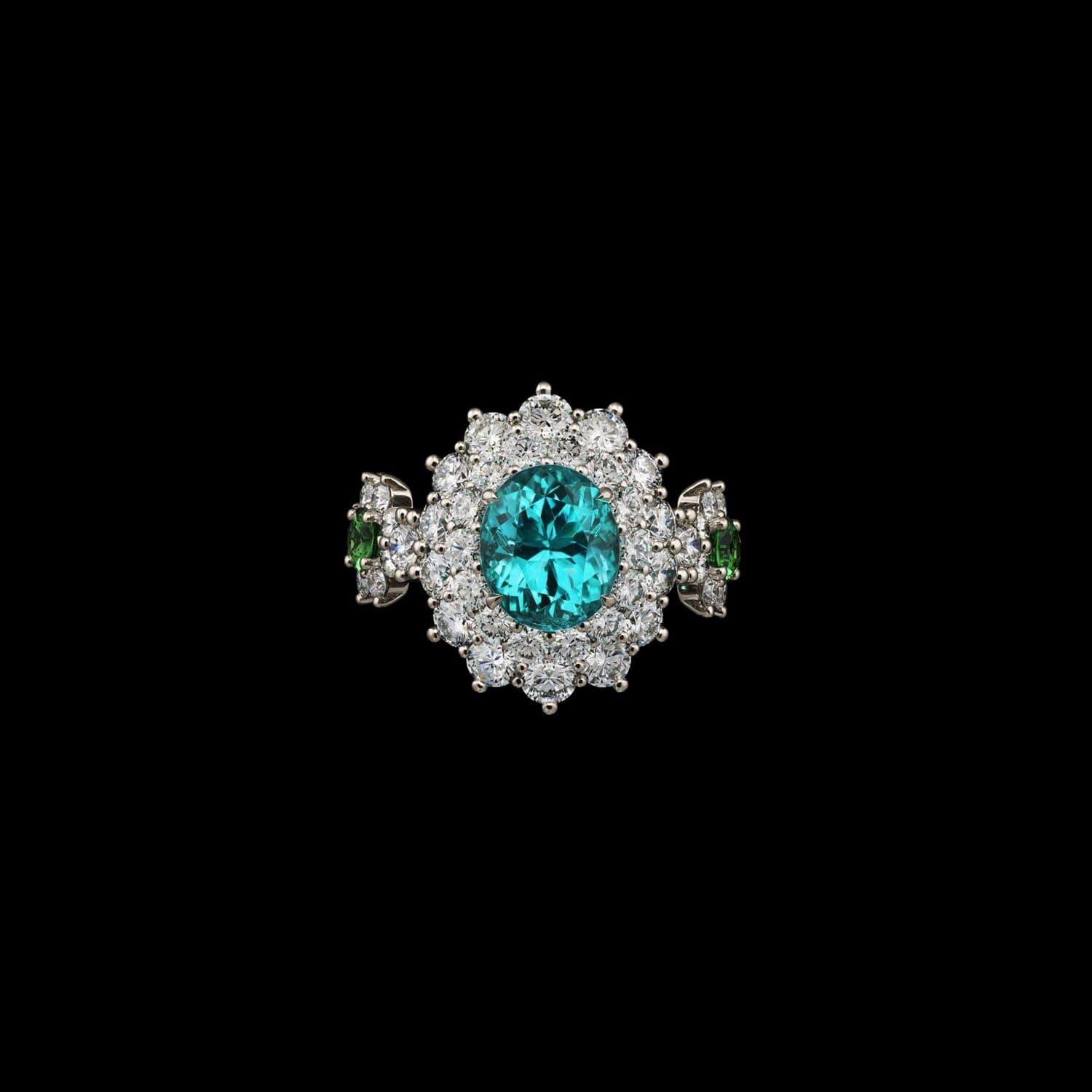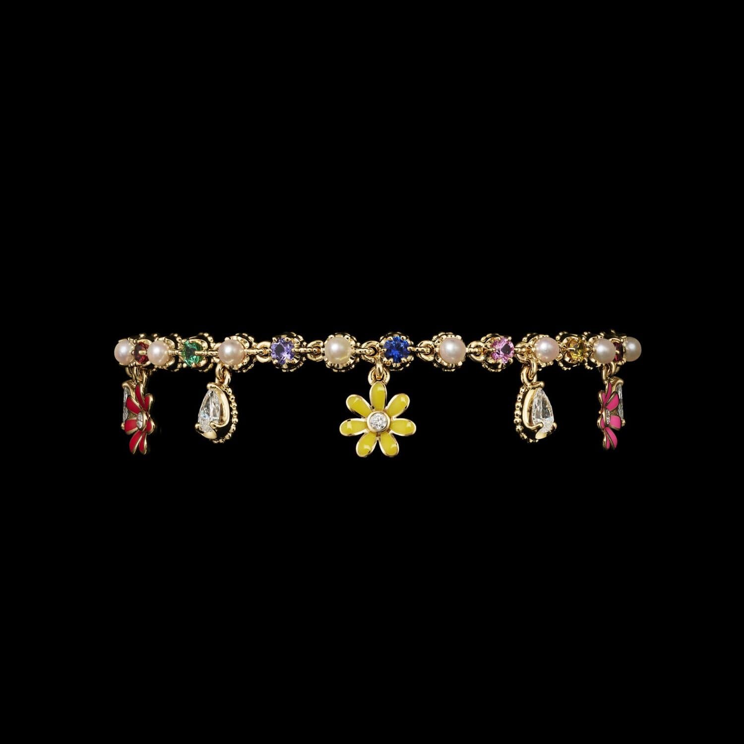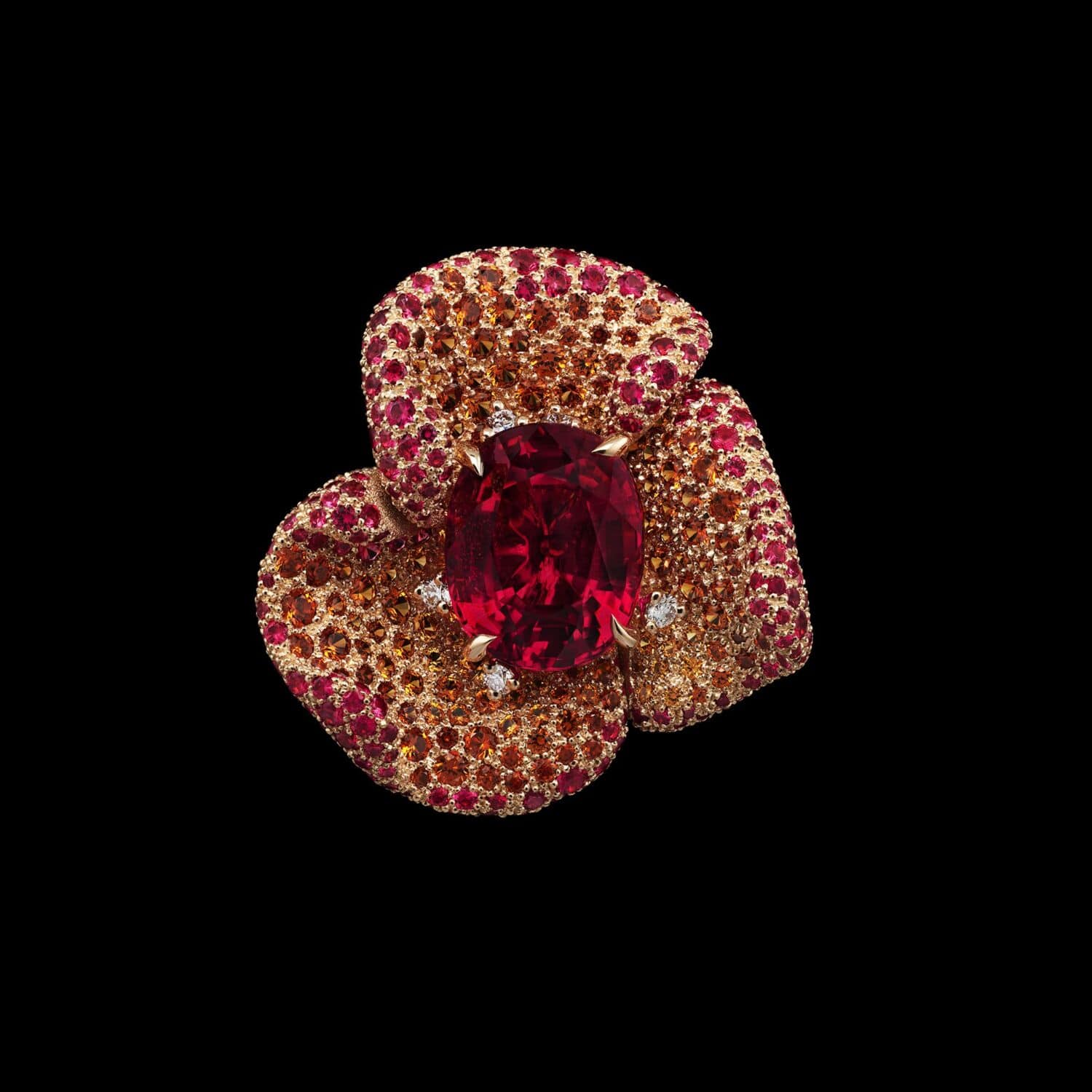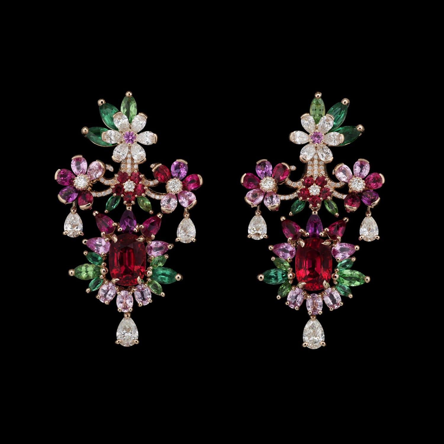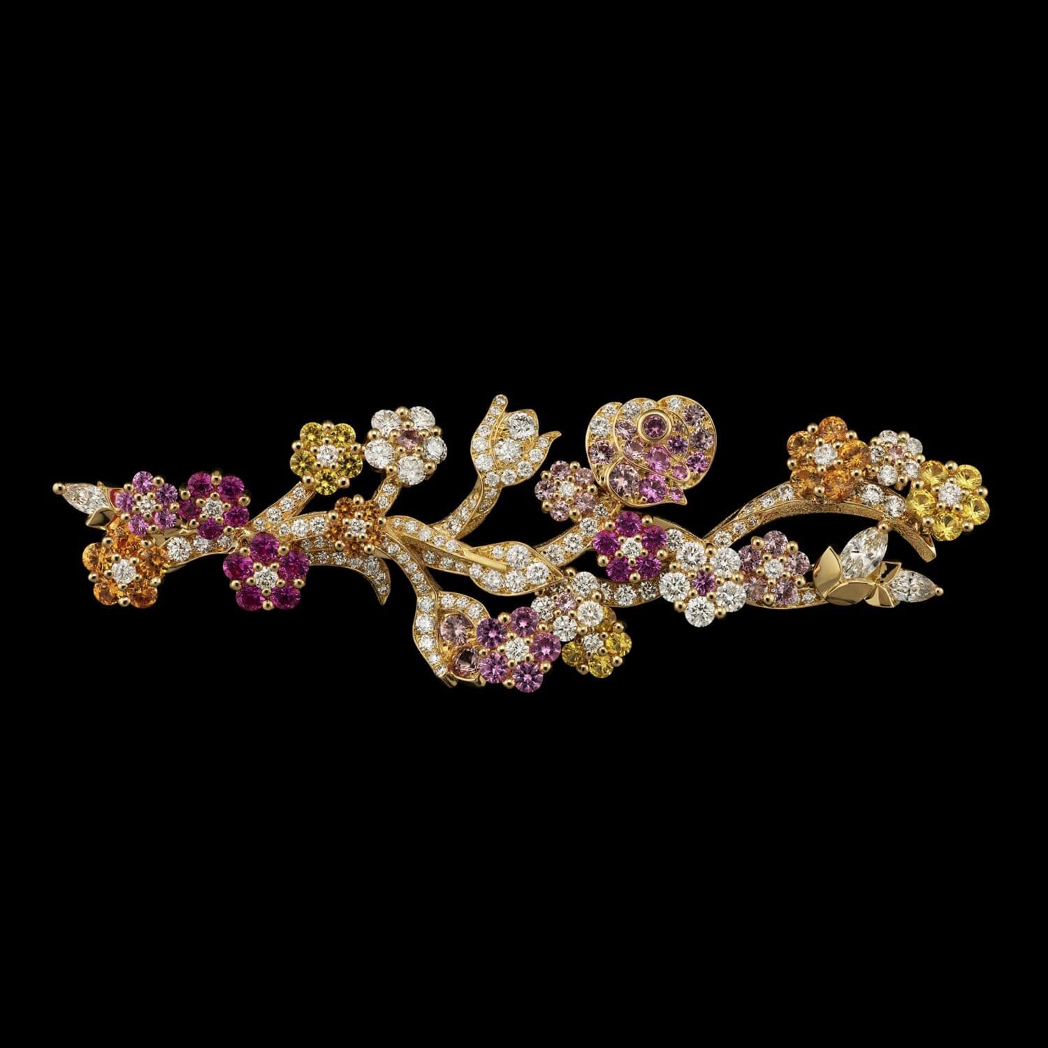 Many of the pieces are scene-like “windows,” flat, pictorial and framed in diamonds and gemstones opening successively onto tableaus of a childlike landscape, a vibrant garden or a miniature haute couture salon, offering a peek into Castellane’s dreamlike universe. Expect a wealth of brooches, necklaces, double-rings, ear cuffs, ear climbers, a tiara, a hair clip and several parures alongside show-only couture creations like belts, anklets and cufflinks, crafted to complement bespoke looks by Maria Grazia Chiuri.